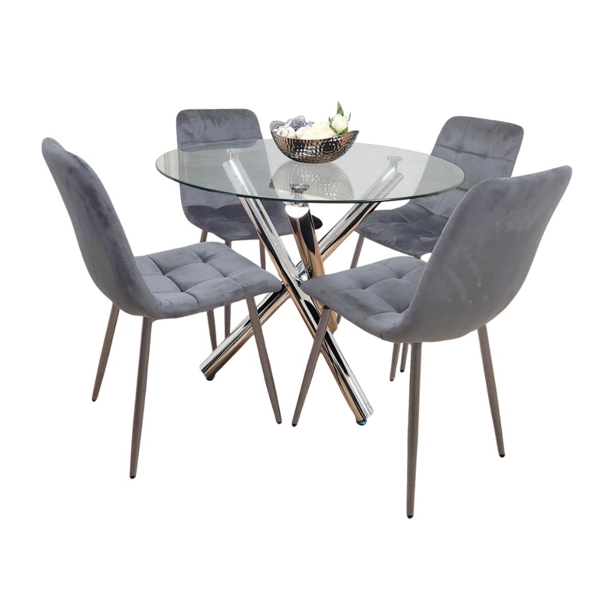 A Stunning space saver modern round glass Dining Table set includes a set of 4 tufted velvet Grey colour Rococo chairs with a slightly curved back design. The dining table colour is clear. The dining chairs' colours are Grey with a slightly curved back design to fit with body shape. The dinner table is crafted with high-quality tempered glass with strong, cylindrical chrome legs to ensure a durable, long-lasting tabletop. The dining chairs are made of premium velvet with metal chair legs. Straightforward assembly is supported by clear instructions for our dining table set.