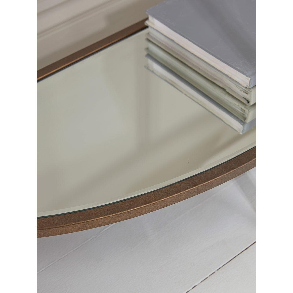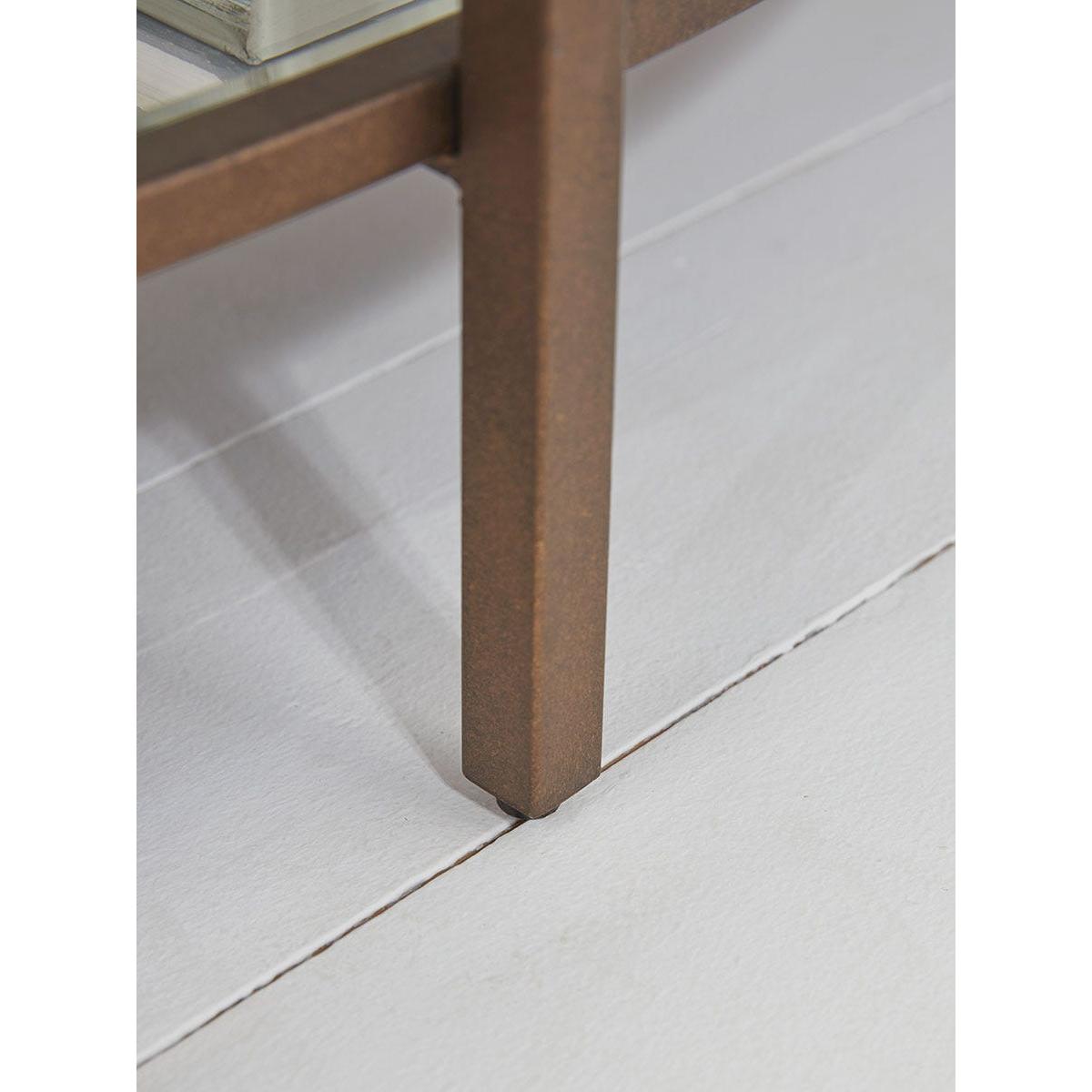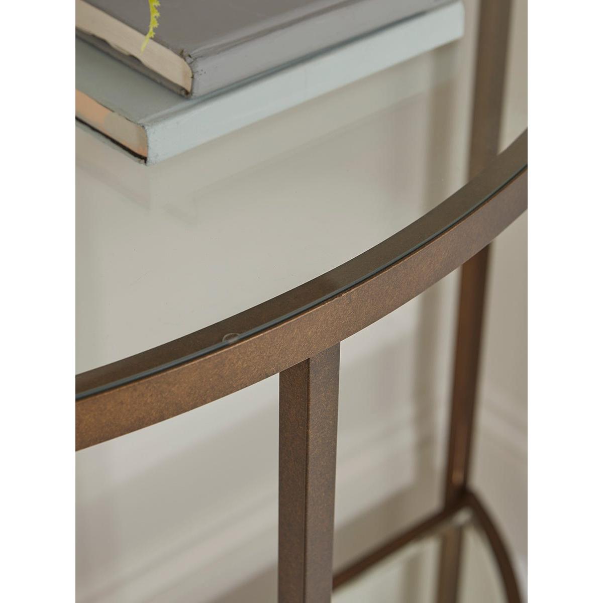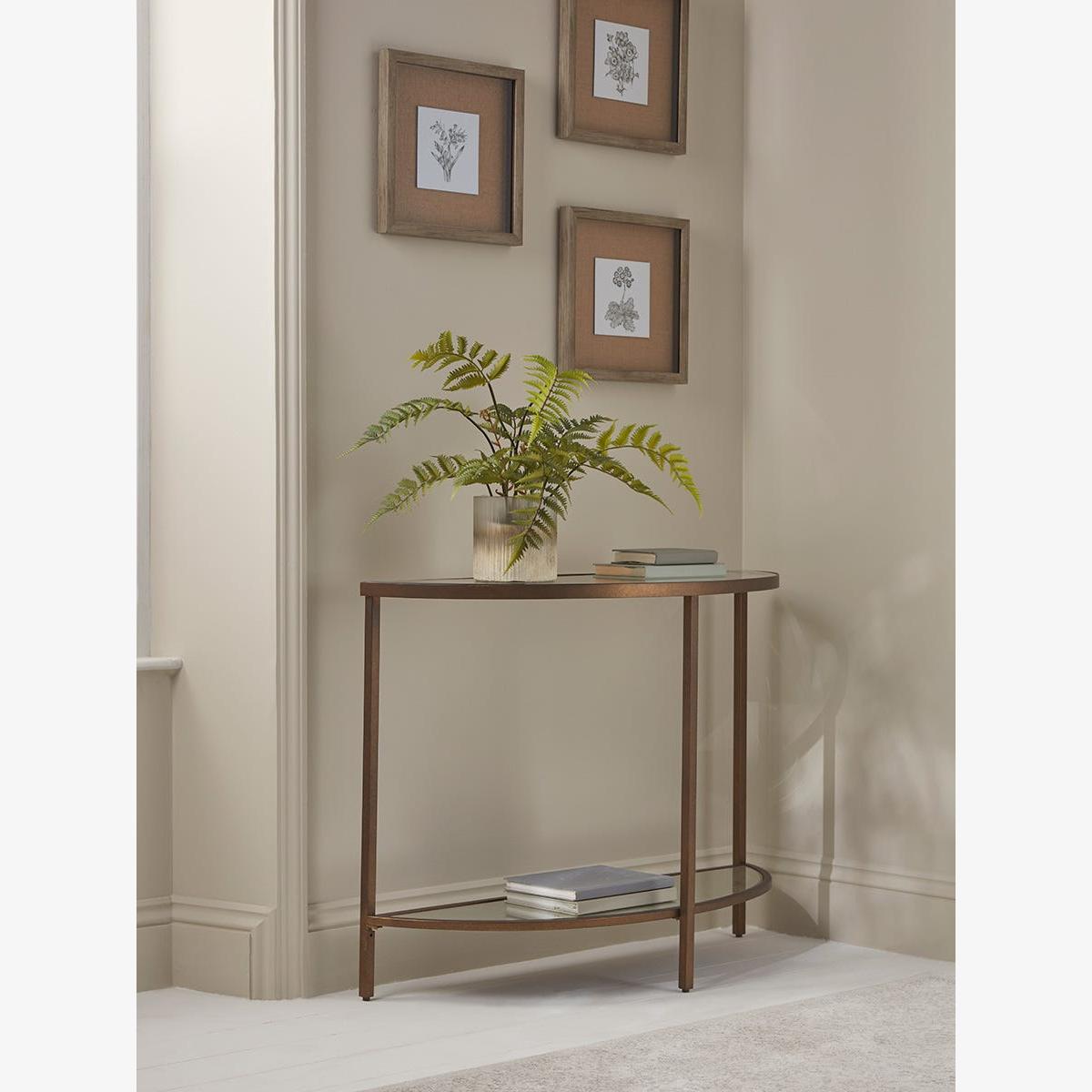 Simple elegant styling is aligned with clean lines in this contemporary console table. With a pared back metal frame in an aged bronze finish for warmth, the curved piece has a tempered glass top and shelf and will rest neatly against the wall in your hallway or living room. Its neutral presence is the perfect anchor for a statement table lamp or mirror