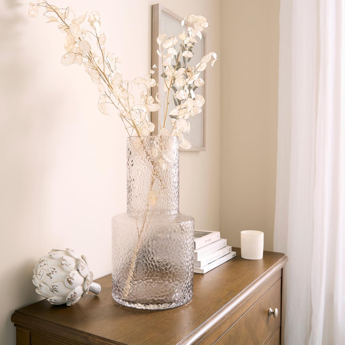 I love this smoked grey vase for its understated elegance and versatile colour hue, which complements both modern and classical interiors. Its textured surface adds visual interest without overwhelming the space. It works particularly well in neutral or monochromatic schemes, where it can act as a subtle focal point. For styling, try pairing it with minimalist dried or fresh foliage to emphasise its contemporary aesthetic, or place it on a textured surface like a marble or wooden side table for added depth. Because of its colour and texture, it’s quite adaptable, making it suitable for living rooms, hallways, or even bedrooms to bring a touch of sophistication. Just ensure it’s balanced with other decorative elements for a cohesive look.