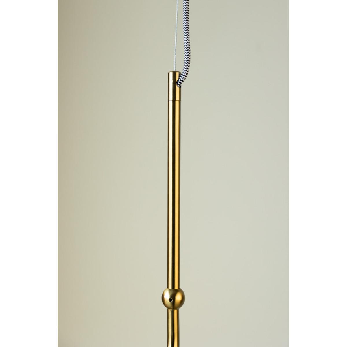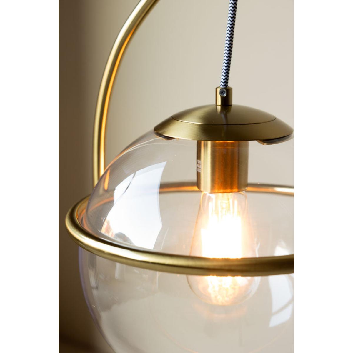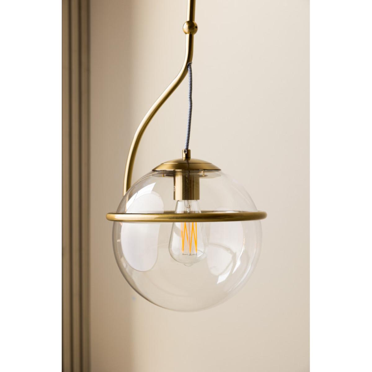 Introduce industrial glamour to your home with the Glass Globe Ceiling Light. A timeless design that looks gorgeous from every angle, this fabulous pendant light is the perfect final touch to any scheme. Elevating the classic glass ceiling light, the globe shape pairs with a monochrome striped flex and a curved brass frame that makes a statement. In addition, the clear glass shade is ideal for showing off beautiful Edison-style bulbs in warm white or amber tones. Simple, chic and effortlessly cool in any setting, this pendant ceiling light can be introduced to your home anywhere from the kitchen to your hallway or bedroom. Finding the right ceiling light for your space can be a tricky decision. However, with the perfect balance of modern glamour and vintage style, this gold ceiling light is one design decision you will never regret! - Brass & glass globe ceiling light - Measures: Dia. 26.5cm x H145cm | Minimum height (adjustable): 70cm - Requires 1 x E27 LED ONLY Max 10W GLS BULB - Suitable for installation with a dimmer switch - We recommend using an electrician to install this light in your home