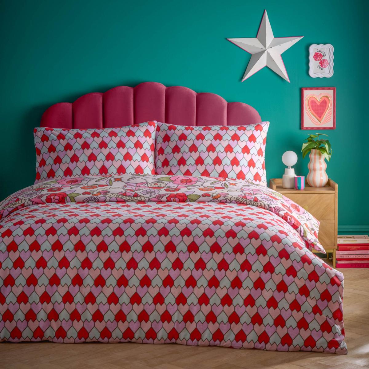 I love this bedding set for its charming, romantic vibe thanks to the heart and floral motifs, making it a great option for adding a cosy, personalised touch to a bedroom. It works particularly well in quirky, eclectic interiors or Scandinavian-inspired schemes where playful patterns and soft textures are key. For styling tips, consider pairing it with neutral or pastel accessories to let the print stand out, and add some layered throws or cushions in complementary colours for a relaxed, inviting look. Its polycotton fabric also makes it practical for everyday use-easy to wash and maintain, making it a favourite for both style and function.