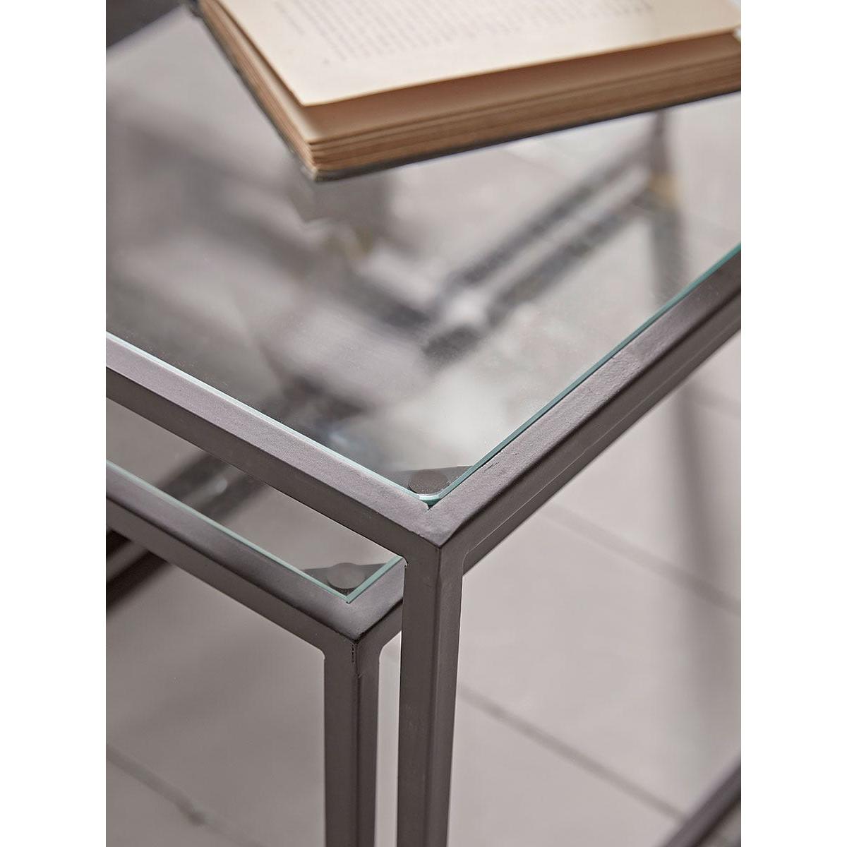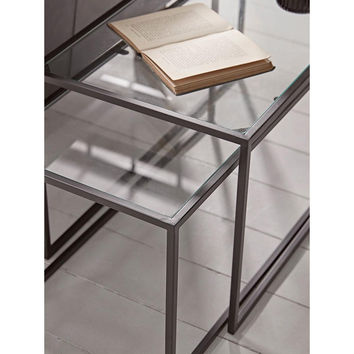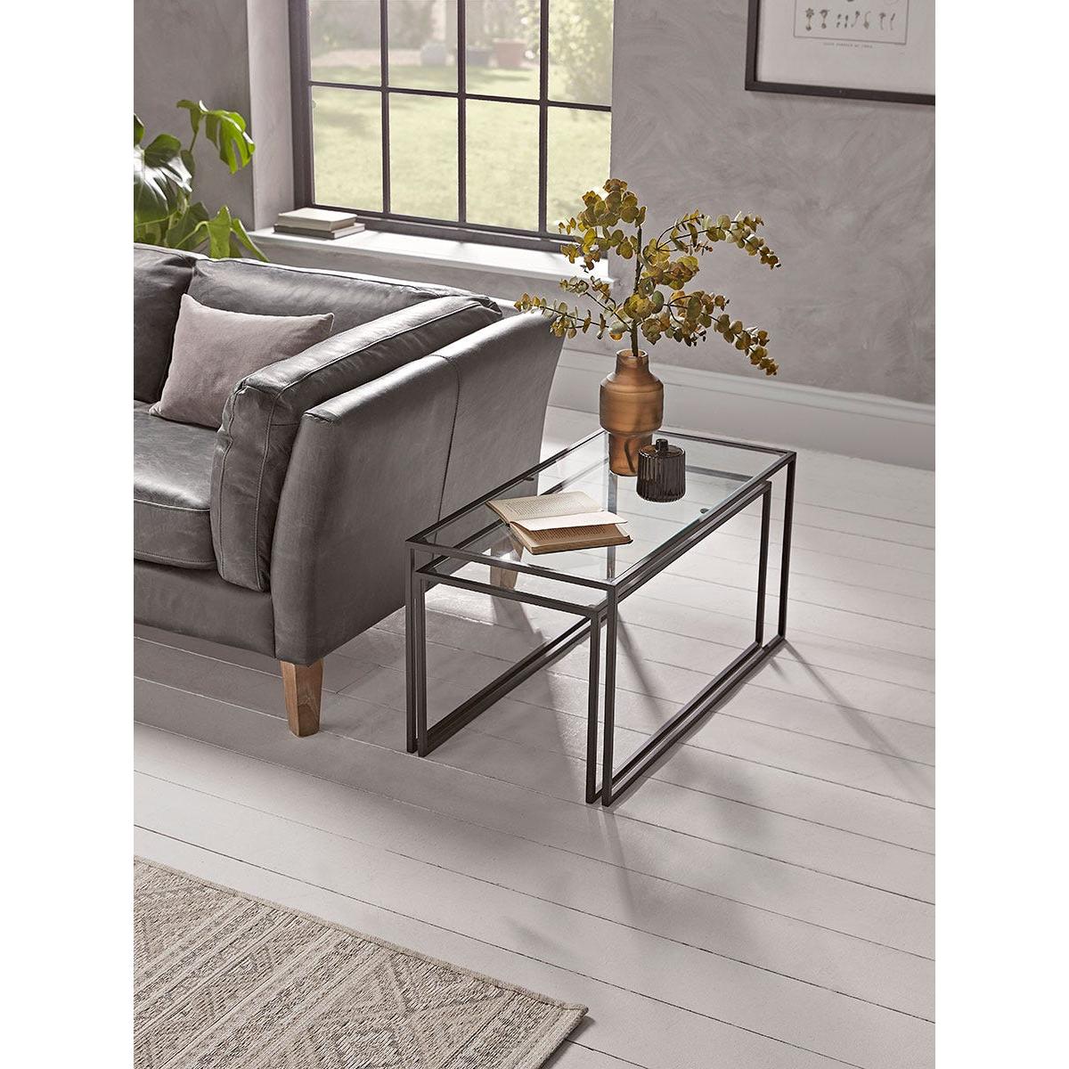 Stylish but discrete, our Glass Nesting Side Table set lends itself to industrial schemes, but also has a chameleon-like ability to blend into any setting. The pared back design includes angular black metal frames and clear glass tops. Place beside a favourite chair or sofa as a lamp table with the second table ready to pull out when needed.