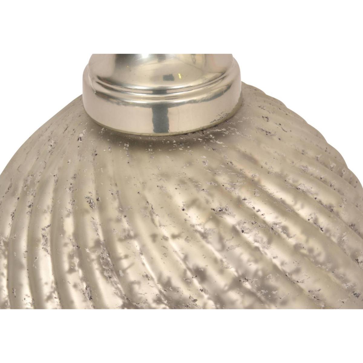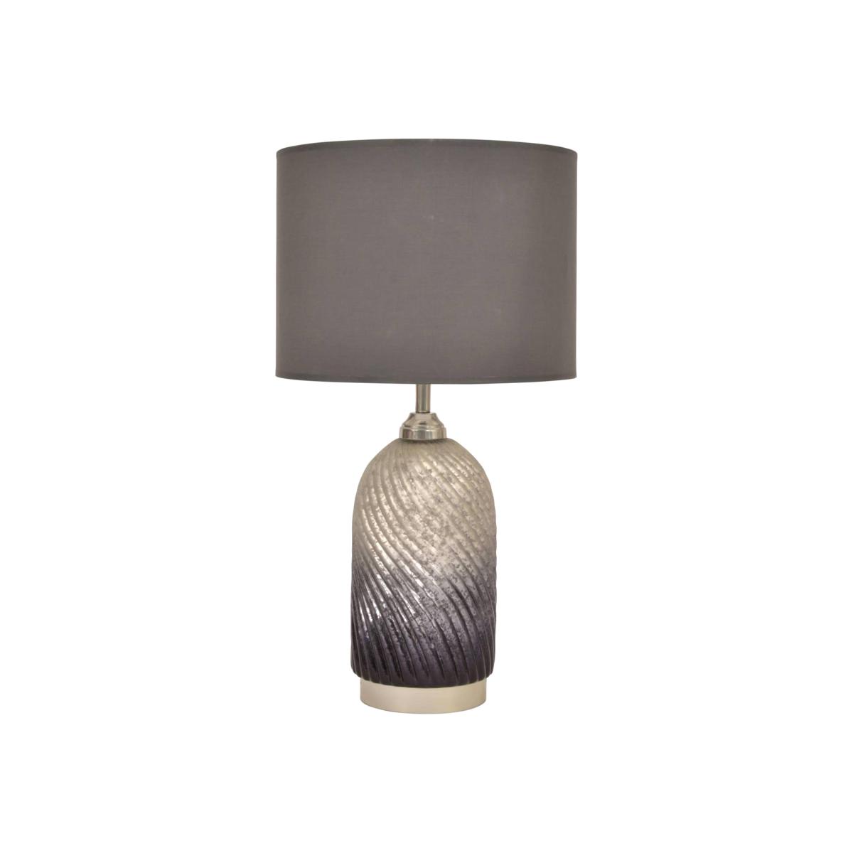 Giving every impression that its frosted glass base has been gently twisted, this beautiful table lamp showcases an on-trend ombre finish from black to metallic silver. Why you'll love it. Beautiful frosted glass table lamp with an ombre finish. Twisted texture feels natural and organic. Colour gradually changes from metallic silver to black as the glass twists upwards. Black and silver cotton shade perfectly complements the base colours. This table lamp is part of the Furniture Village accessories collection. What you need to know. Base is made of iron and glass. Requires 40W E27 bulb, not supplied. Rocker switch. 160 cm cable. Base dimensions. Height: 74 cm (30 in). Diameter: 40 cm (16 in). Shade dimensions. Height: 30 cm (12 in). Diameter: 41 cm (17 in).