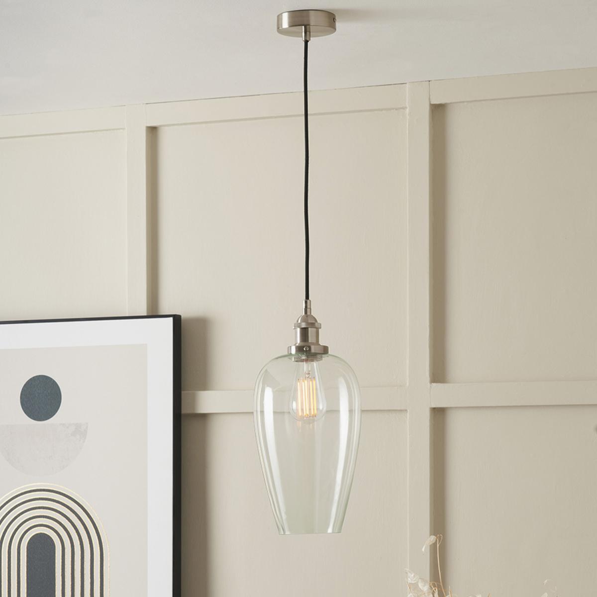 Elevate your interior with the sophisticated charm of our Clio Antique Silver Metal and Lustre Glass Pendant. This exquisite pendant light showcases a lustrous glass shade that radiates elegance, perfectly complemented by antique silver metal detailing and a sleek black fabric cable. Timeless in its design, this piece combines classic refinement with contemporary appeal, making it a versatile addition to any stylish space. Whether you're enhancing a modern interior or adding a touch of glamour to a traditional setting, this stunning pendant is a must-have for those who value luxury and enduring style in their home decor.