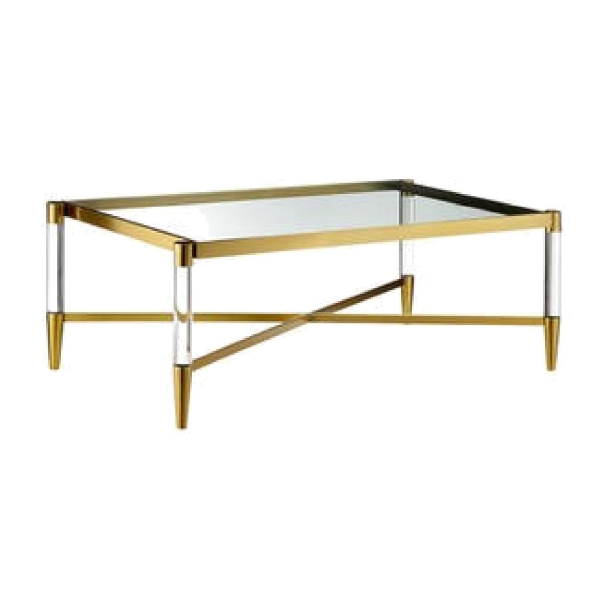 The Marissa is a luxe occasional collection - the sleek, contemporary design features polished metal frames, tempered glass tops, and acrylic legs, finished in gold.