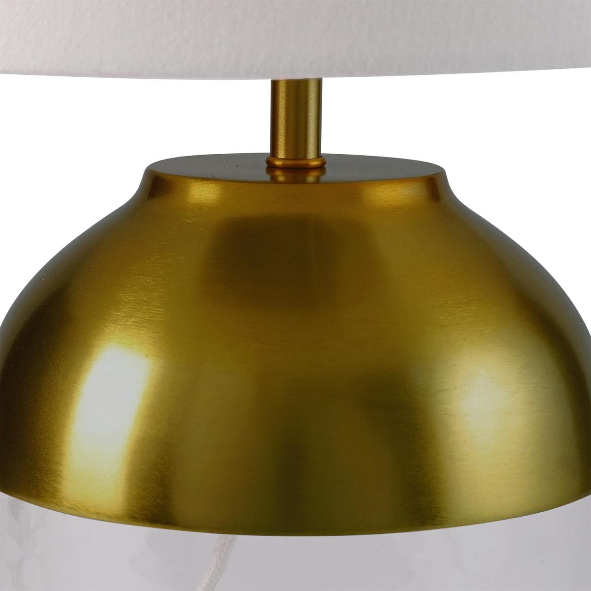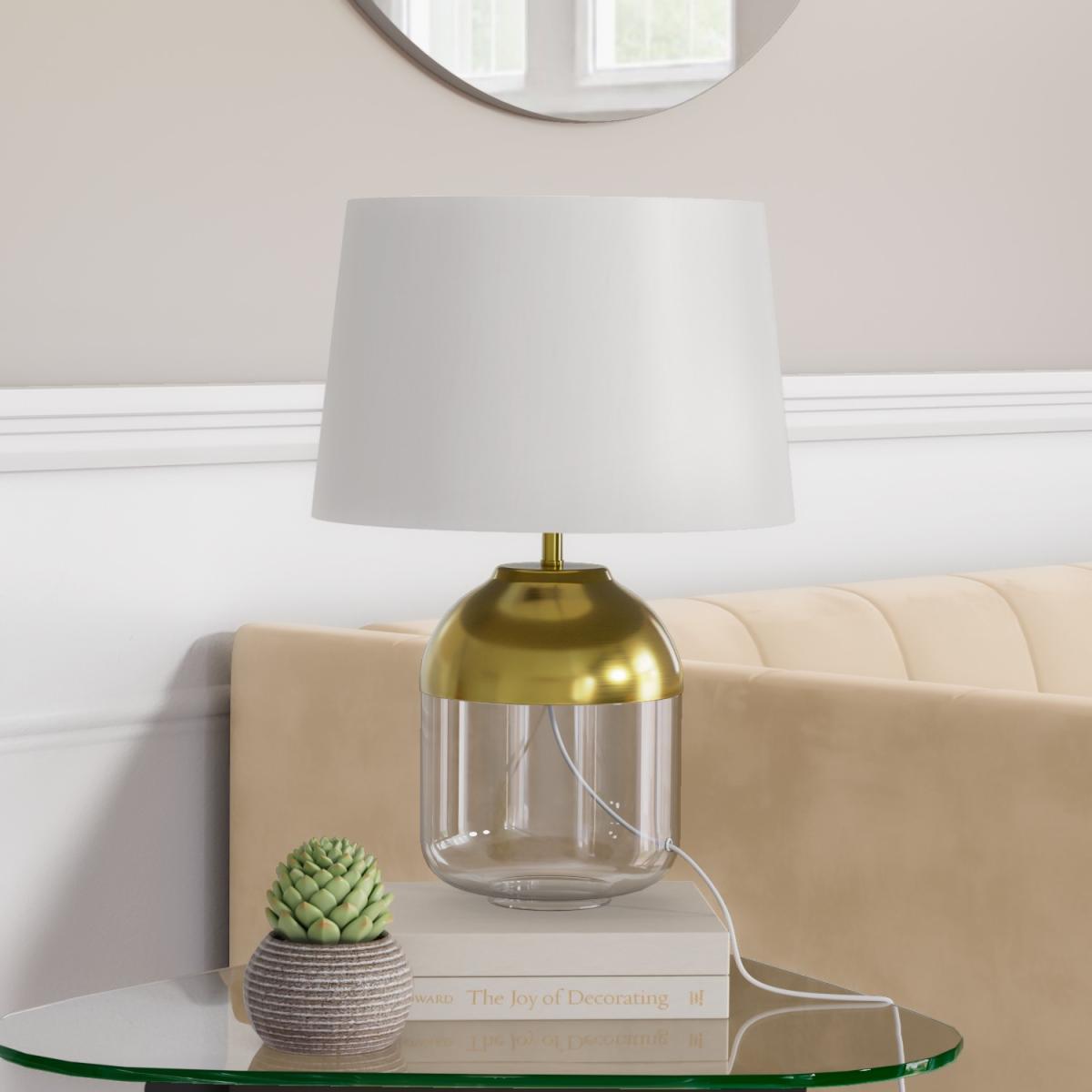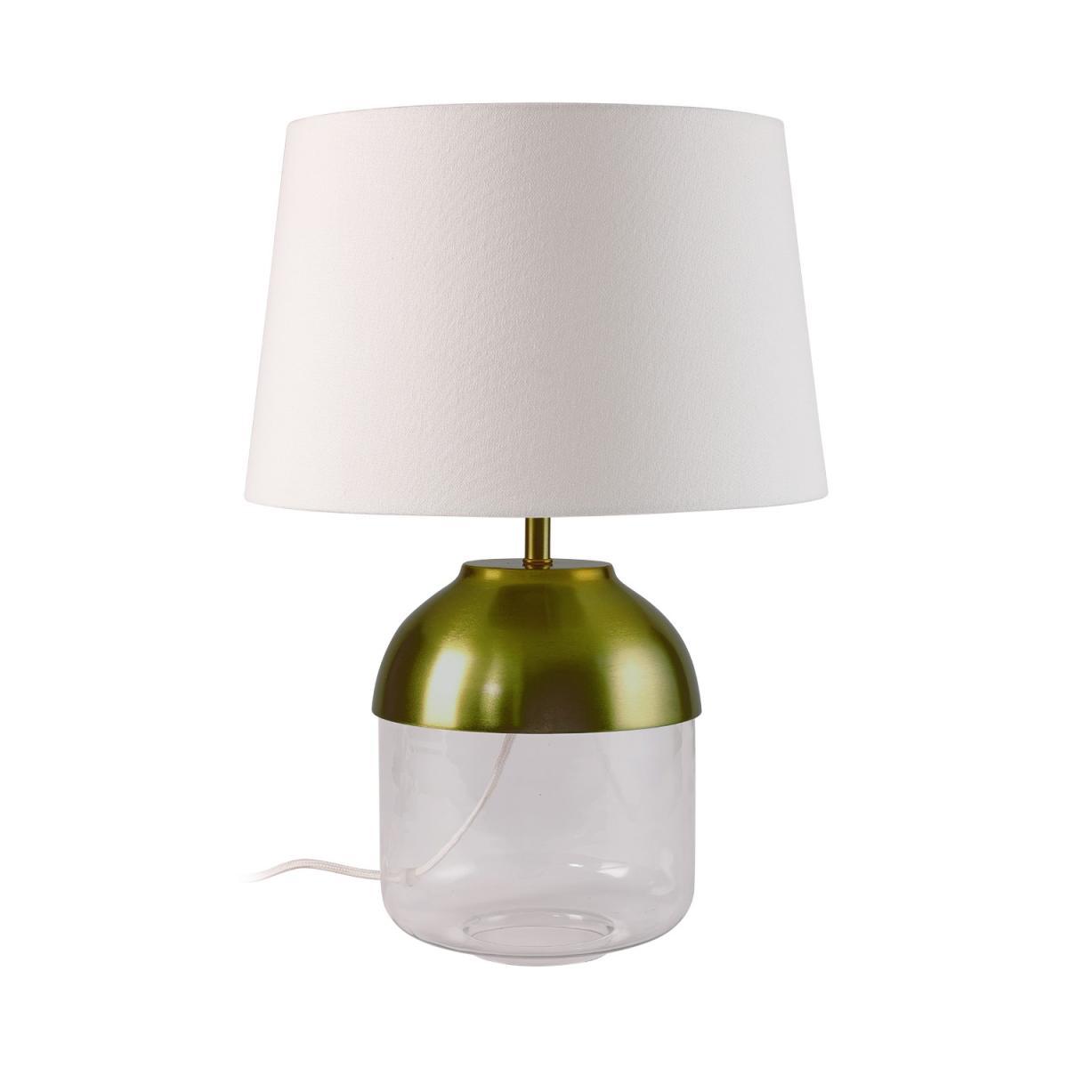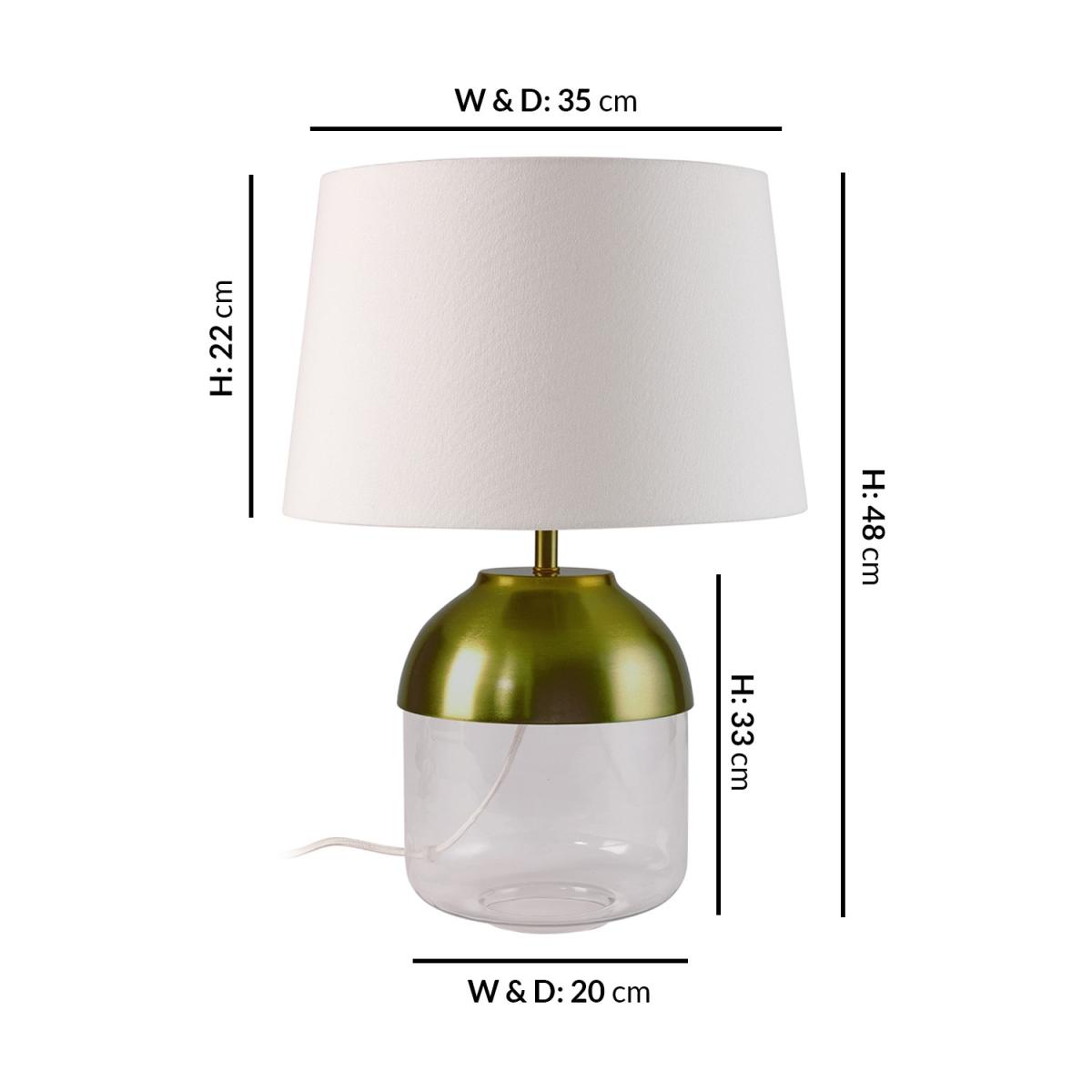 Features we love Modern glass table lamp with copper finish. Elegant design suits any living room or side tableE2. 7 and LED bulb compatible bulbs sold separately. Matching pendant light available to complete the room. Dimensions W35 x D35 x 48cm. Need to know Overall dimensions. W35 x D35 x H48 cm (with shade) H33 cm (without shade) Shade dimensions. W35.5 x D35.5 x H22 cm Base diameter. 20 cm Wire length. 150 cm Range. Heslington Style. Modern Fixture design. Table with 3 pin UK plug Switch type. Inline Number of lights. 1 Bulb type. E27 Maximum wattage. 60W Colour. Brass white and clear Finish. Brass glass fabric (shade) and braided cable Material. Glass iron and fabric LED compatible. Yes Dimmer compatible. No Bulb included. No Weight. 1.75kg Fixings supplied. Yes Assembly required. Yes Warranty. 1 year
