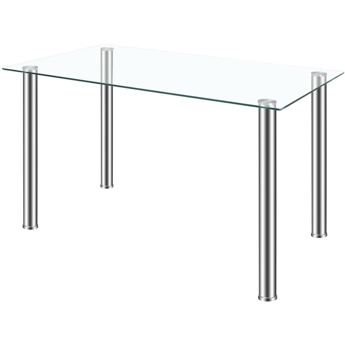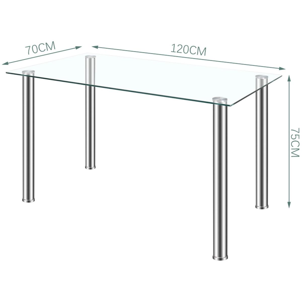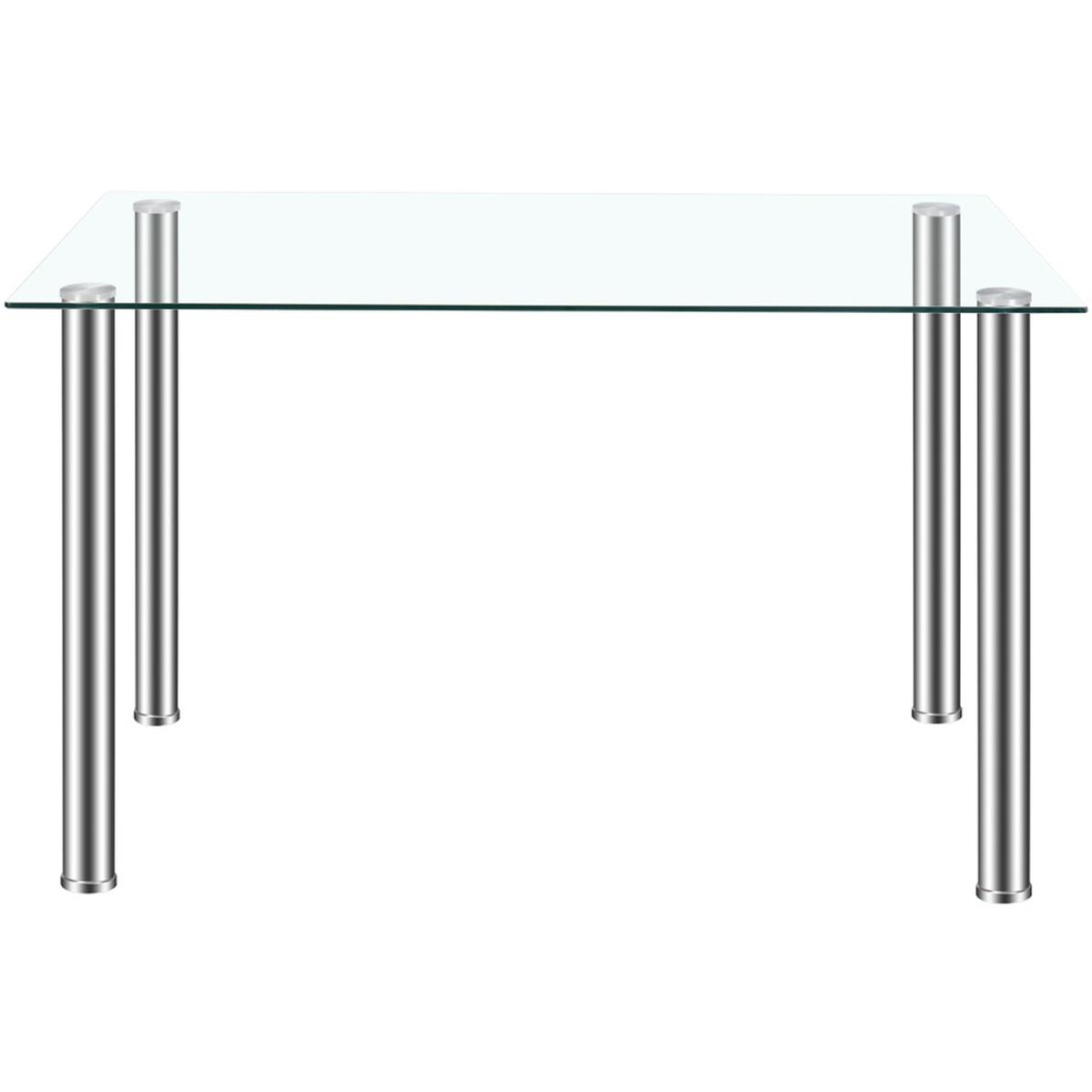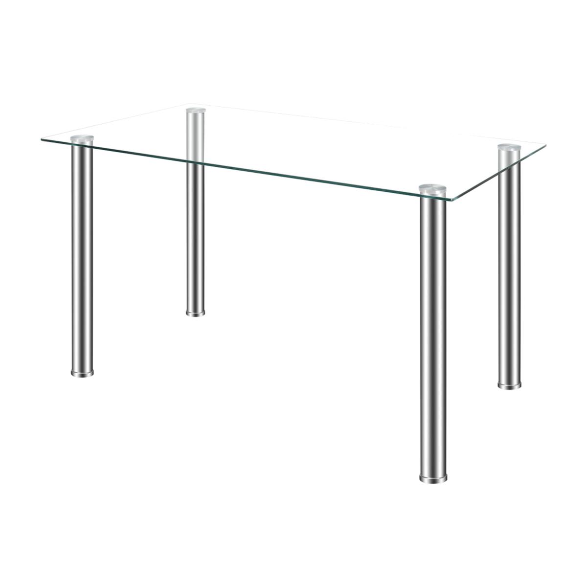 This simple and understated dining table exudes modern elegance and can accommodate up to 4 people. High-quality, thick tempered glass surface top creates an illusion of extra light and space. This dining is well supported by stable round stainless steel legs. Its clean and sturdy look adds a sense of sophistication to your room.