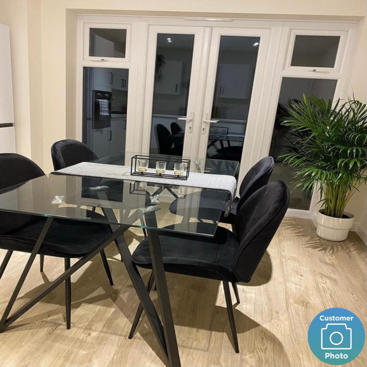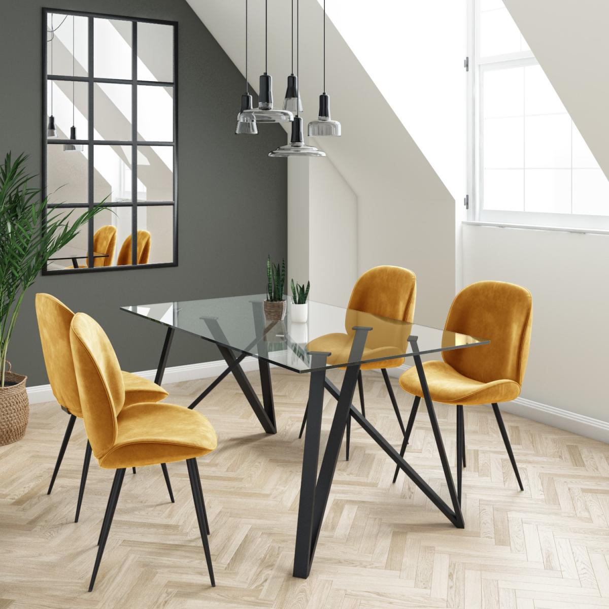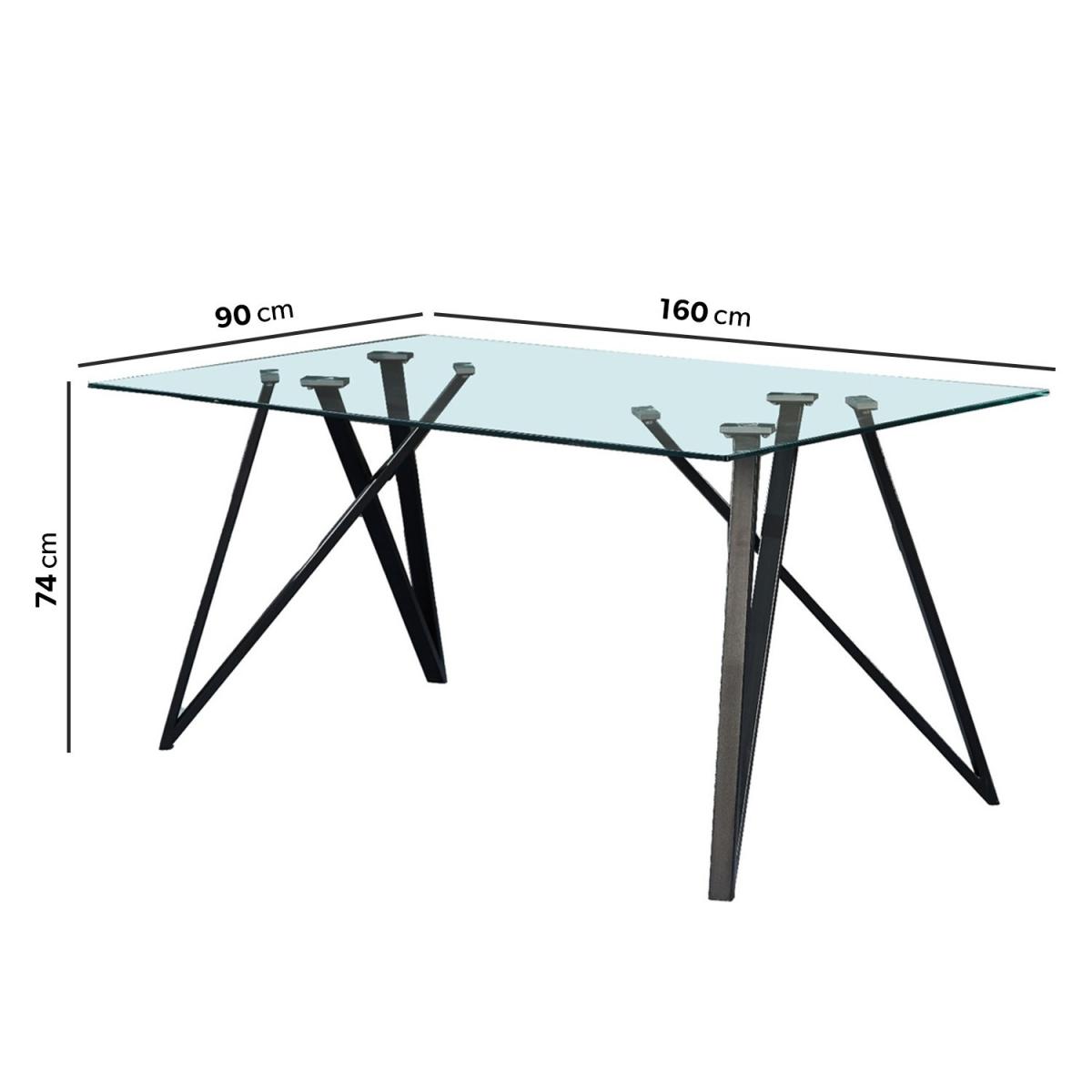 Features we love Contemporary yet industrial dining table. Tabletop is made from versatile clear tempered glass. This table is functional but still incredibly stylish. Comfortably seats up to 6 people round the table Glass tabletop makes the room feel open and bright. Need to know. Dimensions. W160 x D90 x H74 cm Package dimensions (box 1). W170 x D100 x H8.5 cm Package dimensions (box 2). W110.5 x D41.5 x H10 cm Seats. 6 Shape. Rectangular Colour. Clear Top finish. Clear tempered glass Base finish. Matte black powder-coated metal legs Material. Tempered glass and metal Weight. 43.4kg Assembly required. Yes. The glass table top is heat and scratch proof.