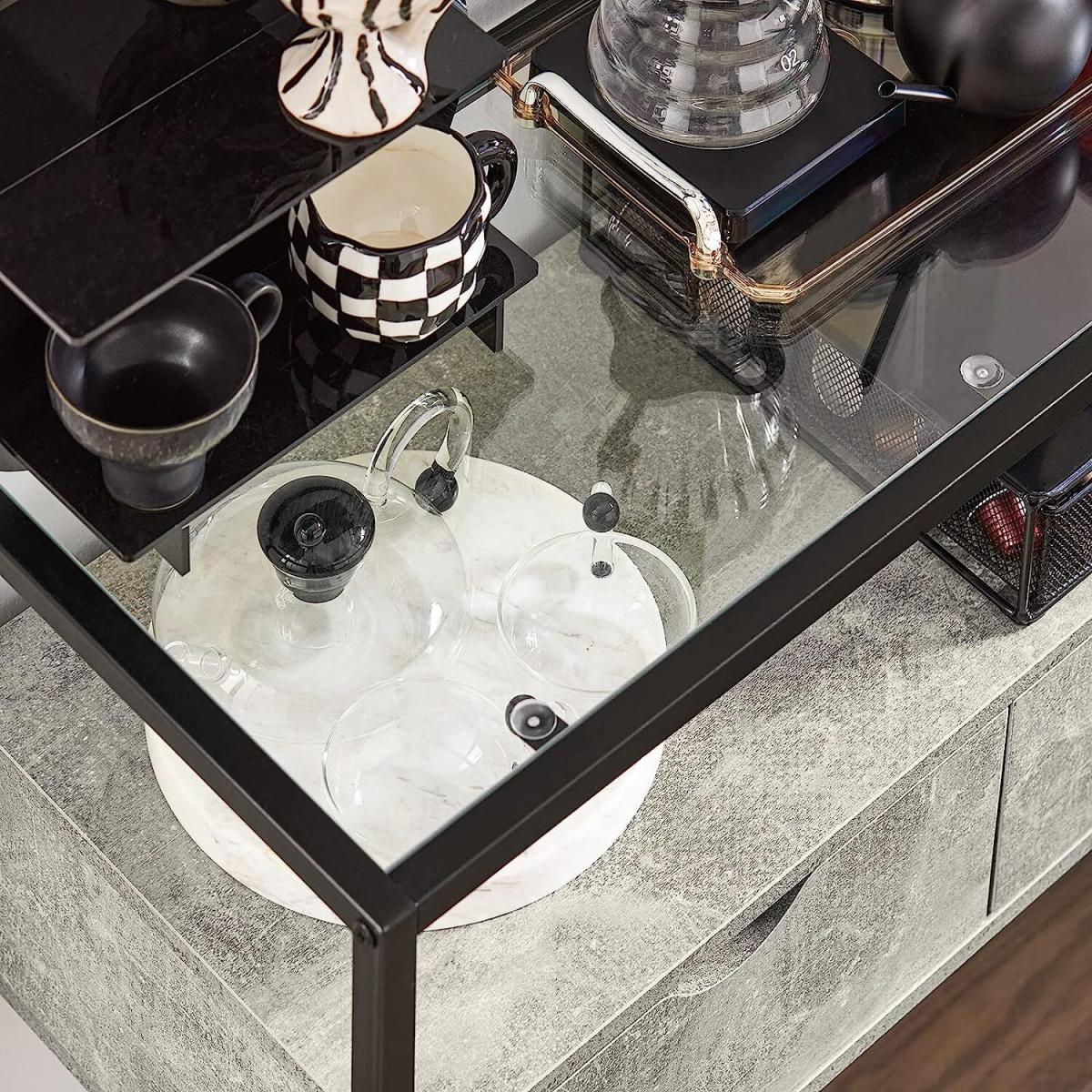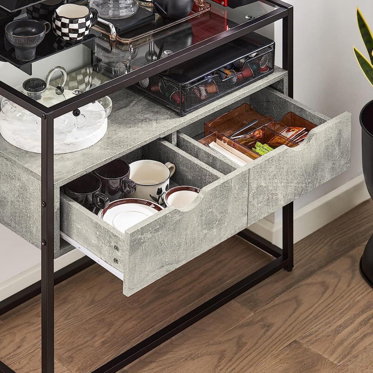 A diverse and contemporary product, would be suitable for a variety of locations, like hallway, living room and office. It features a tempered glass top, adding a stylish touch to this console table. The glass top is ideal for storing something you might need in reach, or some items you want to display.2 drawers provide ample storage space for your personal items. The open storage compartment and the space beneath the drawers offer additional storage and display space for you. Made of high quality particle board with wooden effect and black powder coated steel frame. The top is made of tempered glass. Stable and durable. It has adjustable feet under each metal leg to ensure it stay level on uneven floor. It is very multi-functional due to the slender and clean design yet practical feature. The simple lines and subtle industrial style will give a contemporary twist to the focal point of any living room.