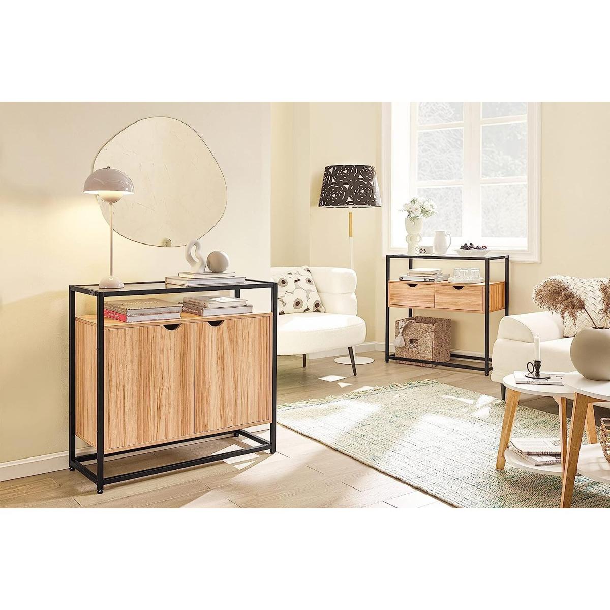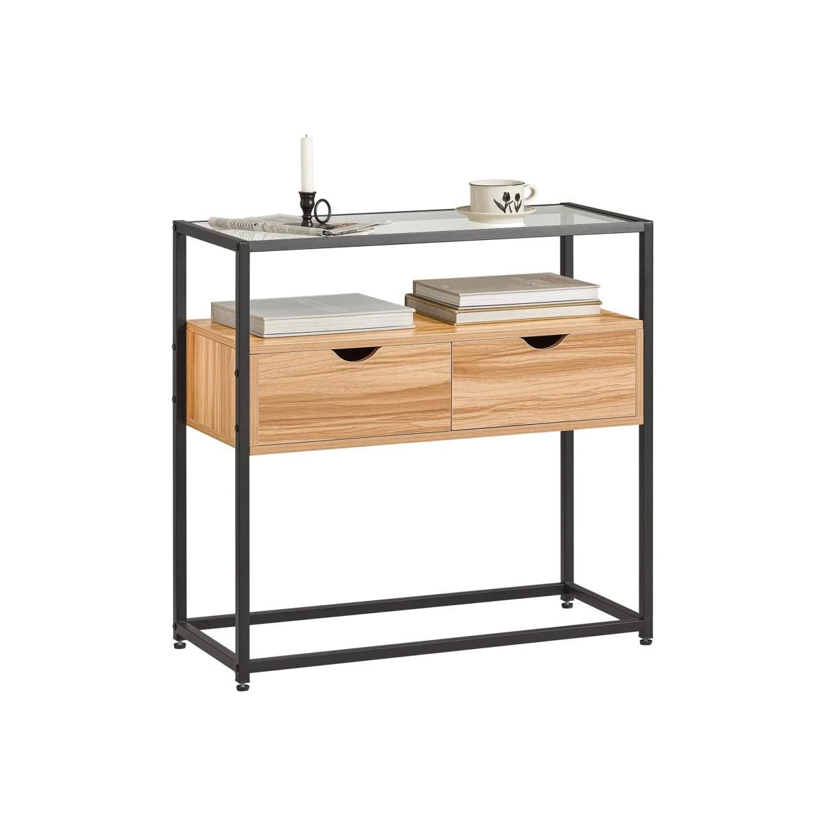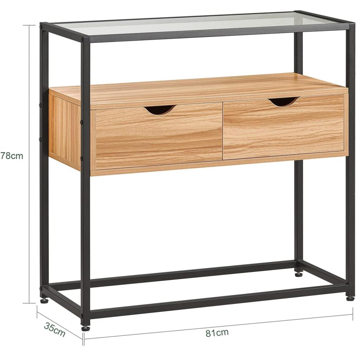 A diverse and contemporary product, would be suitable for a variety of locations, like hallway, living room and office. It features a tempered glass top, adding a stylish touch to this console table. The glass top is ideal for storing something you might need in reach, or some items you want to display.2 drawers provide ample storage space for your personal items. The open storage compartment and the space beneath the drawers offer additional storage and display space for you. Made of high quality particle board with wooden effect and black powder coated steel frame. The top is made of tempered glass. Stable and durable. It has adjustable feet under each metal leg to ensure it stay level on uneven floor. It is very multi-functional due to the slender and clean design yet practical feature. The simple lines and subtle industrial style will give a contemporary twist to the focal point of any living room.