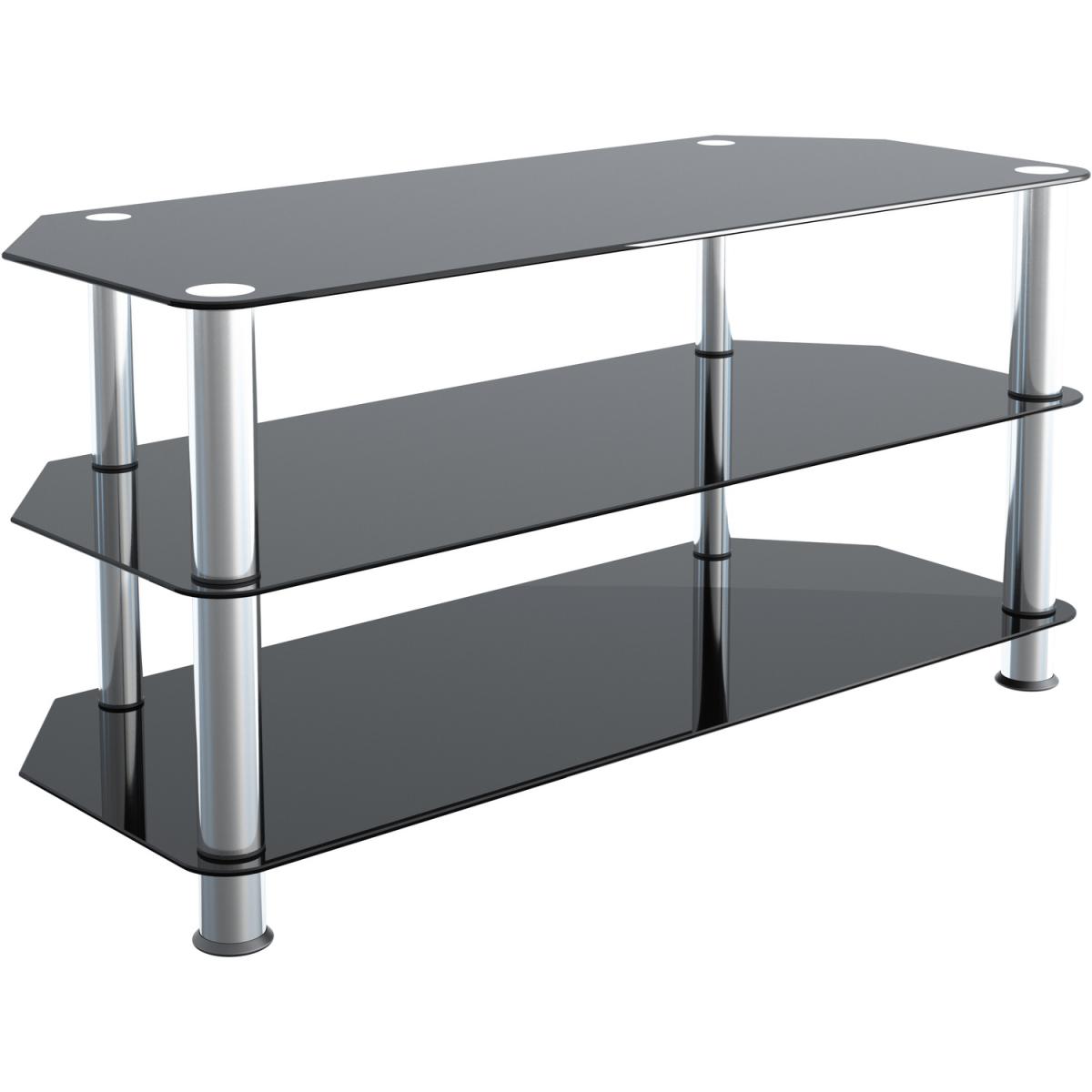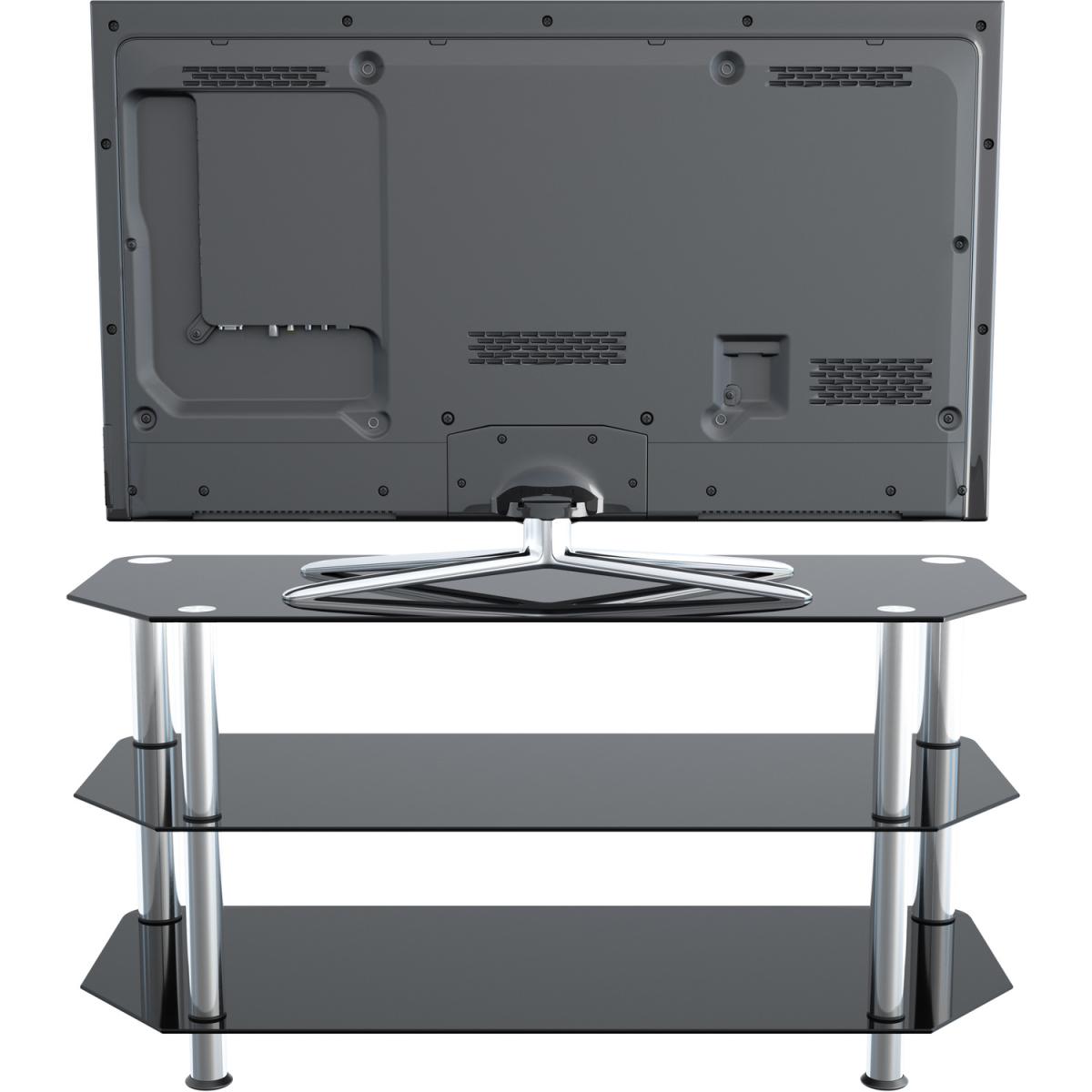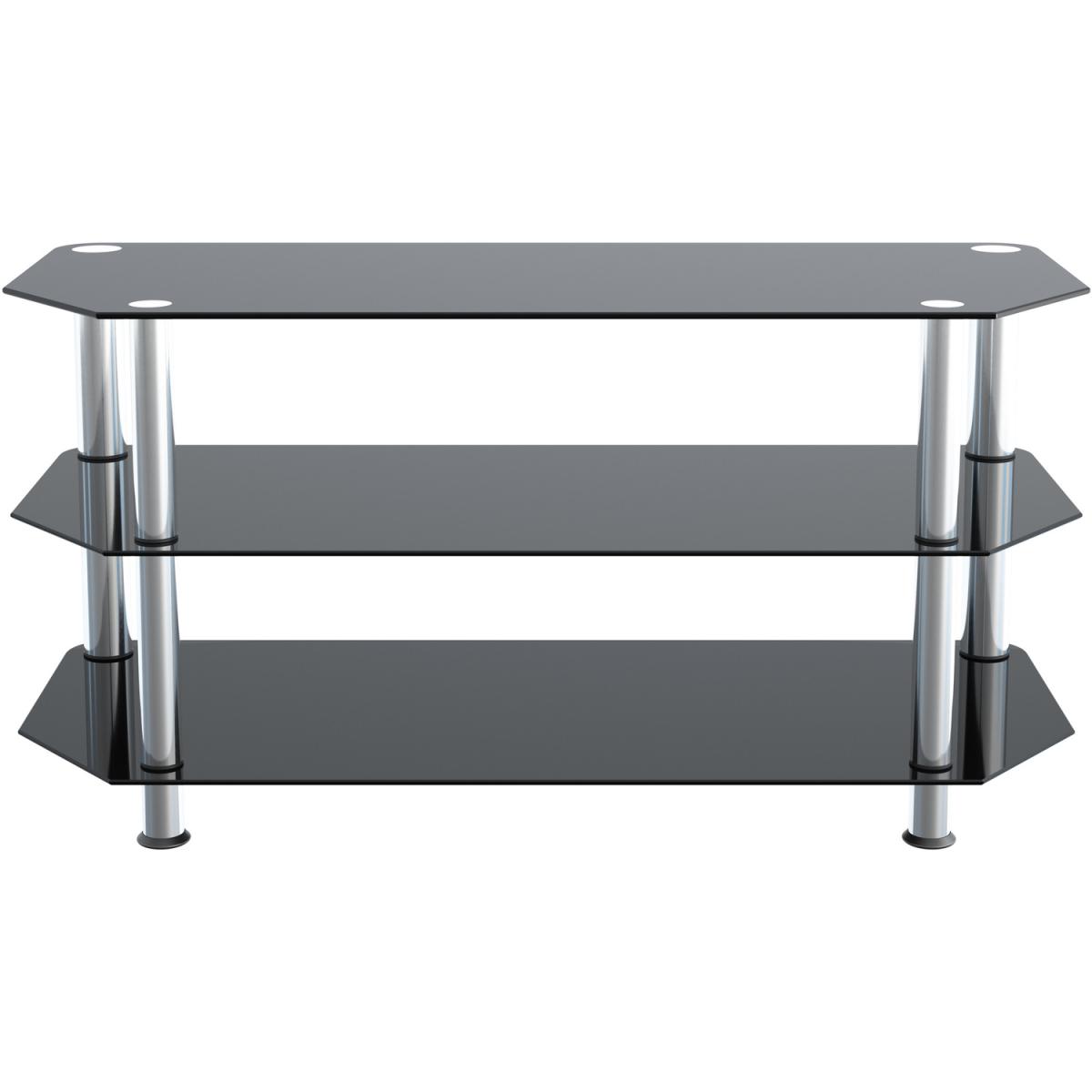A sturdy, modern home for your TV and accessories. The black tempered safety glass and durable stainless steel legs will modernize any space and can be placed against a flat wall or in the corner of a room. Your AV equipment can be organised on the lower two shelves, capable of holding up to 20kg each. Please note Maximum TV sizes are given as a recommendation only and do allow for some screen overhang, the exact dimensions of the TV's pedestal feet should be checked to ensure desired fit prior to purchase.