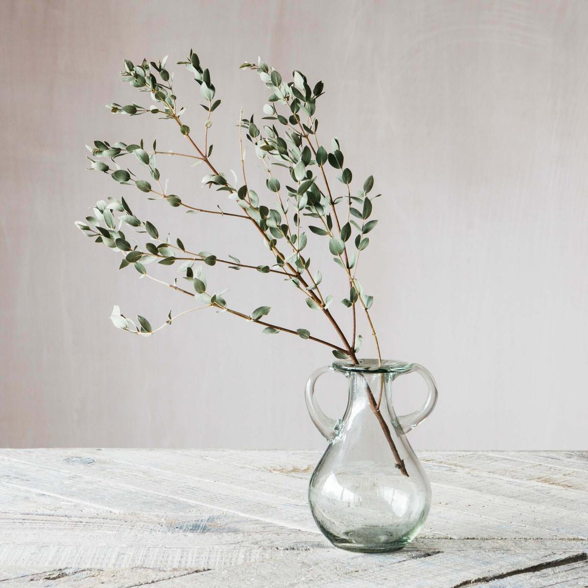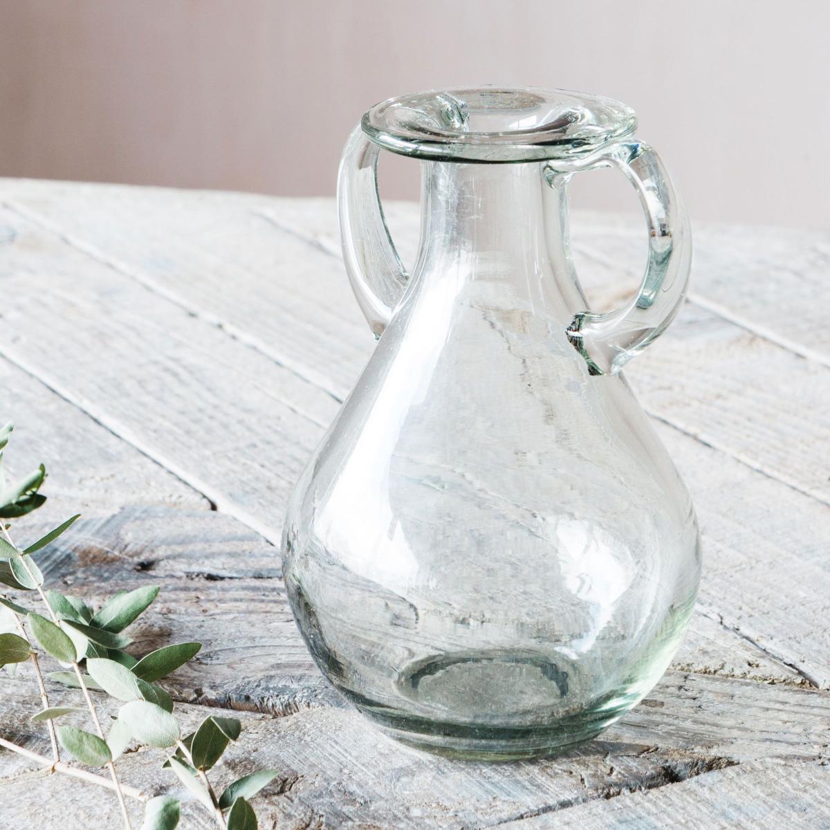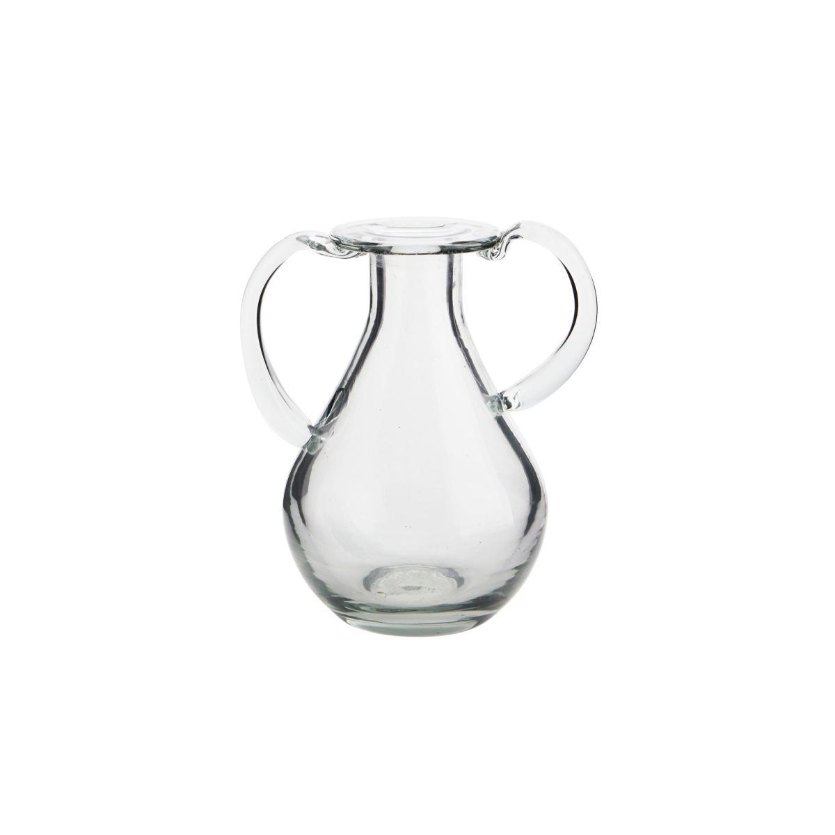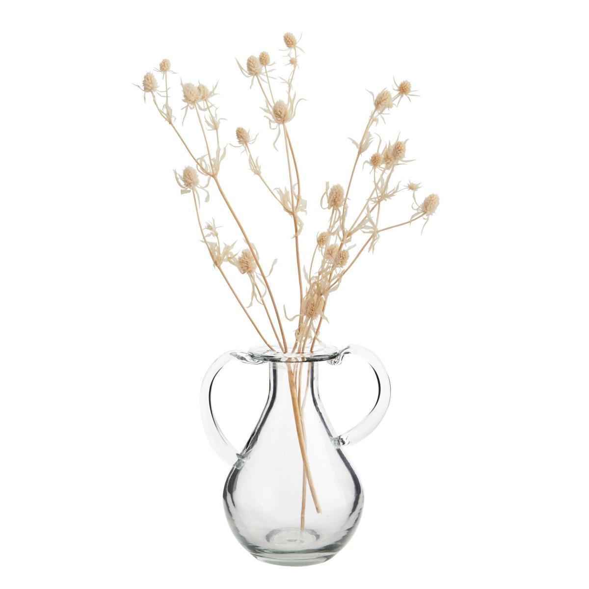 A clear glass vase with curved handles for fresh handpicked flowers or dried blossom displays.