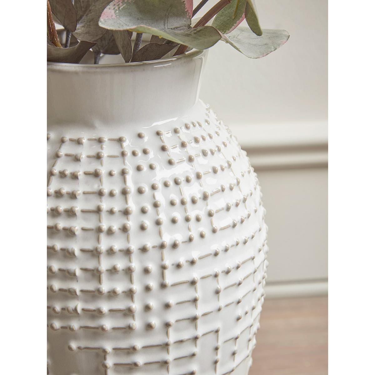 I really like this vase because of its subtle yet textured glazed finish, which adds a contemporary touch without feeling too formal. It works particularly well in neutral or muted colour schemes, making it a versatile piece that can sit comfortably in both modern and traditional interiors. For styling, I recommend using it with dried eucalyptus or soft, understated blooms to enhance its pared-back elegance. Its size and shape make it perfect for placing on sideboards, consoles, or even as a centrepiece on a dining table, where it can stand out on its own or steady a small bouquet. Keep accessories minimal around it, so its unique dotted pattern can really shine.