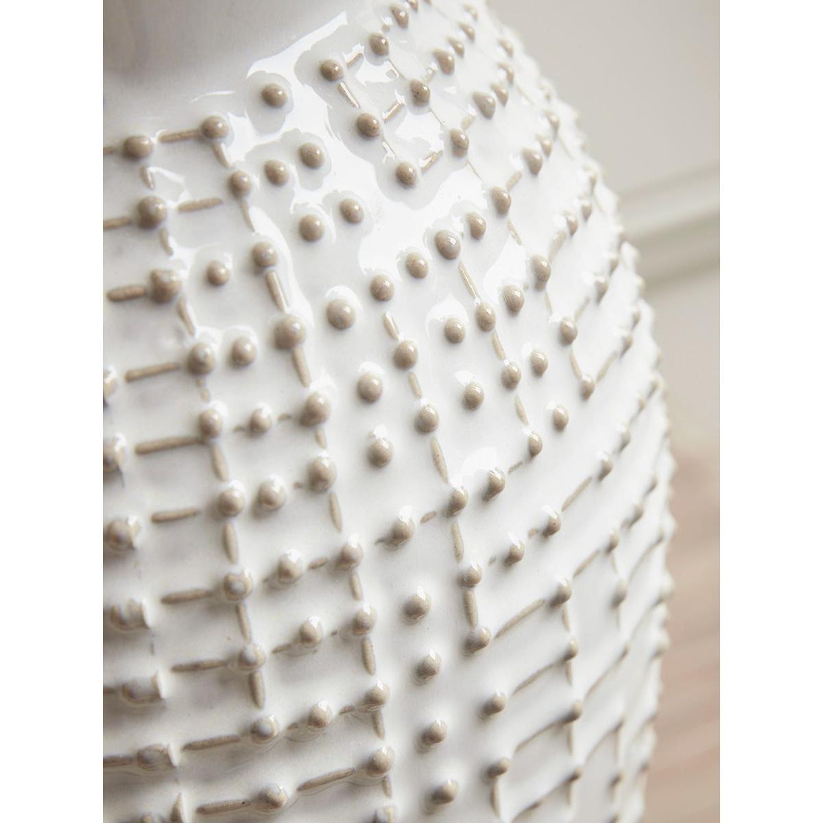 An elegant vase with a rich glossy cream glaze with a dot and dash relief pattern in a toning taupe colour that fades into a plain base. The vase has an urn like shape with a splayed lip, which is ideal for supporting tall branches and flowers.