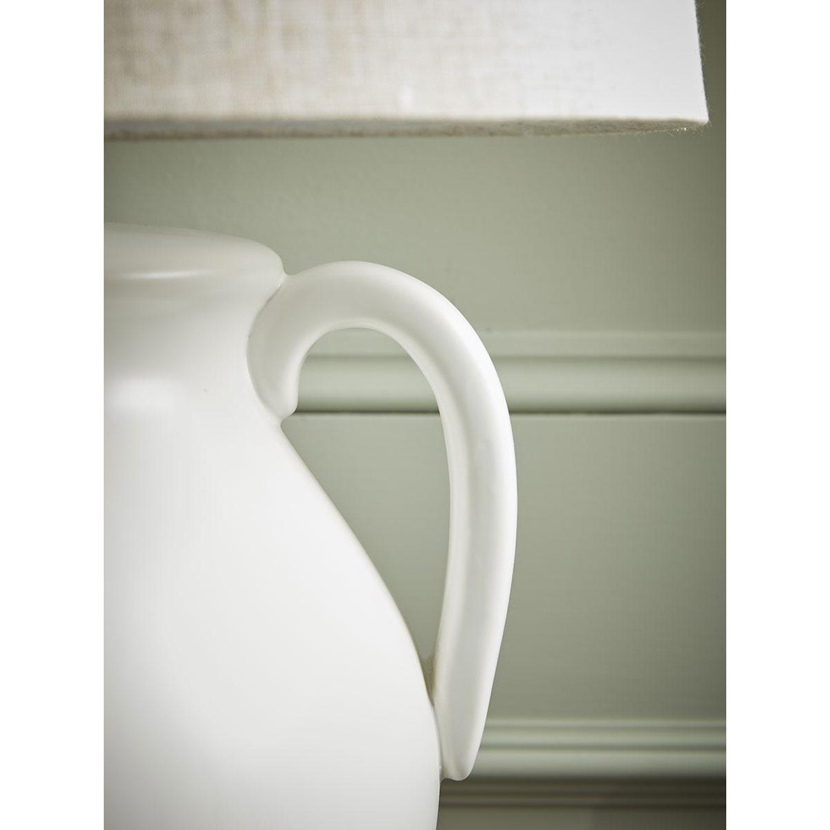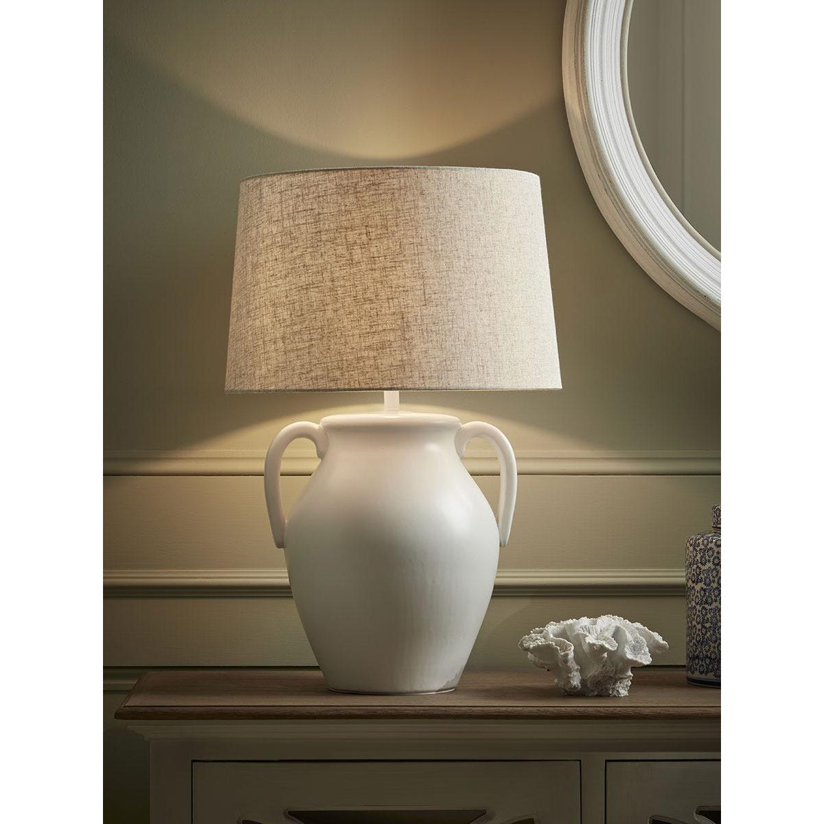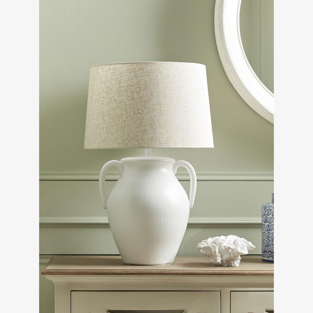 In a soft white glaze this ceramic table lamp has an urn-like base with handles to each side topped with a coordinating shade in a textured linen. Discover how to create the perfect lighting scheme for your home using our Lighting Buying Guide.