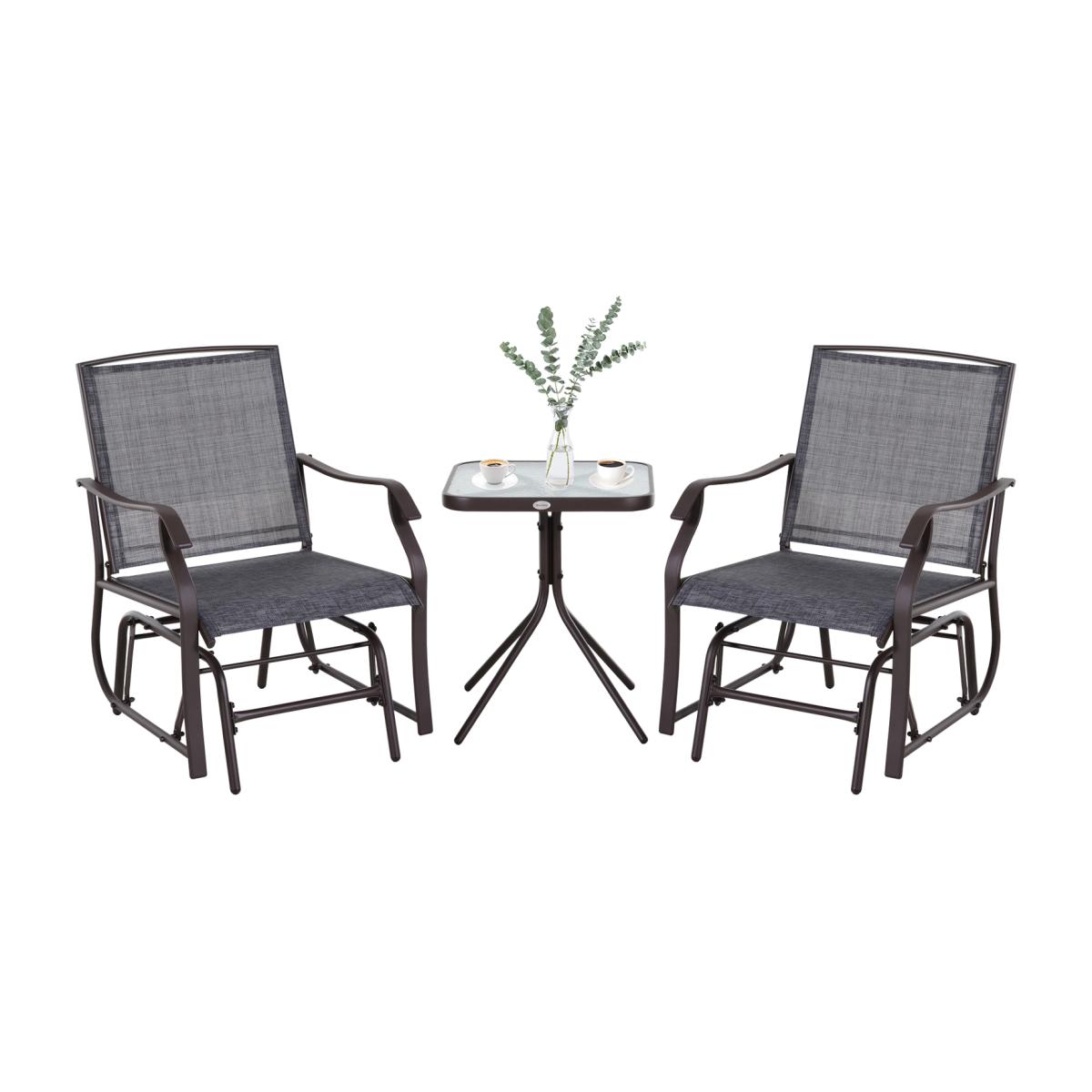 Whether you're alone or with a friend, this rocking seat set is made gliding away peacefully as the sun blissfully glistens down on you. Formed of three pieces, the set includes two chairs and a table, with each piece using powder-coated metal to form a frame that is durable and tough for use outdoors all year round. Swinging back and forth gently and smoothly on the bottom, each chair is made with an angled back, mid-rise armrests and a breathable sling fabric covering on the seats and backs to ensure you'll be sitting comfortably for all the time you are seated. Perfect for keeping drinks, food and everything else close to hand, the square table features a glass top for a sophisticated look that is easy to clean and maintain.