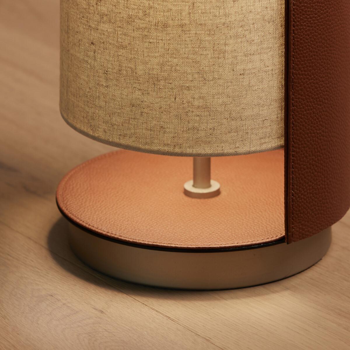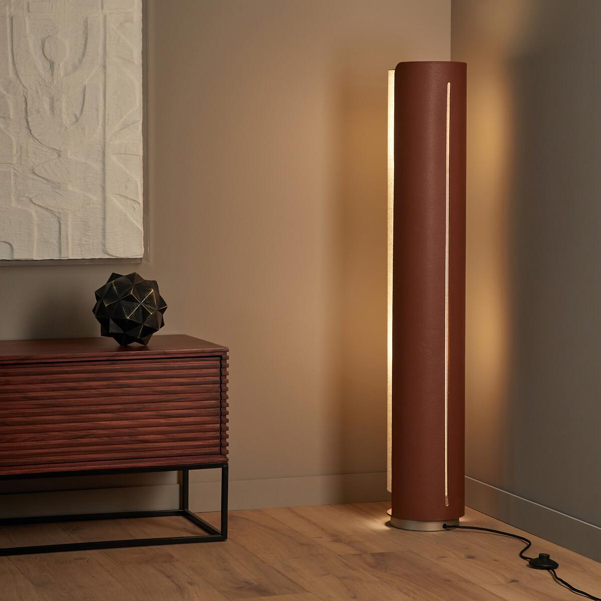 Quality grained faux leather, linen lampshade, slender tubular design... the Glipie floor lamp diffuses subdued lighting in a living room. Elegant, Glipie provides a soft and warm ambient light. Compact in size, Glipie takes up little space and works especially well in small spaces. Sophisticated details: a slit of light underlines the back of the lamp. A signature design by AMPM.Product Details • Grained imitation leather structure • Pure linen lampshade and diffuser • 2 E27 sockets for LED 5W max (not supplied)Dimensions • Diameter: 19cm • Height: 120cm. Dimensions and weight of parcel • 1 parcel • L24 x H24 x D33.5cm, 1.9kg