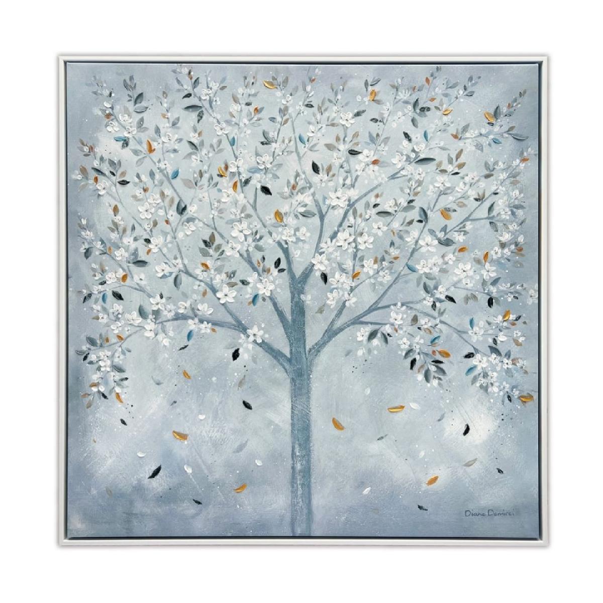 Framed canvas wall art by Diane Demirci, paired with a slim white frame and hand-painted embellishments. This elegant artwork by Diane Demirci features a serene, monochromatic scene depicting a tree in gentle bloom. Hand-painted embellishments bring texture and depth to the piece, with delicate white flowers and a scattering of orange and grey leaves adding contrast and depth. Set in a slim white frame, Glistening Leaves combines subtle colour with soft, organic forms, making it a calming and sophisticated addition to contemporary interiors. Its hand-finished details catch the light beautifully, offering a touch of understated magic.