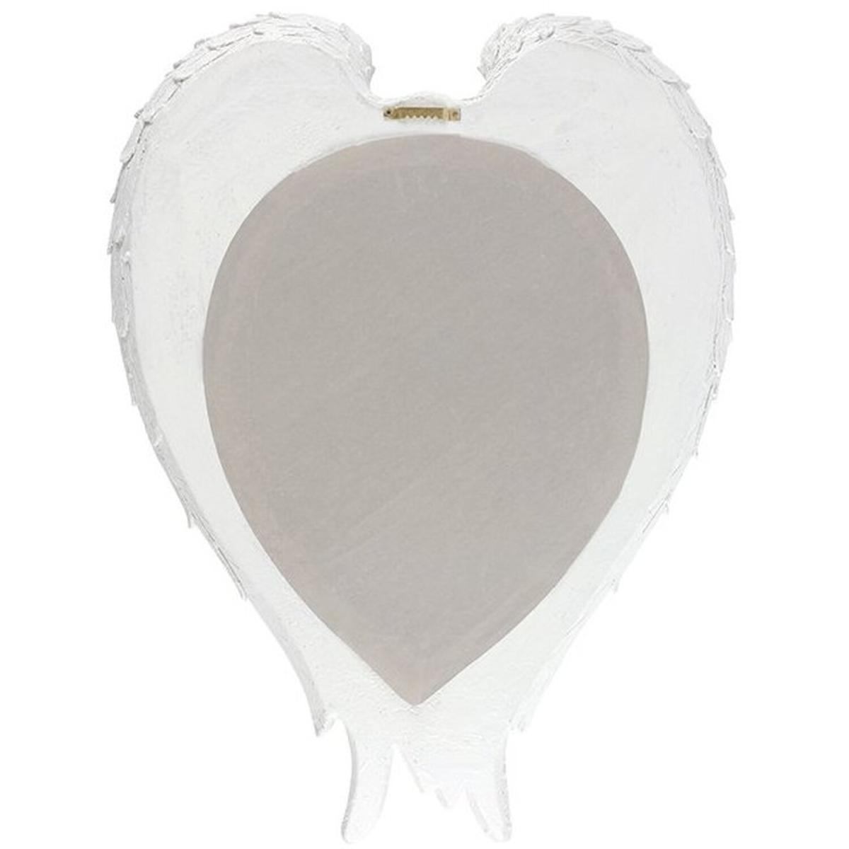 A stunning and impactful angel wing wall mirror. The mirror is nestled between two large angel wings, finished in white and accented with glitter to add sparkle to the elegant and eye-catching design.