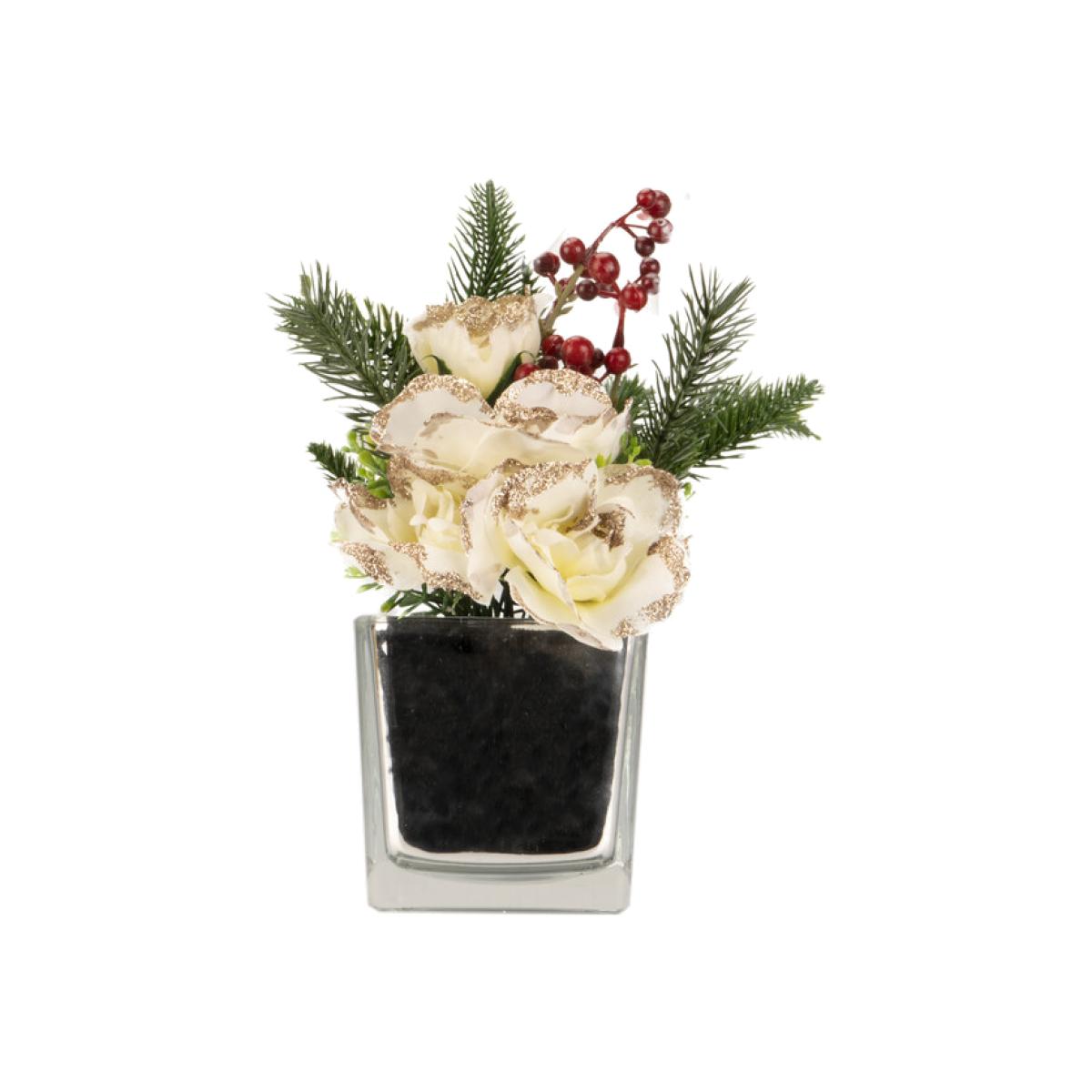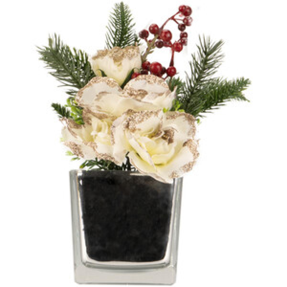 Perfect for adding a beautiful festive feel to your space, this Glitter Berry Rose in Mirrored Pot makes a wonderful addition to your space. Featuring realistic faux roses, berries, and evergreen sprigs, this gorgeous arrangement is finished with a loving sprinkle of gold glitter to add to the warm, wintry charm. Perfect for adding a pop of colour to your coffee table, mantelpiece, or bedside table, you're sure to love the way this pot elevates your space.