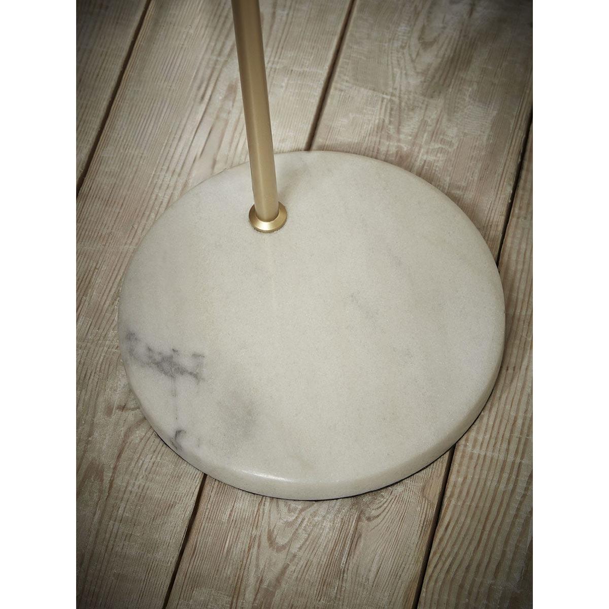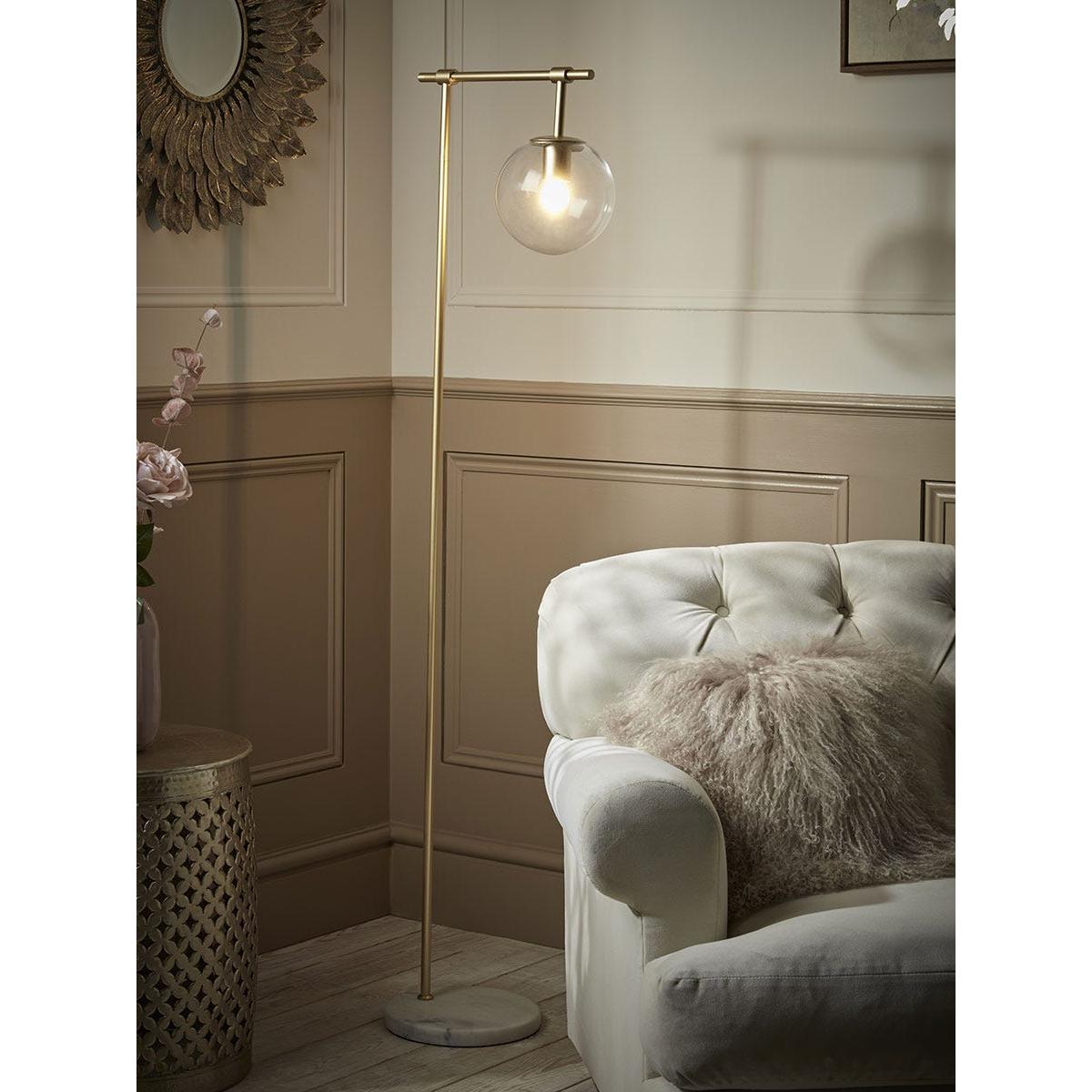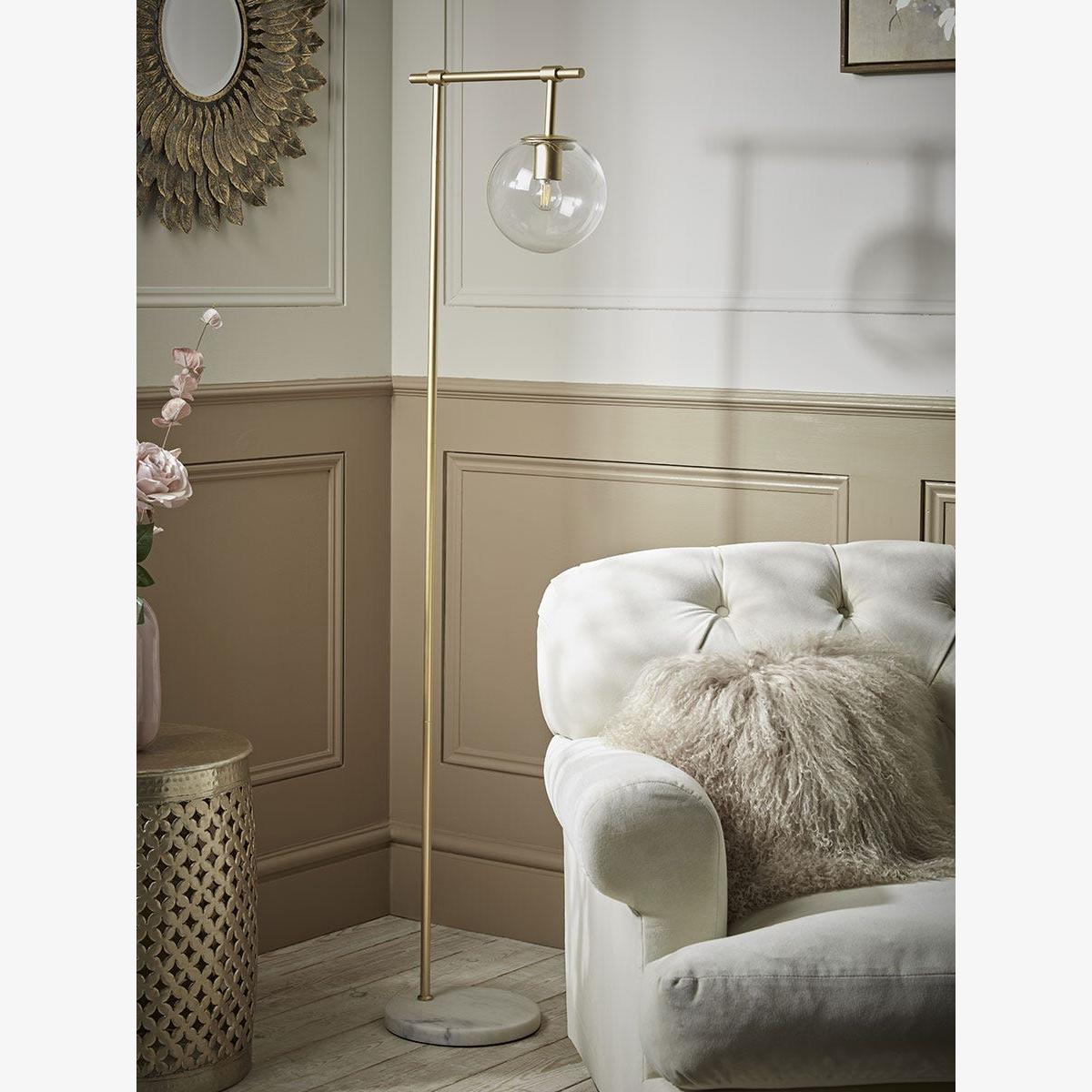 On a luxurious marble base, a long and elegant stem crafted in an opulent brass tone holds a glass globe in this floor lamp. Standing tall in the corner of any room, this floor lamp has a soft and minimalist design that pairs wonderfully with the golden glow of the light, giving your home a warm and welcoming atmosphere.