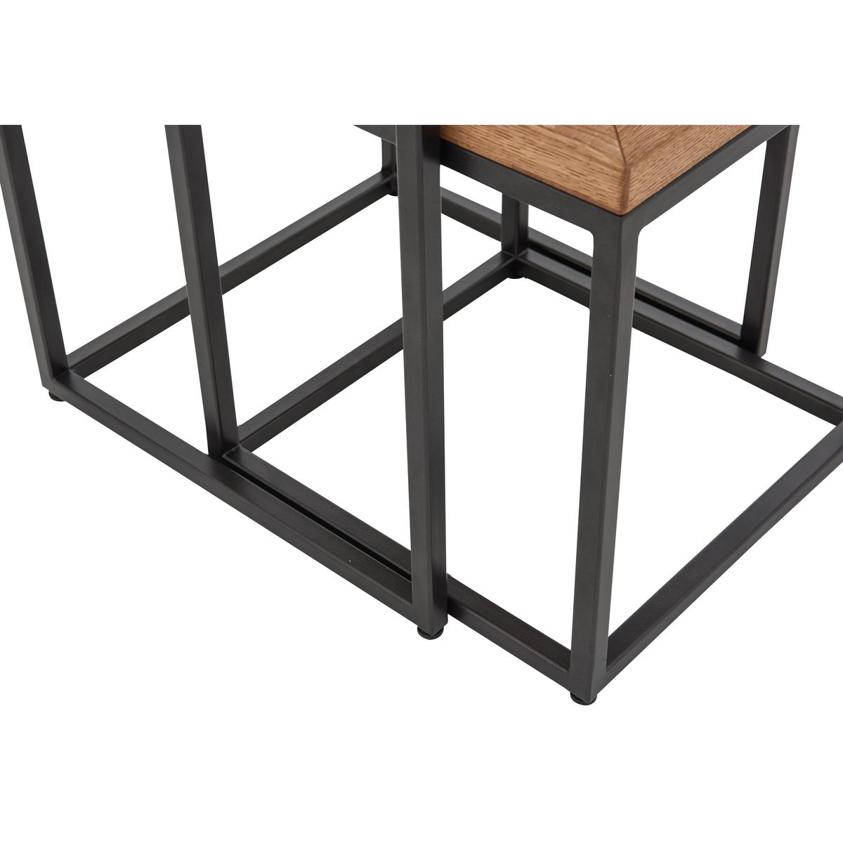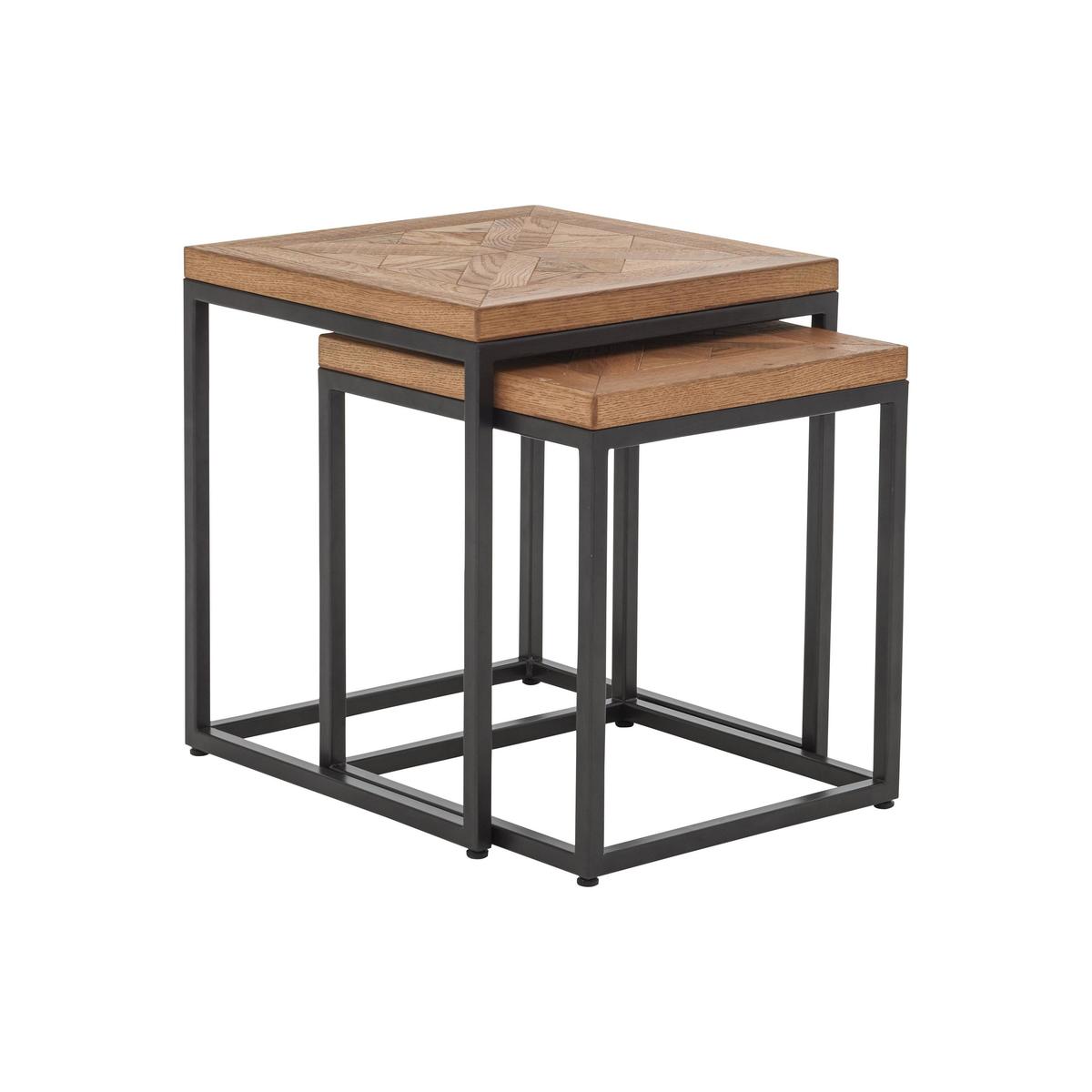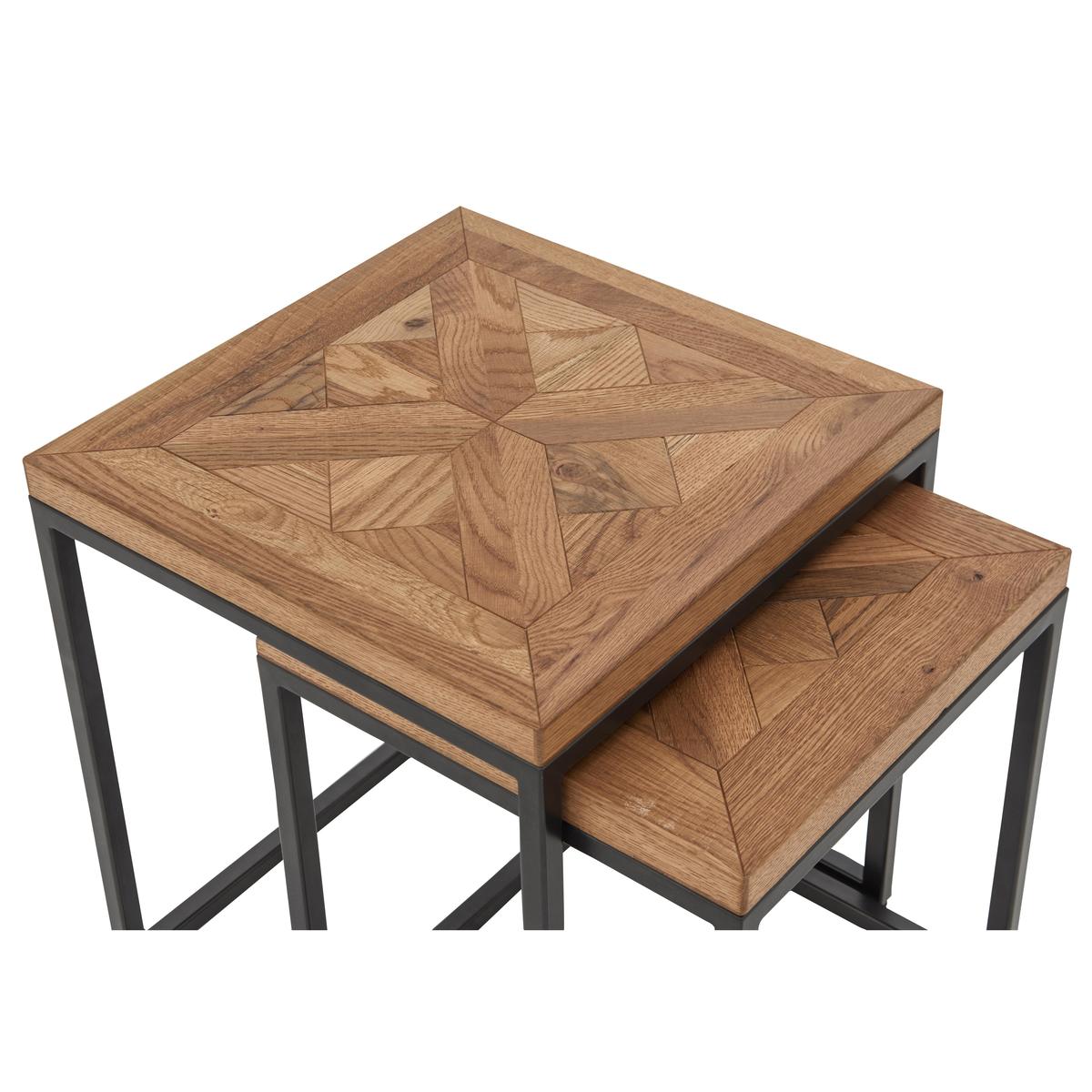 On trend industrial style with a beautiful finish Handcrafted marquetry- patterned rustic oak veneers Powder- coated metal bases in gunmetal grey The ever- popular and always handy nest of tables takes on an elegant version of industrial style in the Globe nest of tables. This set of two square side tables showcases beautiful solid oak tops that have oak veneers featuring handcrafted saw- cut geometric patterns, marquetry style. Veneers are then distressed for an authentic rustic oak appearance. Welded powder- coated metal bases have a gunmetal grey finish. The larger table has a three- sided base which allows the smaller table to slide neatly under it. This set of side tables is the perfect choice for a more compact living room, as it provides useful end tables when the occasion demands but without taking up too much floor space on a daily basis. The Globe nest of tables is part of the well- crafted Globe collection of living and dining room furniture. The range includes a wide selection of living room occasional tables and storage pieces, as well as sideboards and dining tables. Did you know? Oak is natural with characterful knots and markings; every piece of furniture is unique.