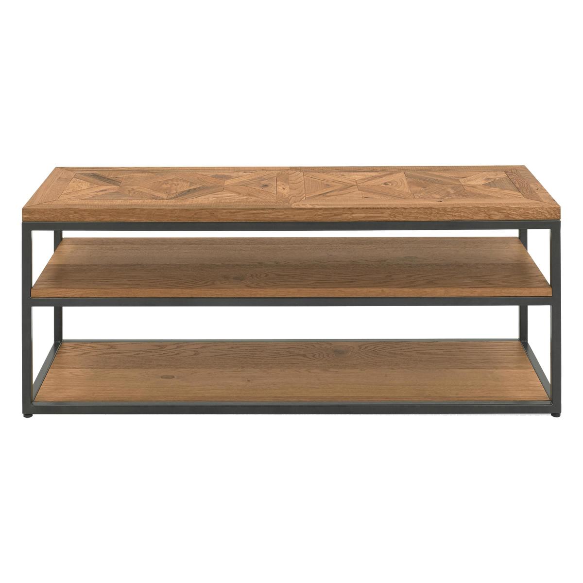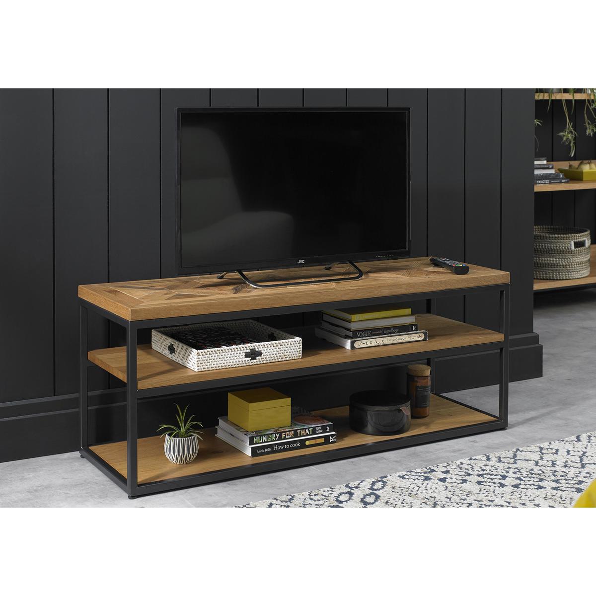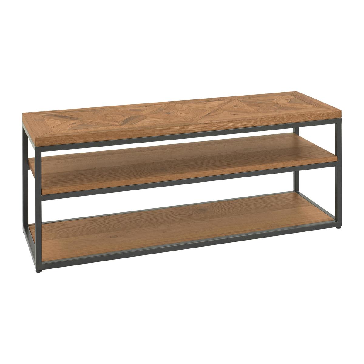 Contemporary industrial style shows its elegant side in the Globe collection of occasional, storage and dining furniture. Pieces feature beautiful solid oak tops, welded metal bases in fashionable gunmetal grey, and the collection’s signature handcrafted marquetry patterned oak veneers, distressed for an authentic rustic finish. Compact in scale, the range’s occasional tables, media storage, and sideboards are designed for modern living, offering excellent storage and display space. The two extending dining tables and the round dining table help maximise smaller dining rooms, and can be paired with either of the range’s two styles of dining chairs – velvet upholstered with studding detail or modern cantilever-based. On trend industrial style with a beautiful finish. Handcrafted marquetry-patterned rustic oak veneers. Powder-coated metal base in gunmetal grey. So simple, so stylish, the Globe open TV unit is the perfect media cabinet for a more compact living space. This open plan unit has three rectangular solid oak shelves supported by a welded powder-coated metal base with a gunmetal grey finish. The upper shelf features the collection’s signature look – handcrafted oak veneers with a saw-cut marquetry pattern and an authentic distressed finish that brings out the beauty of the wood’s natural grain. This piece offers plenty of room to house a variety of media components and can support even a large flat screen TV. Alternatively, you could use it as a simple and elegant shelving unit for books or to display favourite items. The Globe open TV unit is part of the Globe collection of modern industrial-style living and dining furniture. The range includes storage and occasional pieces as well as extending and round dining tables. A stunning collection for anyone who appreciates well-crafted industrial style. Did you know?. Oak is natural with characterful knots and markings; every piece of furniture is unique.