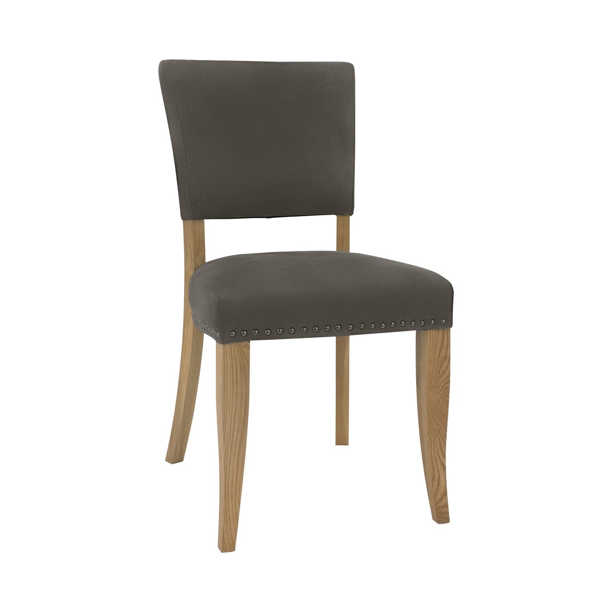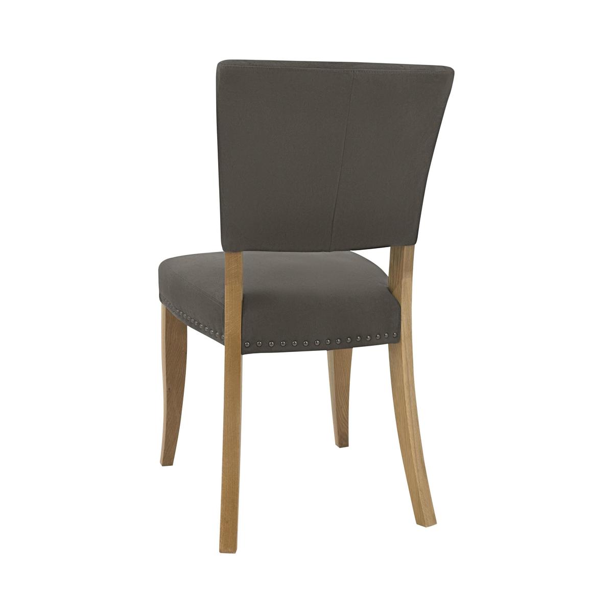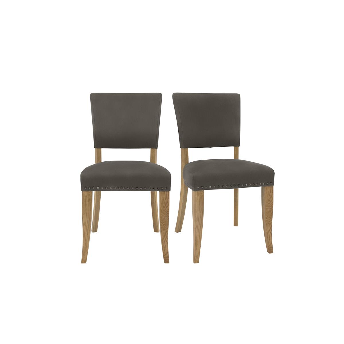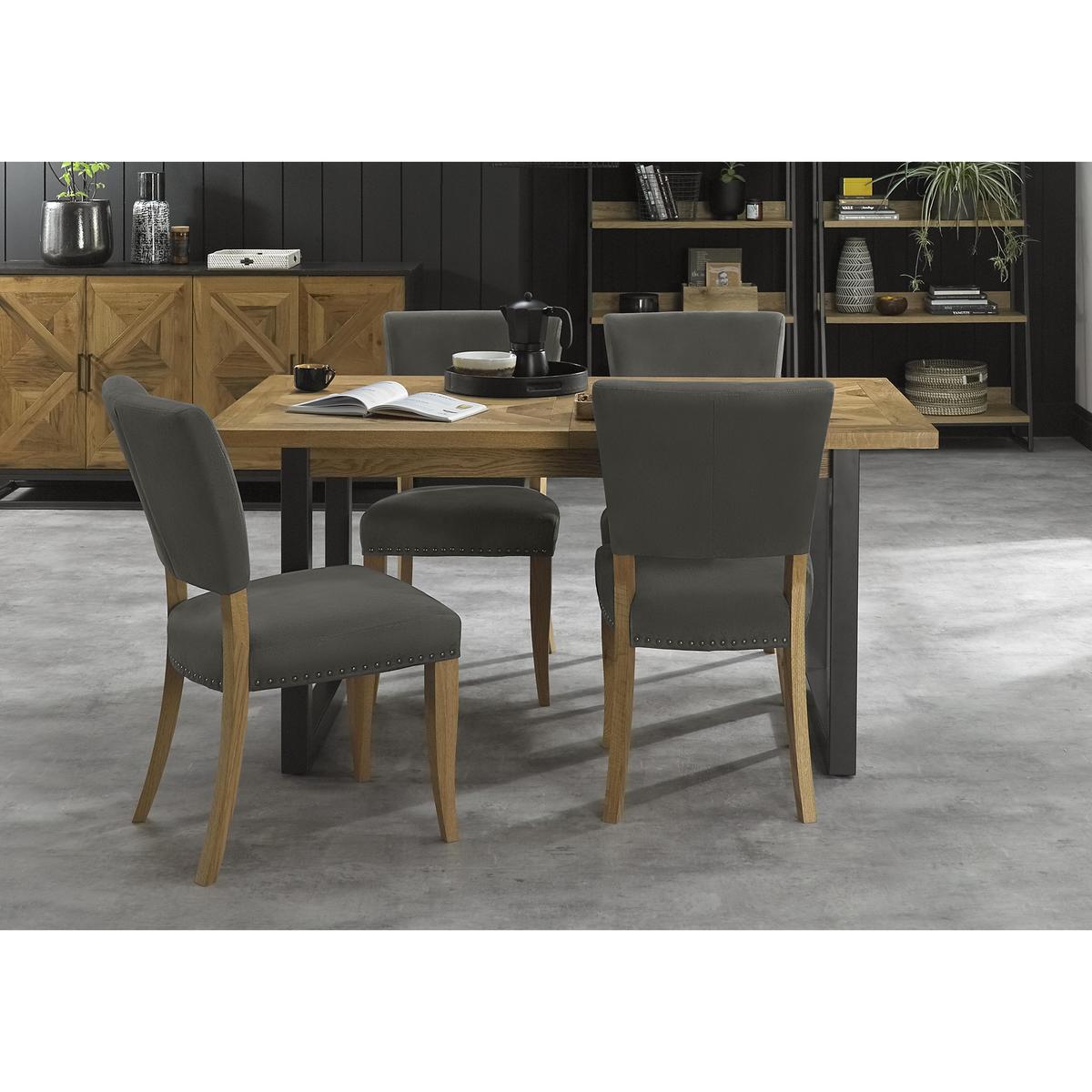 Contemporary industrial style shows its elegant side in the Globe collection of occasional, storage and dining furniture. Pieces feature beautiful solid oak tops, welded metal bases in fashionable gunmetal grey, and the collection’s signature handcrafted marquetry patterned oak veneers, distressed for an authentic rustic finish. Compact in scale, the range’s occasional tables, media storage, and sideboards are designed for modern living, offering excellent storage and display space. The two extending dining tables and the round dining table help maximise smaller dining rooms, and can be paired with either of the range’s two styles of dining chairs – velvet upholstered with studding detail or modern cantilever-based. Classic style pair of dining chairs. Dark grey fabric with oak frames. Cool studding detail. Perfect for the modern dining room, the Globe pair of dining chairs offers comfortable and stylish seating. Chairs have solid and sturdy oak frames and generous curved backs that provide plenty of lumbar support to lingering diners. The pale oak legs are gently curved and tapered, and the seat and back are beautifully upholstered in a soft dark grey fabric. The studding detail is a striking finishing touch. The Globe pair of dining chairs is part of the Globe collection of living and dining furniture, and is designed to accompany any of the three dining tables in the collection – the small extending dining table, the large extending dining table, and the round dining table – all of which feature the range’s signature patterned rustic oak veneer tops and stylish powder-coated metal bases. The range also includes a modern cantilever-based dining chair. Did you know?. Oak is natural with characterful knots and markings; every piece of furniture is unique.