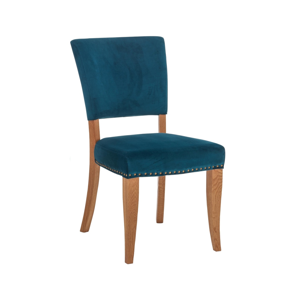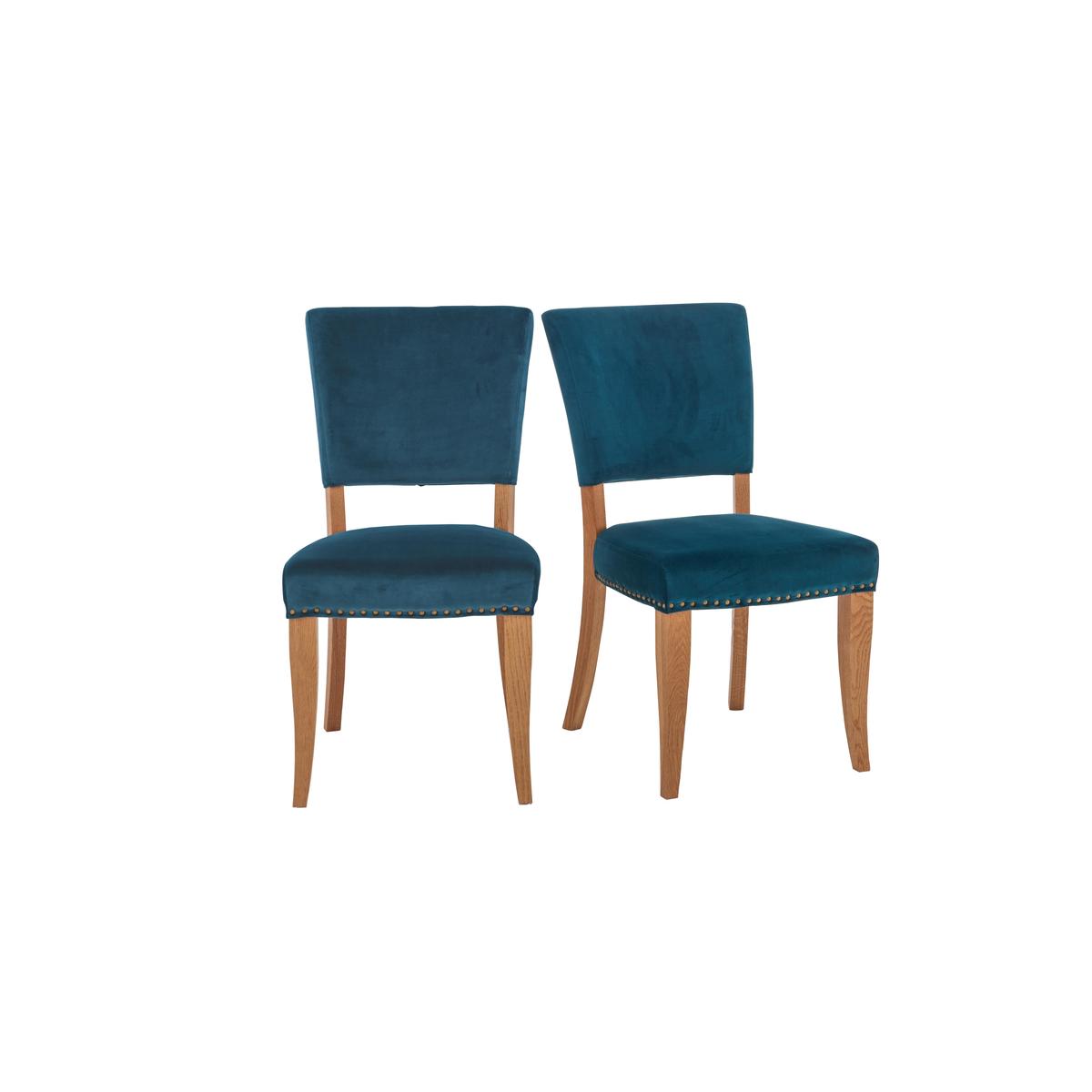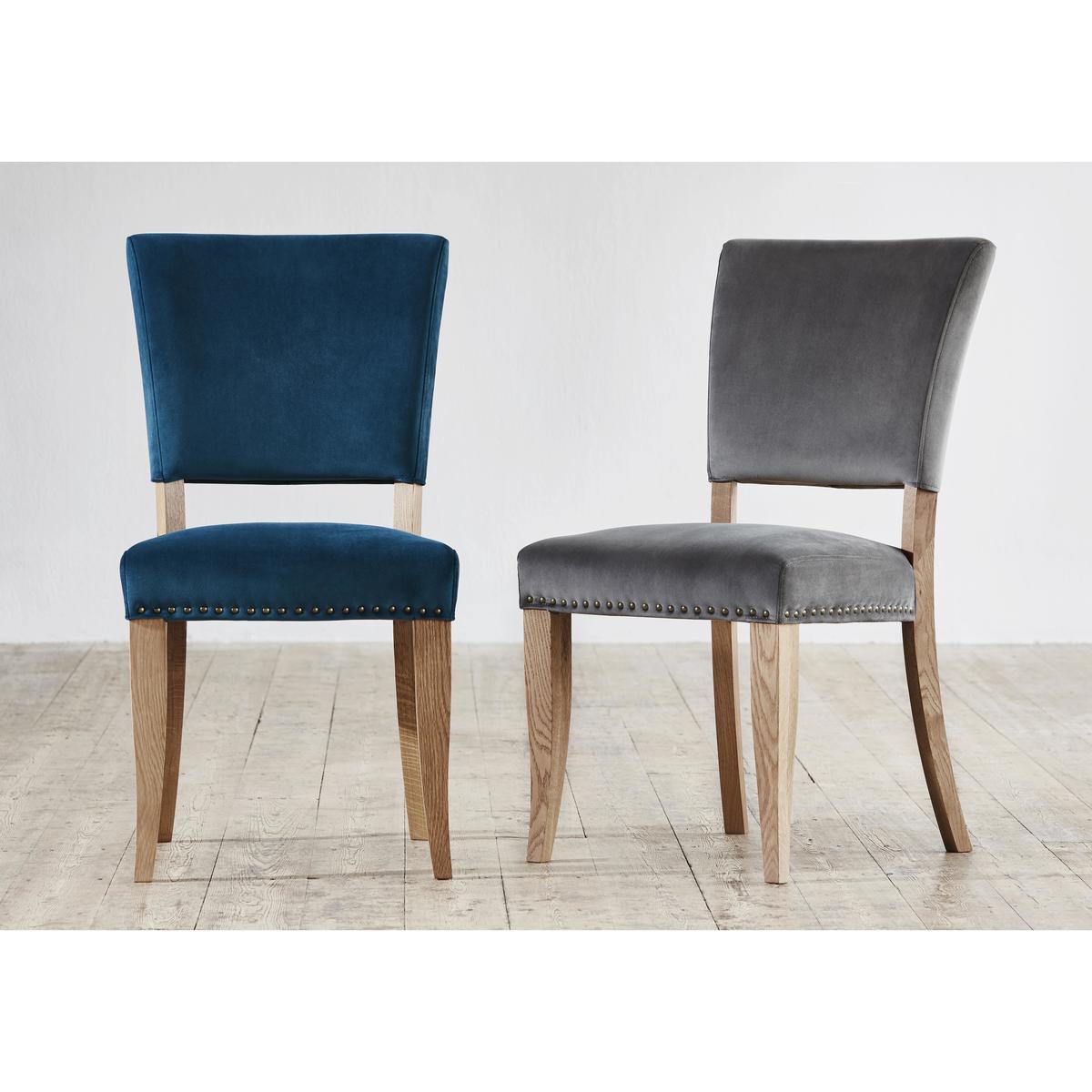 Classic oak-framed dining chairs. Velvet upholstery in a choice of colours. Cool metallic studding detail. The Globe pair of velvet dining chairs finds the perfect balance between casual and elegant. Beautifully upholstered in luxurious velvet – choose from a range of gorgeously rich tones – this chair is sturdily constructed with a solid oak frame and, for your comfort, has a sprung seat and lumbar-supporting curved back. This dining chair’s details are fashionable in a classic way. Its pale oak legs are gently curved, and its lower upholstered edge is embellished with metallic studding. The Globe paid of velvet dining chairs is part of the Globe collection of living room and dining room furniture, and looks fabulous when arranged around any of the range’s three dining tables – two extending and one fixed. This collection also includes a wide choice of storage pieces and occasional tables, and all pieces, including dining tables, feature beautiful marquetry-pattered rustic oak veneers and industrial-style welded metal bases. Did you know? Oak is natural with characterful knots and markings, every piece of furniture is unique.