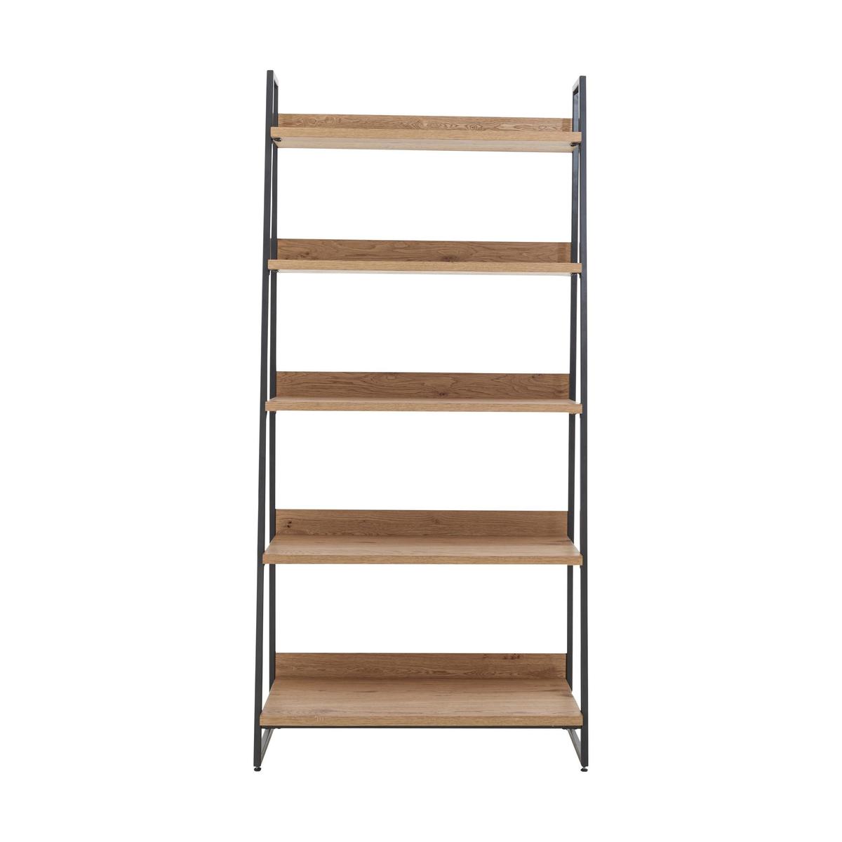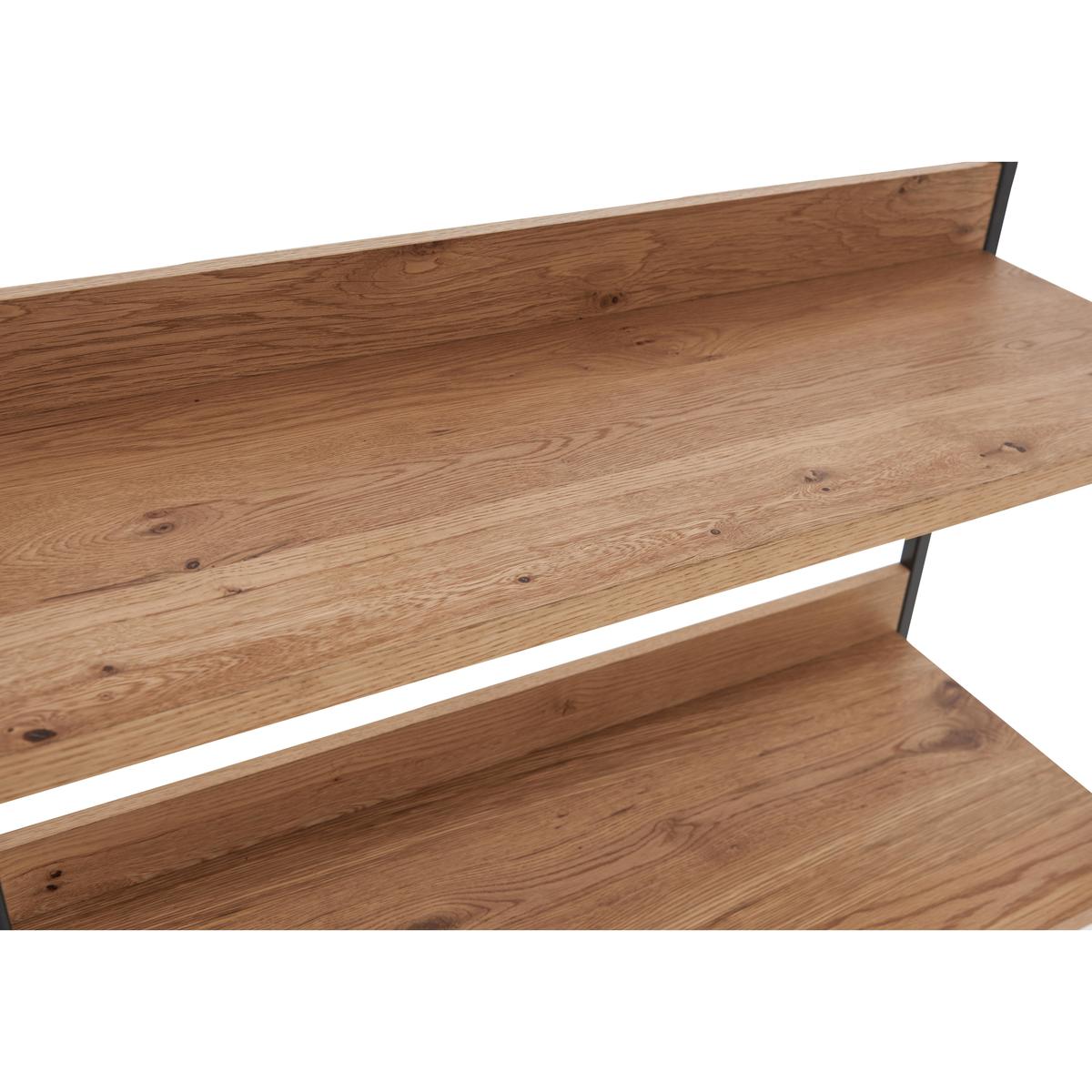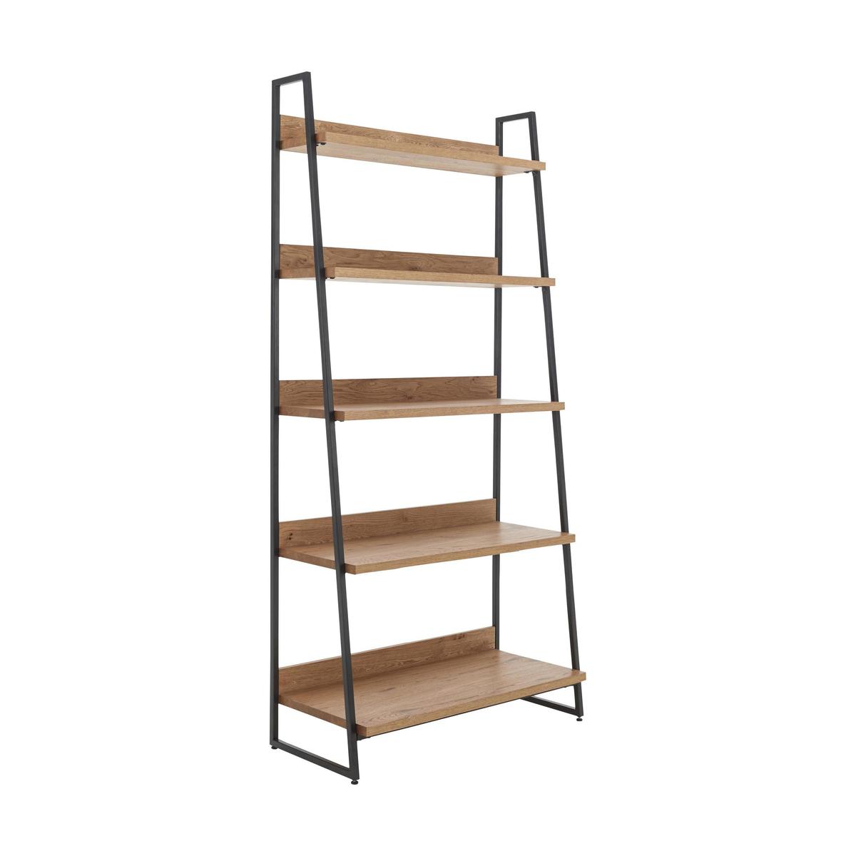 Contemporary industrial style shows its elegant side in the Globe collection of occasional, storage and dining furniture. Pieces feature beautiful solid oak tops, welded metal bases in fashionable gunmetal grey, and the collection’s signature handcrafted marquetry patterned oak veneers, distressed for an authentic rustic finish. Compact in scale, the range’s occasional tables, media storage, and sideboards are designed for modern living, offering excellent storage and display space. The two extending dining tables and the round dining table help maximise smaller dining rooms, and can be paired with either of the range’s two styles of dining chairs – velvet upholstered with studding detail or modern cantilever-based. On trend industrial style with a beautiful finish. Powder-coated metal frame in gunmetal grey. Perfect for compact living spaces. Stylish and contemporary, the Globe shelving unit is an elegant take on modern industrial style. This useful display unit features five open shelves supported by a framework of welded powder-coated metal with a gunmetal grey finish that’s so on trend. The shelves are made of oak with a smooth finish that shows the wonderful wood grain. The raised back edge is a nice finishing touch which also ensures that no items inadvertently slip off the shelves. The perfect place for books, framed family photos or a creative display of treasured objects, the Globe shelving unit is part of the compact Globe collection of living and dining pieces, which includes a wide selection of occasional tables – a coffee table, a lamp table, a console table and more – as well as sideboards and extending dining tables. The majority of pieces in the collection features rustic oak veneered tops with elegant geometric patterning. WARNING!. Furniture can tip over unexpectedly and cause injury. This item shall be fixed to a wall using the anti-tip kit provided with the furniture. Be sure to use the correct wall fixings suitable for the walls in your home. Did you know?. Oak is natural with characterful knots and markings; every piece of furniture is unique.