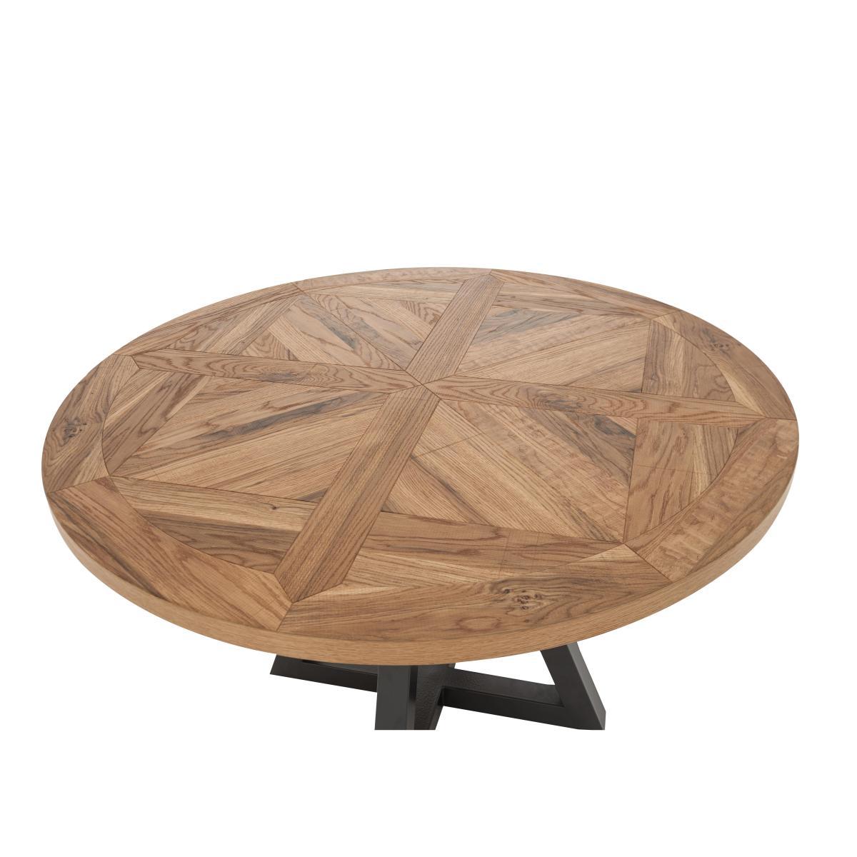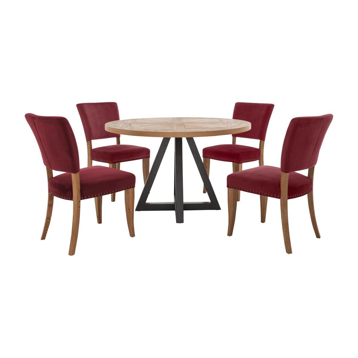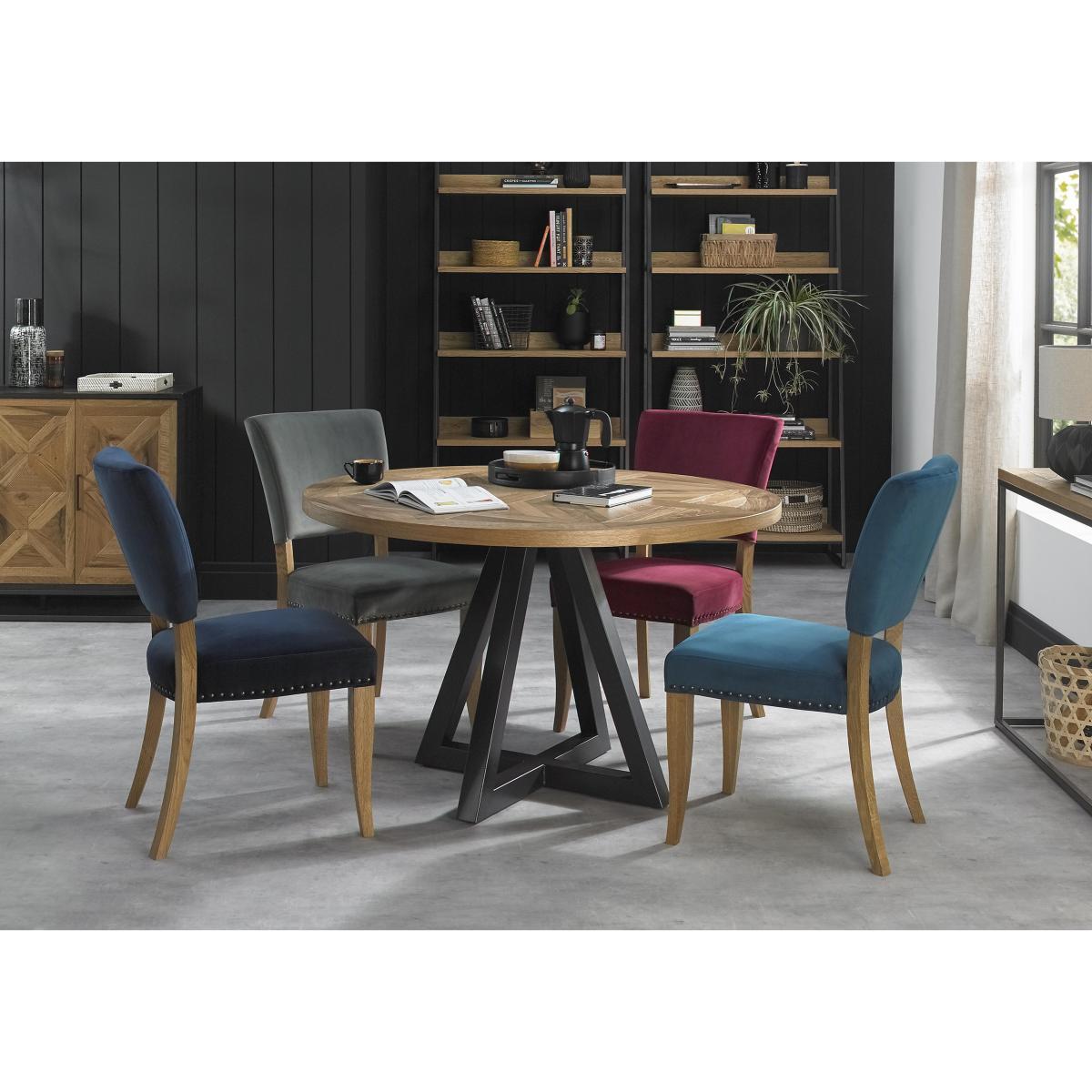 Contemporary industrial style shows its elegant side in the Globe collection of occasional, storage and dining furniture. Pieces feature beautiful solid oak tops, welded metal bases in fashionable gunmetal grey, and the collection’s signature handcrafted marquetry patterned oak veneers, distressed for an authentic rustic finish. Compact in scale, the range’s occasional tables, media storage, and sideboards are designed for modern living, offering excellent storage and display space. The two extending dining tables and the round dining table help maximise smaller dining rooms, and can be paired with either of the range’s two styles of dining chairs – velvet upholstered with studding detail or modern cantilever-based. On trend industrial style with a beautiful finish. Handcrafted marquetry-patterned rustic oak veneers. Powder-coated metal base in gunmetal grey. The compact Globe round dining table and 4 dining chairs set combines on trend industrial style with a handcrafted finish that makes this fabulous dining set an even more attractive and sociable place to dine. Seating up to four, this circular table has a solid oak top finished with the range’s signature style detail – handcrafted marquetry-style geometric patterning that’s saw cut into rustic oak veneers. A distressed finish highlights the wood grain’s natural texture. Sturdy angled legs are crafted from gunmetal grey powder-coated metal. In this set, it’s paired with four velvet-upholstered dining chairs with comfortable seats and curved backs, and curved pale oak legs. The upholstery, which is available in a choice of gorgeous colours, features a metallic studding detail. The Globe round dining table and 4 dining chairs set is part of the Globe living and dining collection, carefully proportioned for more compact modern living. The range offers a wide choice of storage pieces, occasional tables, and dining room furniture. Did you know?. Oak is natural with characterful knots and markings; every piece of furniture is unique.