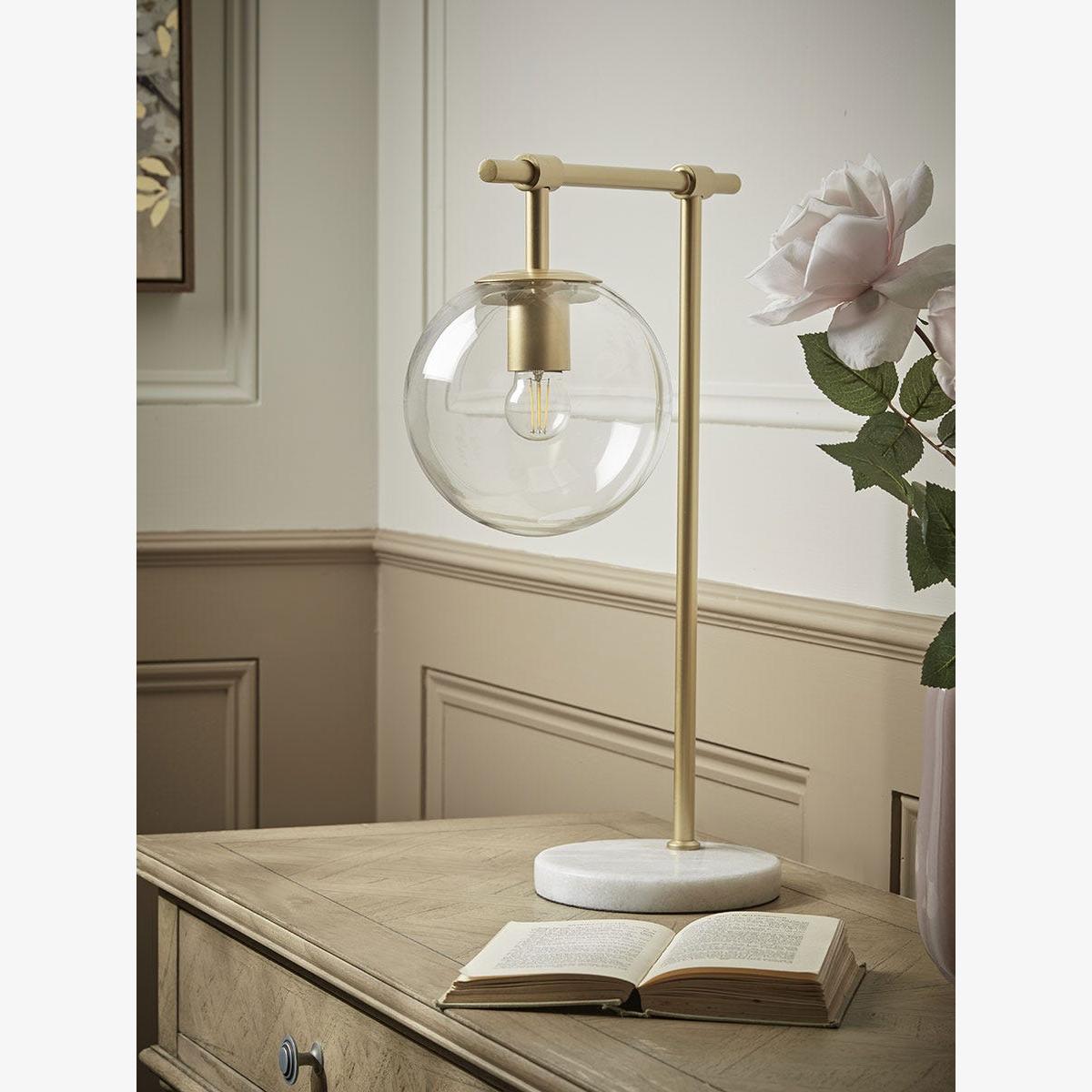 On a luxurious marble base, a long and elegant stem crafted in an opulent brass tone holds a glass globe in this table lamp. Its soft and minimalist design pairs wonderfully with the golden glow of the light, giving your home a warm and welcoming atmosphere.