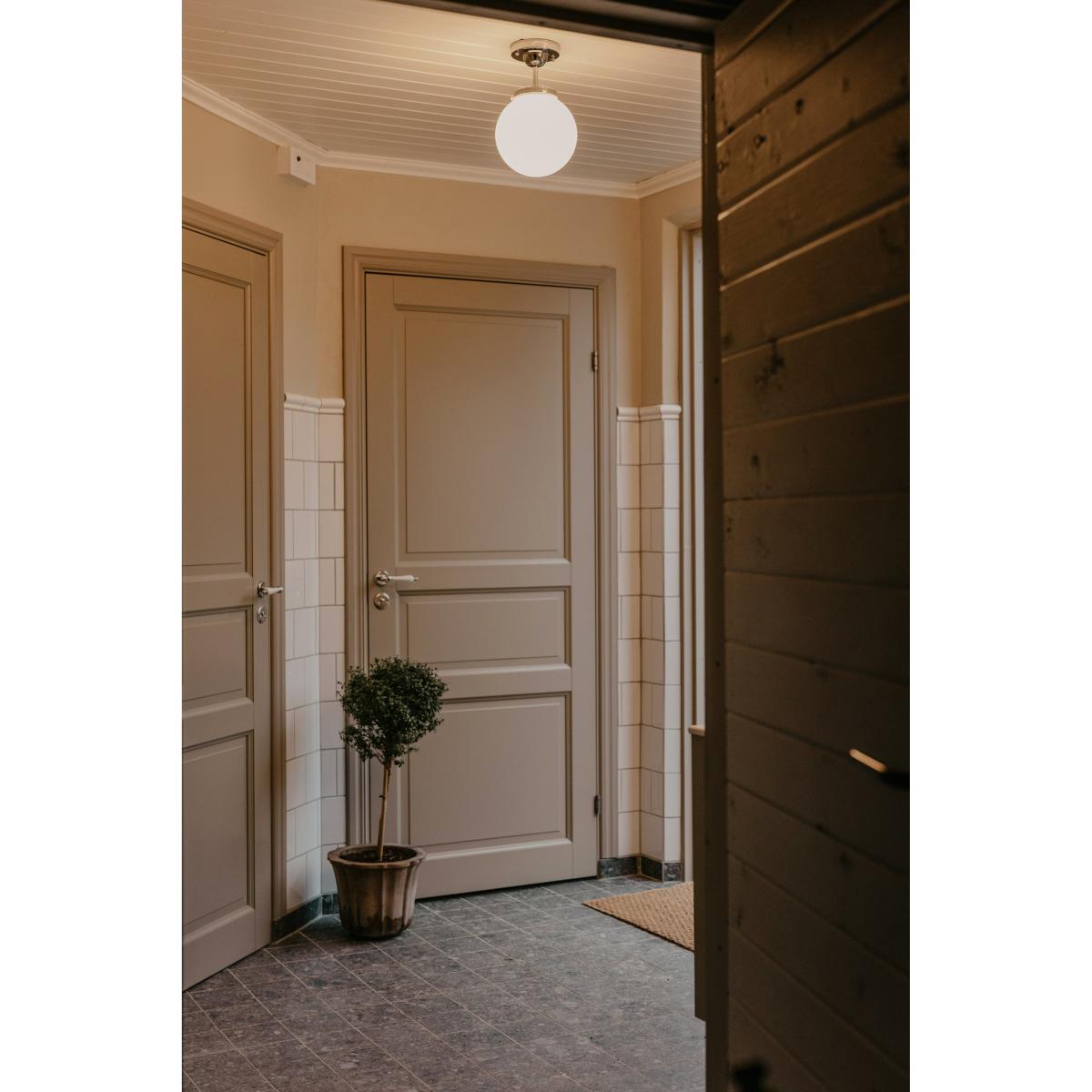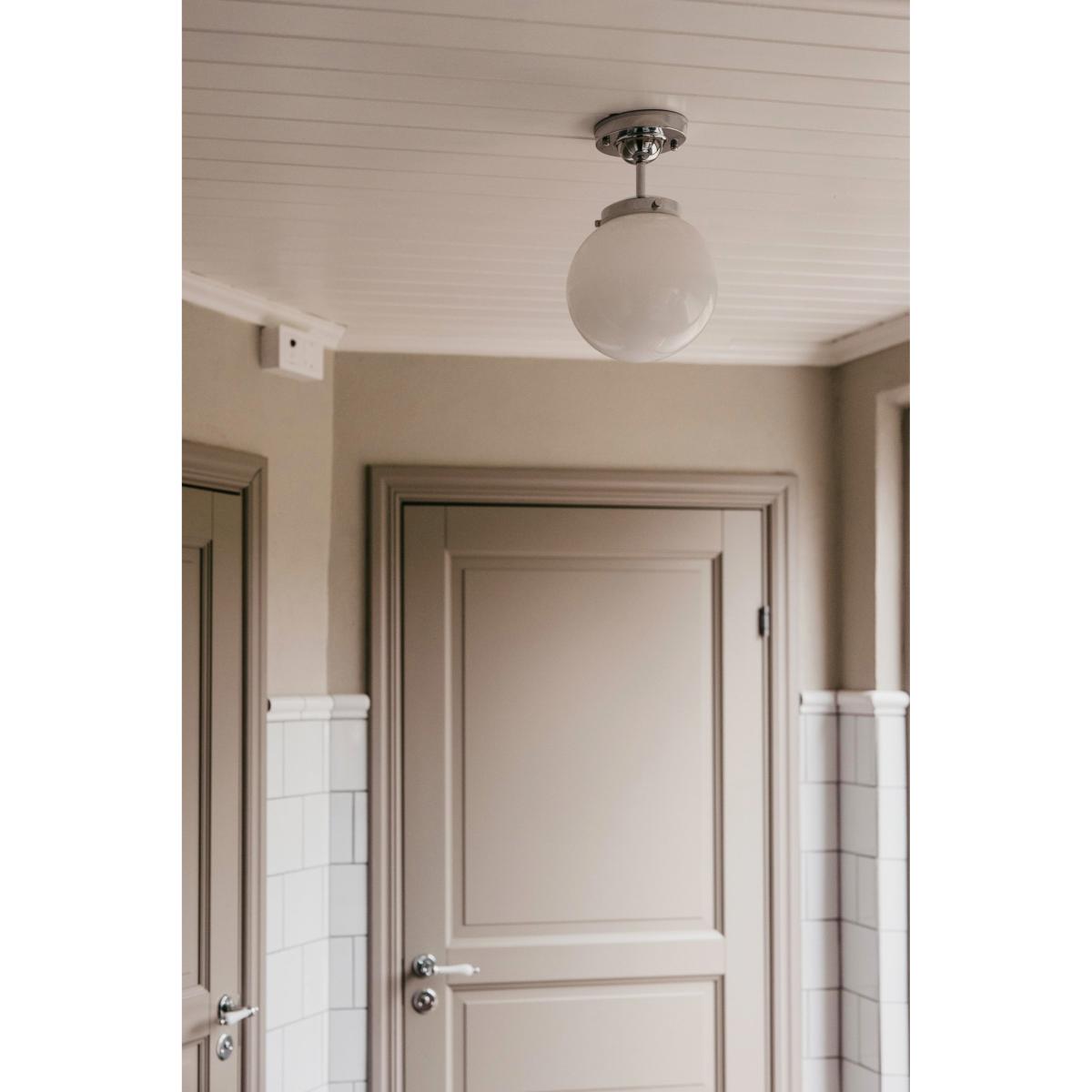 The Alley ceiling lamp IP44 from the Swedish brand Globen Lighting has an elegant, turn-of-the-century design replete with myriad thoughtful accents. The ceiling plate and mounting are full or gorgeous details that bring thoughtful and sophisticated air to the design. The large glass globe hangs down slightly from the stylish arm to lend the room an elegant and refined expression. Best of all, because this beautiful ceiling light is water resistant, it is a perfect match for the bathroom or kitchen, in terms of both functionality and style.