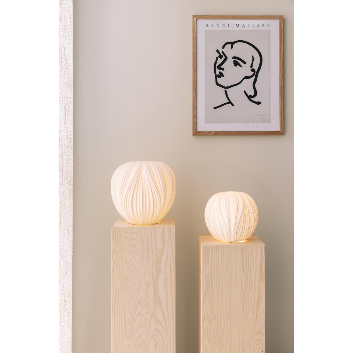 The Milo table lamp from Globen Lighting features an apple-shaped design that emits a soft and inviting light. The lamp's 200 cm long cable is transparent, making it a practical and aesthetically pleasing choice. Perfect for enhancing the atmosphere in your home.
