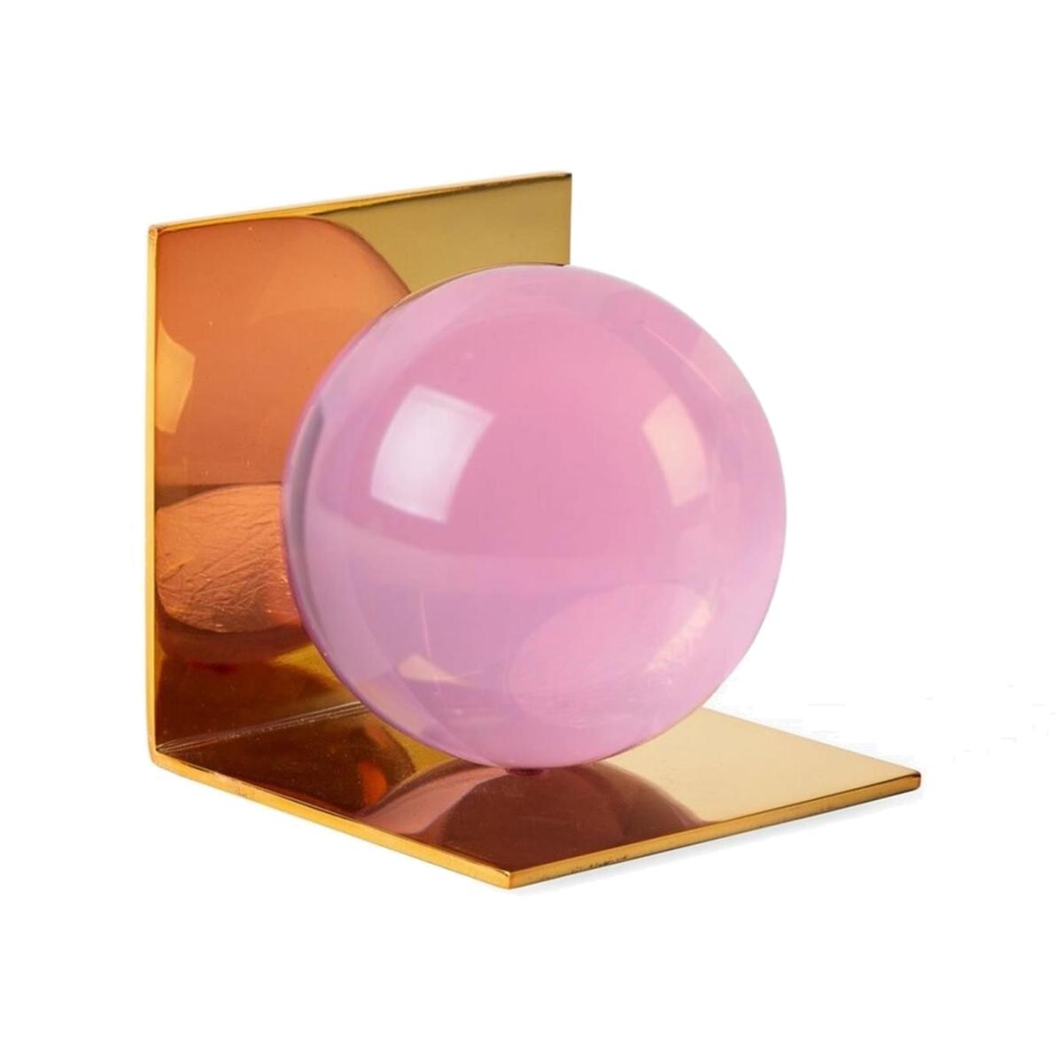 Step into Jonathan Adler's fantastical realm of mesmerising spheres and cabochons. Drawing inspiration from striking and opulent cocktail rings, every Globo Bookend showcases a radiant acrylic globe resting on an L-shaped brass base. Employ them jointly to prevent your books from falling over.