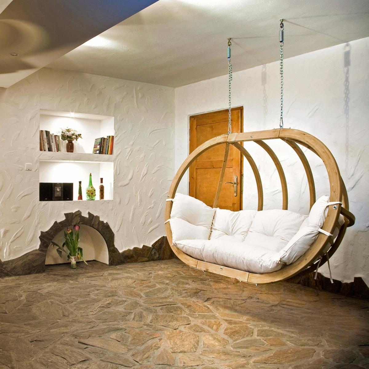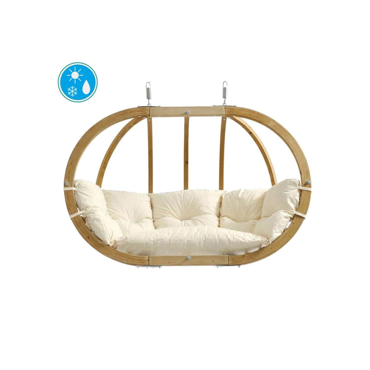 A hanging chair of quality, made from weather-resistant treated spruce. The high-class laminated glueing makes it particularly stable and secure. The extra-thick, water-repellent and rapidly drying upholstery is your guarantee of perfect relaxation. The extremely resistant Agora fabric cover is as soft as cotton, very resistant to light and the weather (light fastness 7/8), water-repellent, mould resistant, insensitive to dirt and easy to look after. Comes with 2 spiral springs. The Globo Royal Chair can be combined with the Globo Royal Stand frame (not included in the delivery specifications). All the raw materials used come from Europe, and have been processed in Europe in environmentally friendly ways.