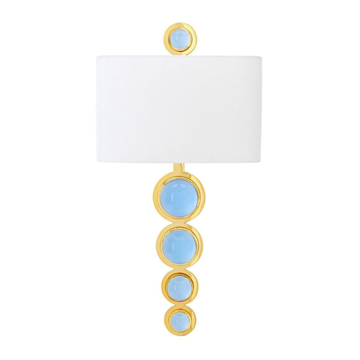 Enter into a fantastical realm of orbs and stones with Jonathan Adler's exquisite design. The Globo Sconce is a remarkable piece that transforms your wall into a precious display of polished brass and lustrous blue acrylic spheres, crowned with a white shade. It is a stunning sight to behold. Use in pairs for maximum impact.