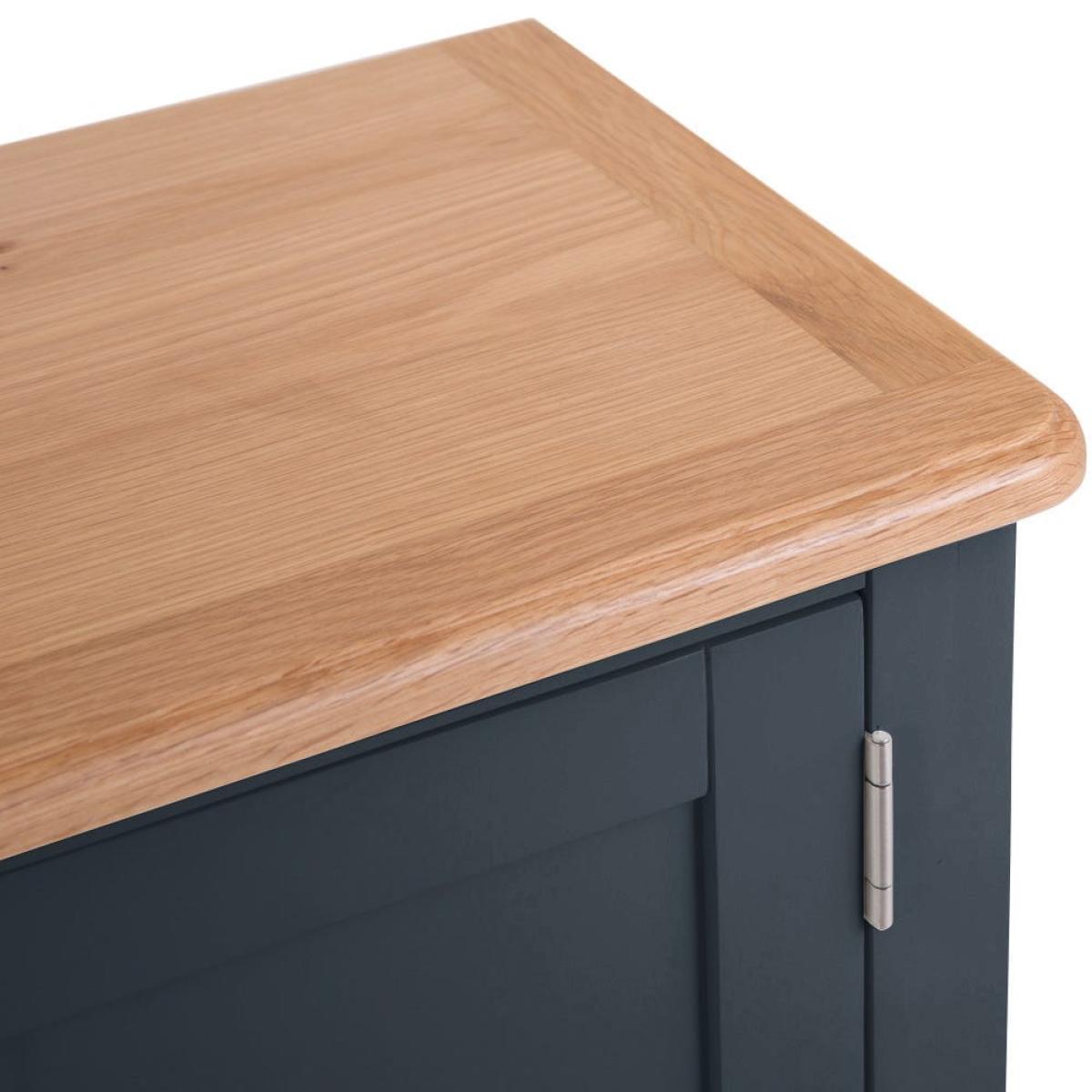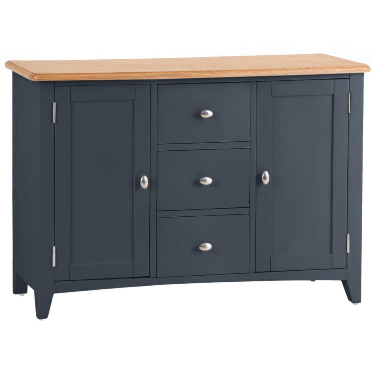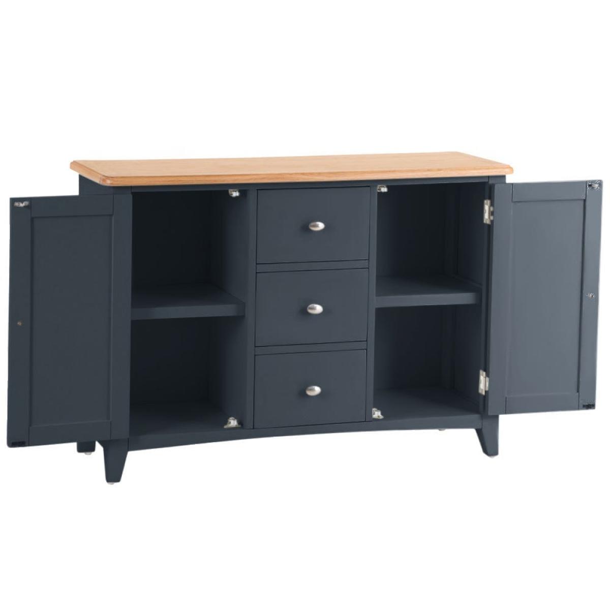 When you come in from a long day, drop everything onto our Gloucester midnight grey painted 2 door 3 drawer large sideboard before heading to make a well-deserved cuppa. Ideal for hallways, this large sideboard is bursting with storage space. Display some flowers or a couple of trinkets on the surface, and hide away the dog toys, leads and treats in the three drawers in the middle. Each of the two cupboards on either side has a shelf – they’re a great spot for keeping scarves, pashminas or kids’ mittens. With its dark grey finish, modern tapered legs and bevelled detailing, the sideboard adds a contemporary flourish to your current hallway design.