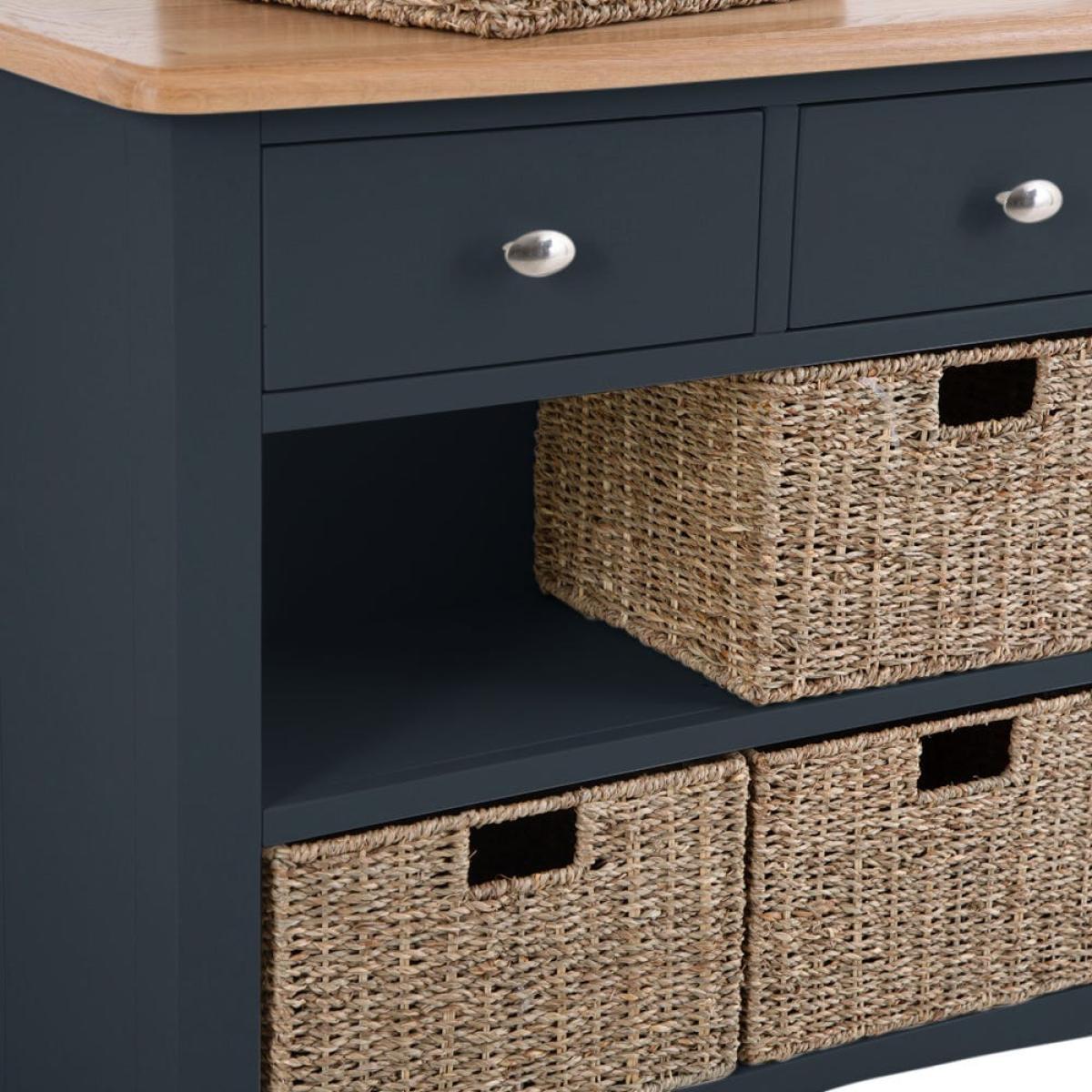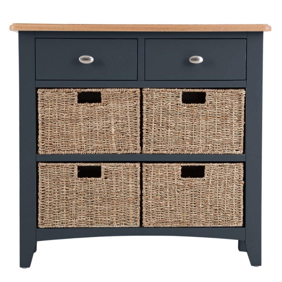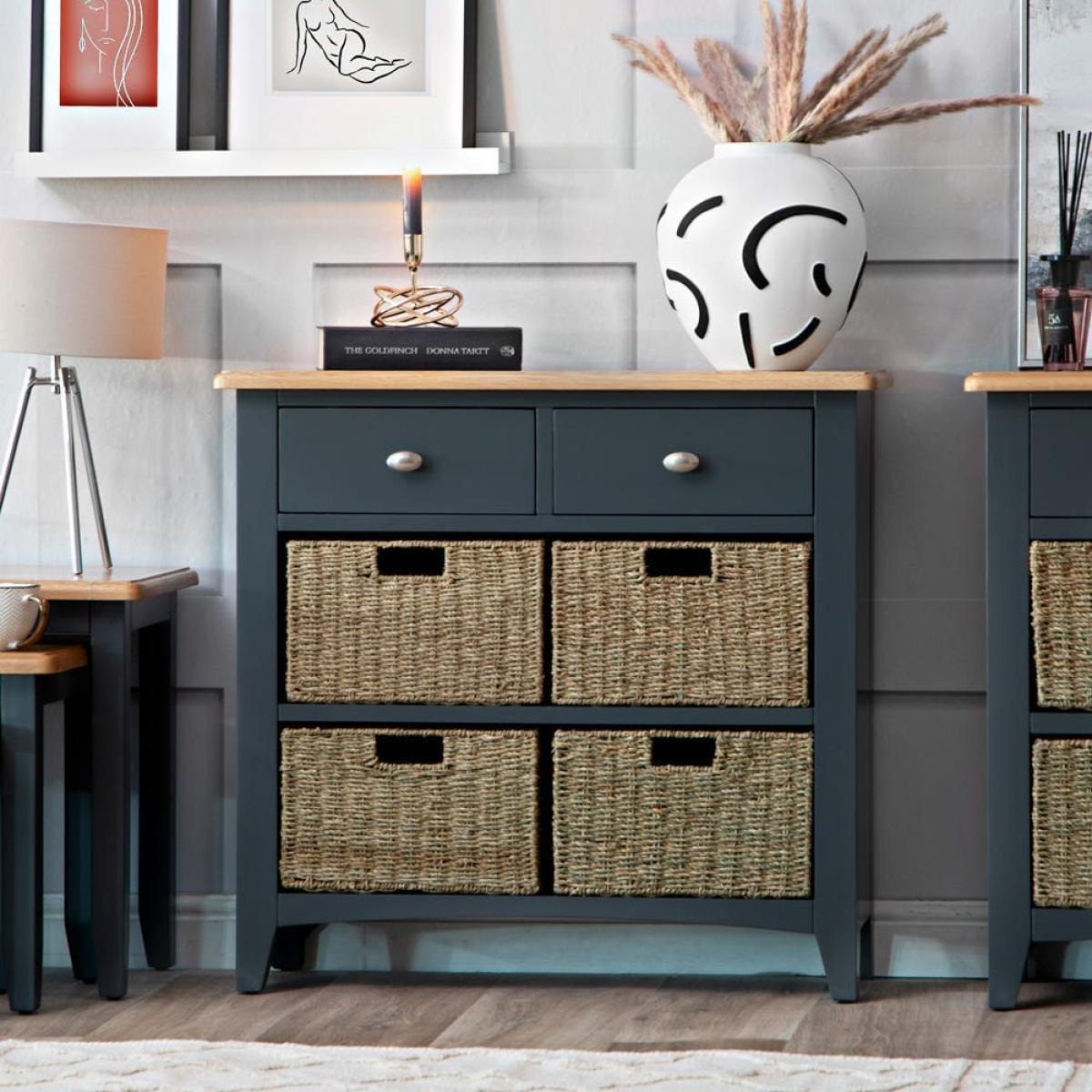 When the kids come home from after-school activities, you’ll have a handy spot to dump the muddy football boots and tennis balls with our Gloucester midnight grey painted 2 drawer 4 wicker basket cabinet. This piece will fit into a hallway with a contemporary design, thanks to its modern dark grey colour, slick tapered legs and brushed metal handles. It features an array of storage including two drawers on the top. Beneath them, there are two open shelves which each fit two removable wicker baskets.