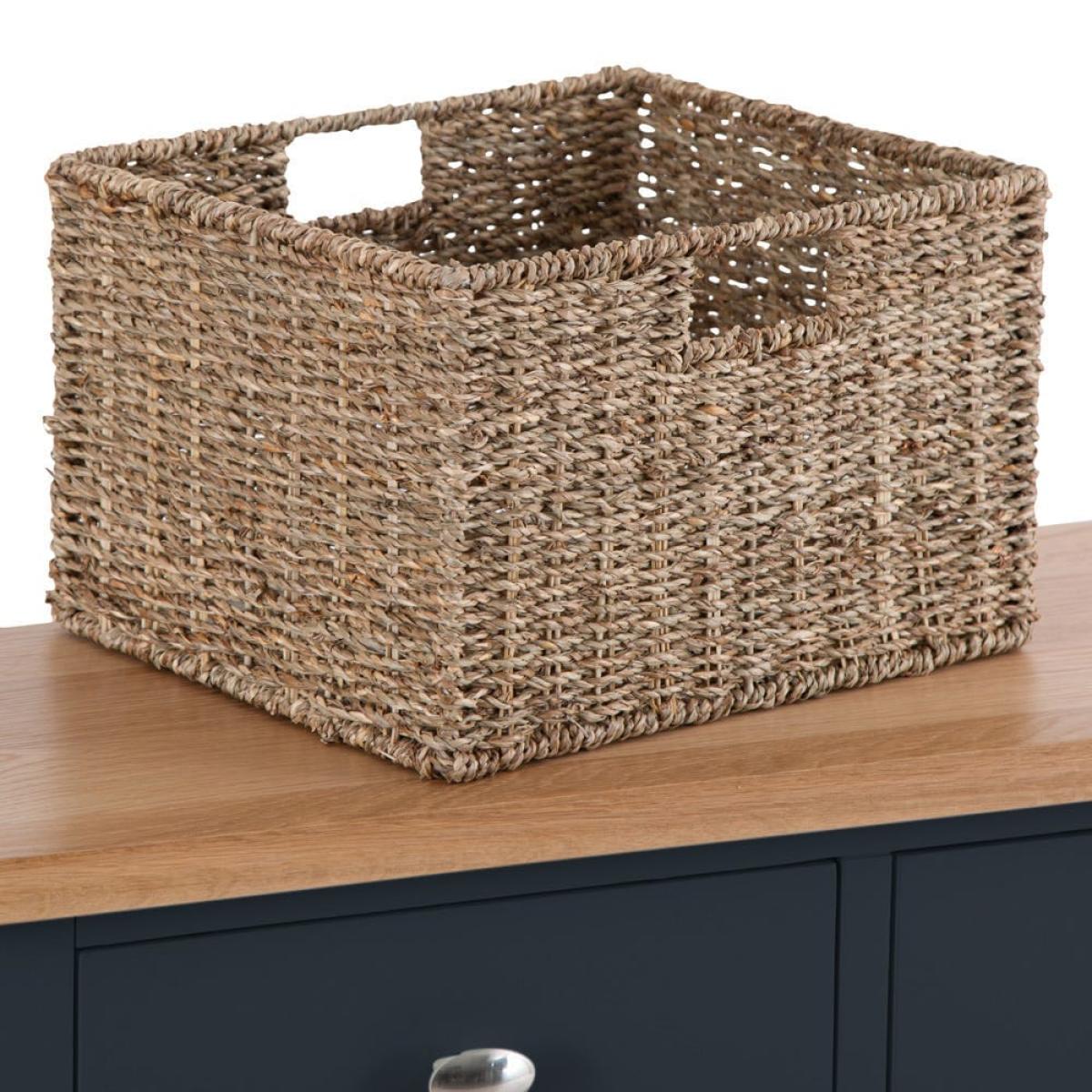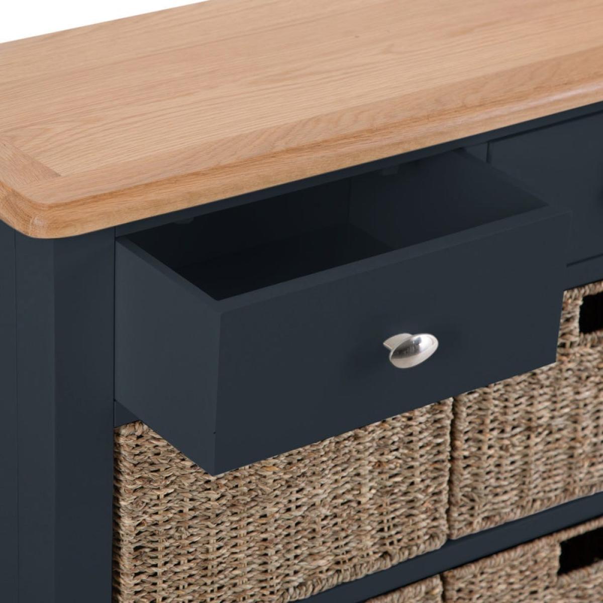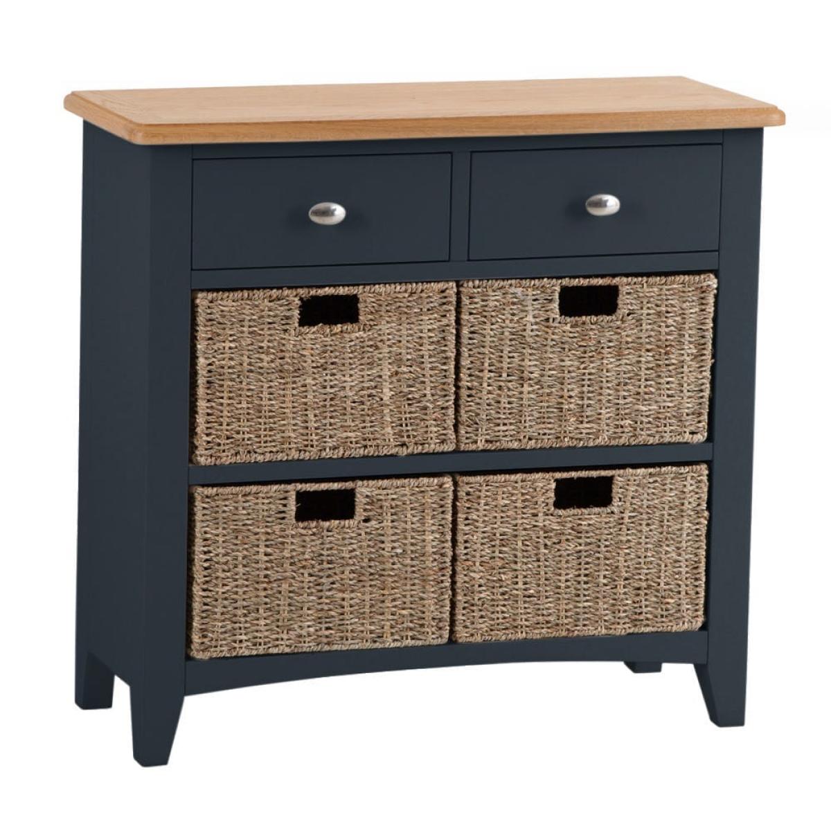 When the kids come home from after-school activities, you’ll have a handy spot to dump the muddy football boots and tennis balls with our Gloucester midnight grey painted 2 drawer 4 wicker basket cabinet. This piece will fit into a hallway with a contemporary design, thanks to its modern dark grey colour, slick tapered legs and brushed metal handles. It features an array of storage including two drawers on the top. Beneath them, there are two open shelves which each fit two removable wicker baskets.