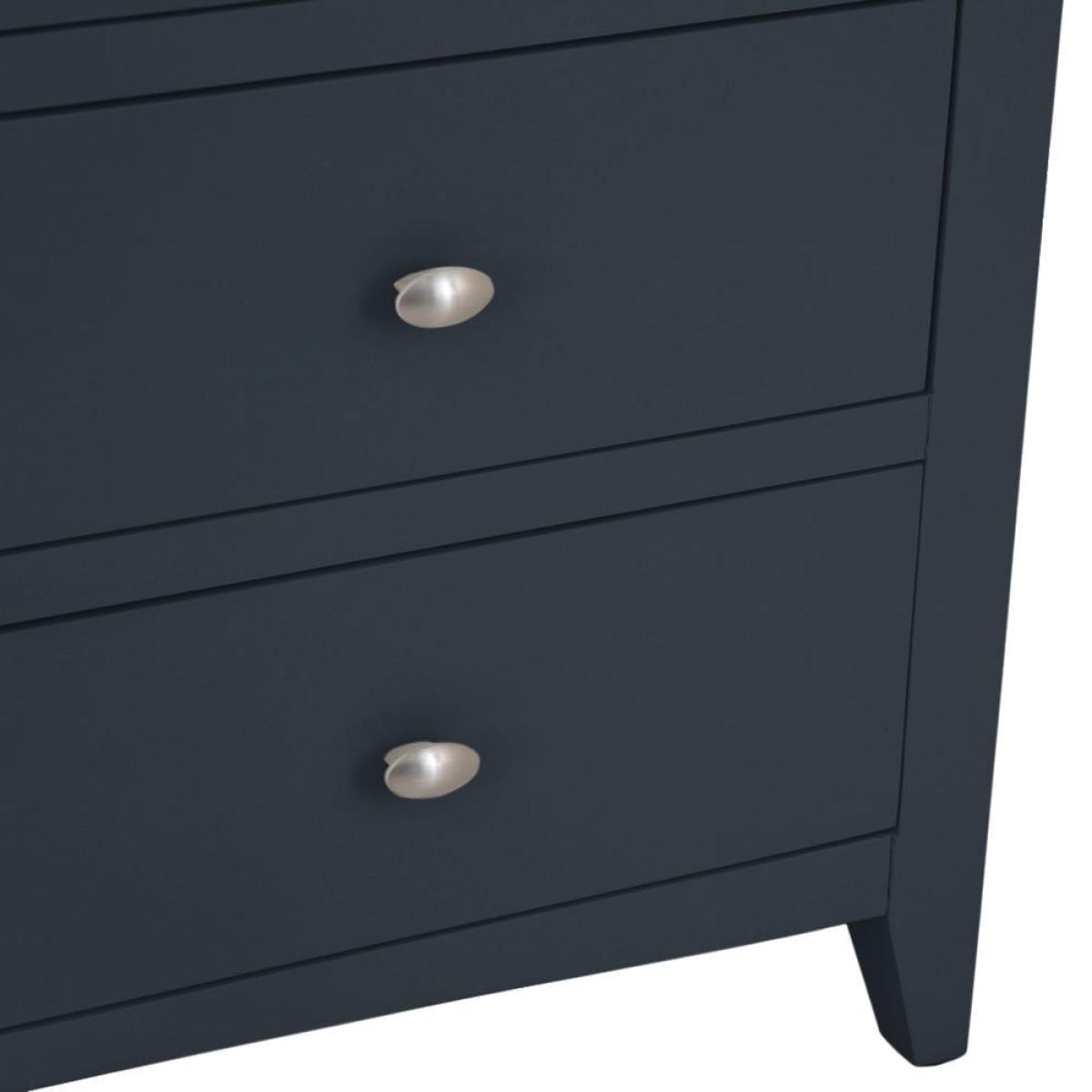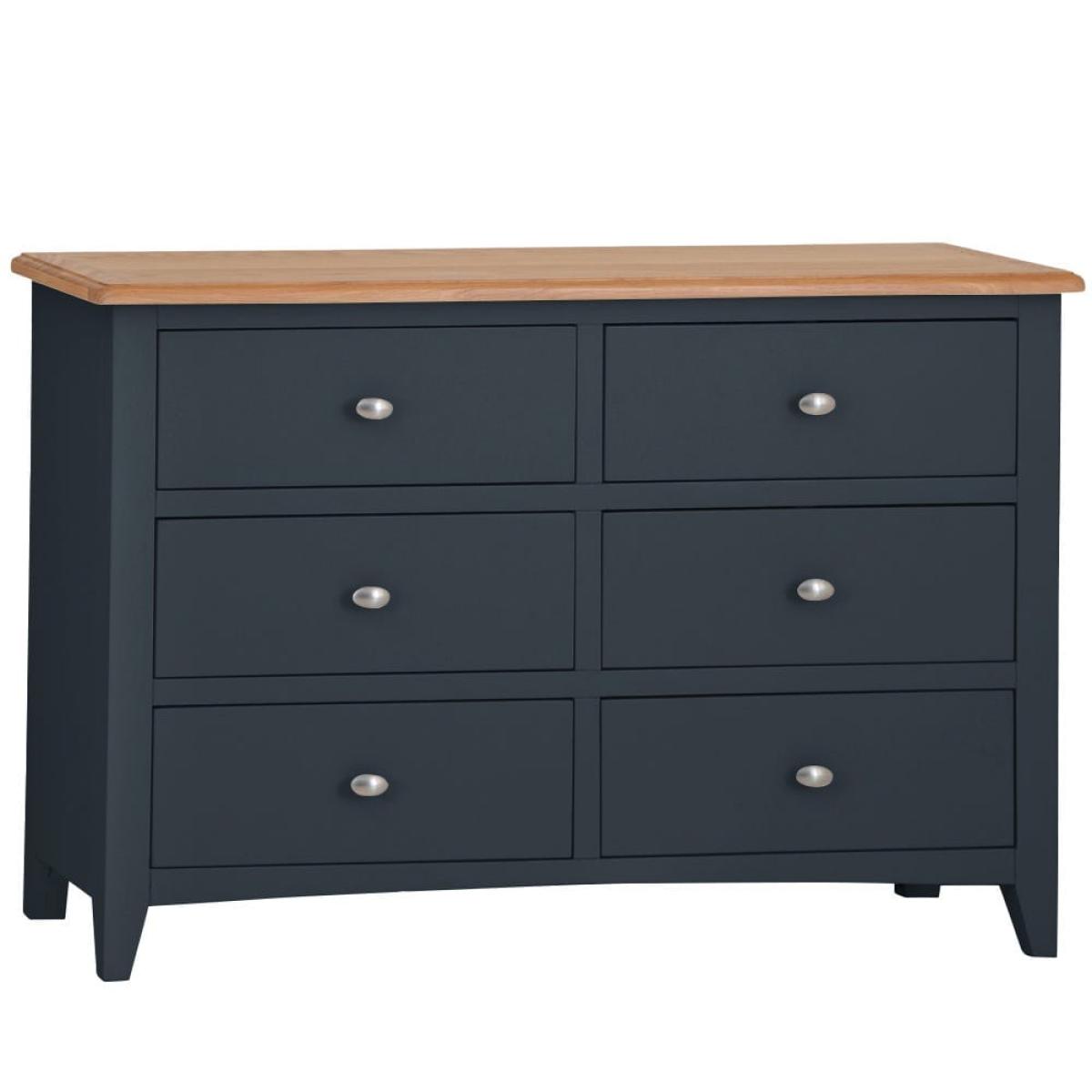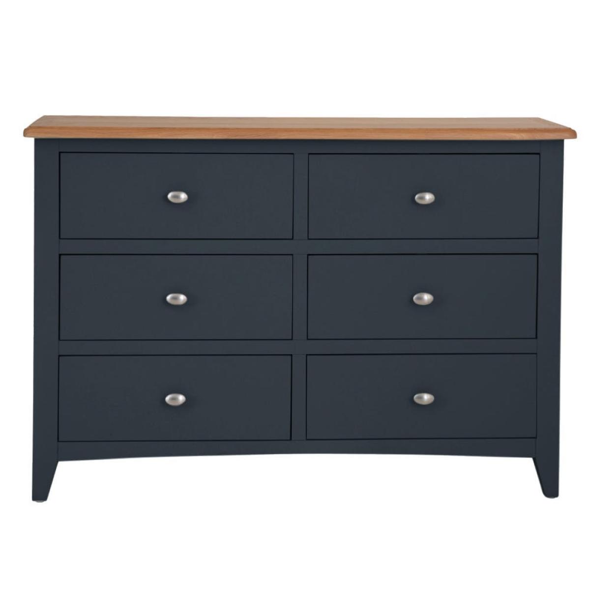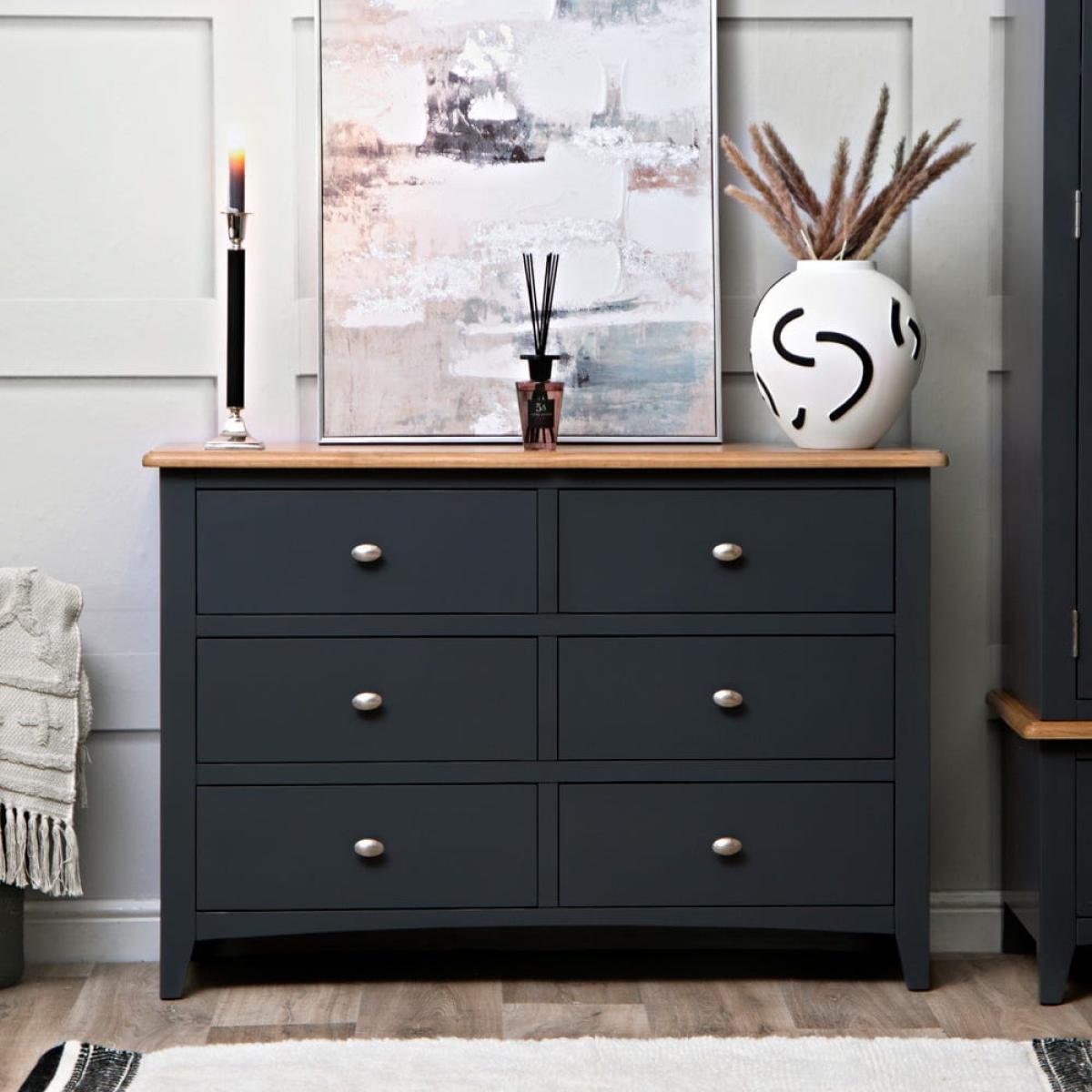 Bring a sense of summer into your bedroom by placing a vase of fresh flowers on your new Gloucester midnight grey painted chest of 6 drawers. Bright blooms will contrast with this piece’s dark grey finish, particularly with the deep blue undertones that allow these drawers to blend into a range of bedroom colour schemes. A solid wood construction, sleek tapered legs and brushed metal handles also add sophistication to your space. This item consists of six roomy drawers that can store summer tops or winter cover-ups - just the thing for when the weather is between seasons.