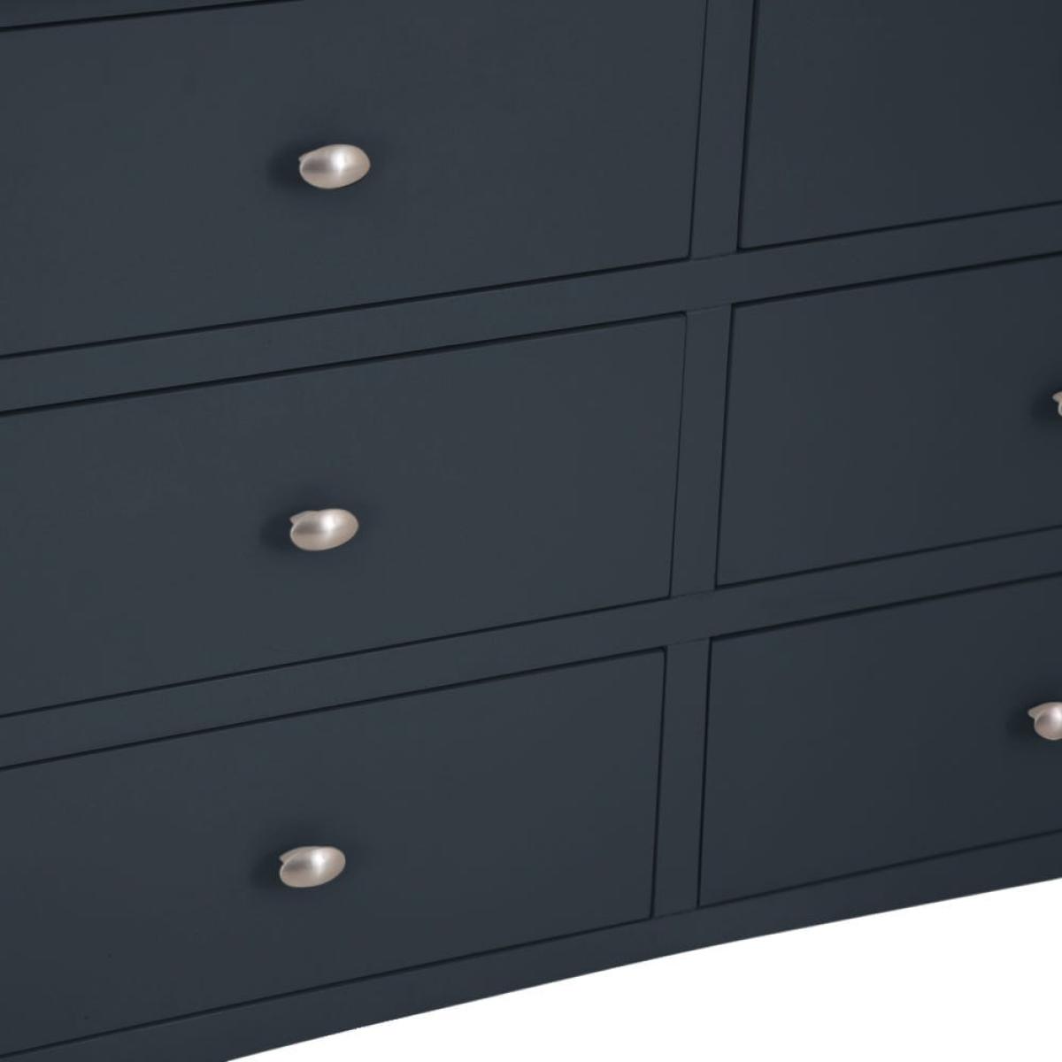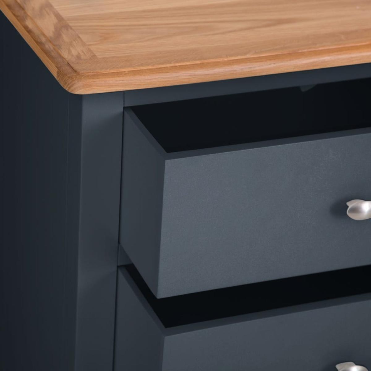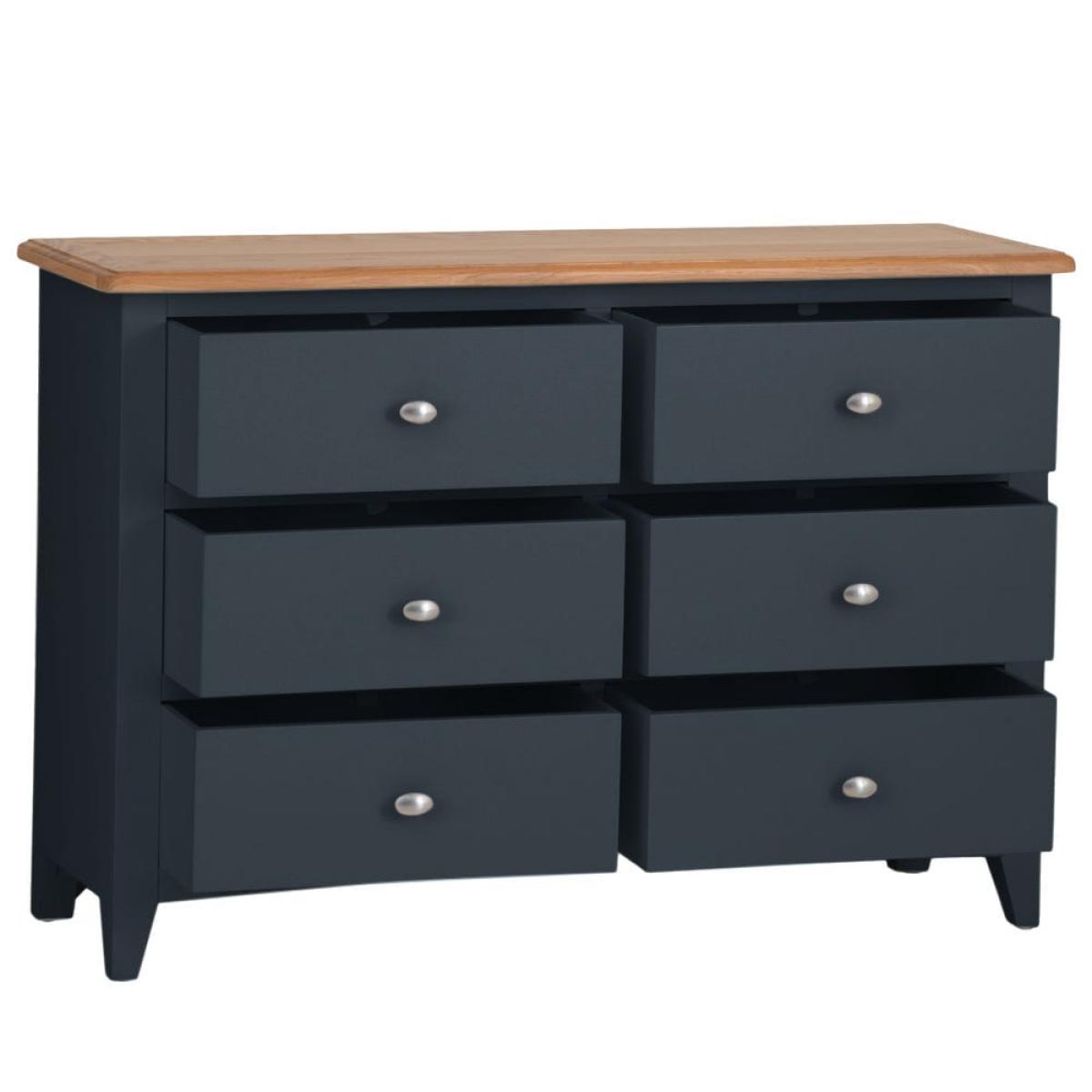 Bring a sense of summer into your bedroom by placing a vase of fresh flowers on your new Gloucester midnight grey painted chest of 6 drawers. Bright blooms will contrast with this piece’s dark grey finish, particularly with the deep blue undertones that allow these drawers to blend into a range of bedroom colour schemes. A solid wood construction, sleek tapered legs and brushed metal handles also add sophistication to your space. This item consists of six roomy drawers that can store summer tops or winter cover-ups - just the thing for when the weather is between seasons.