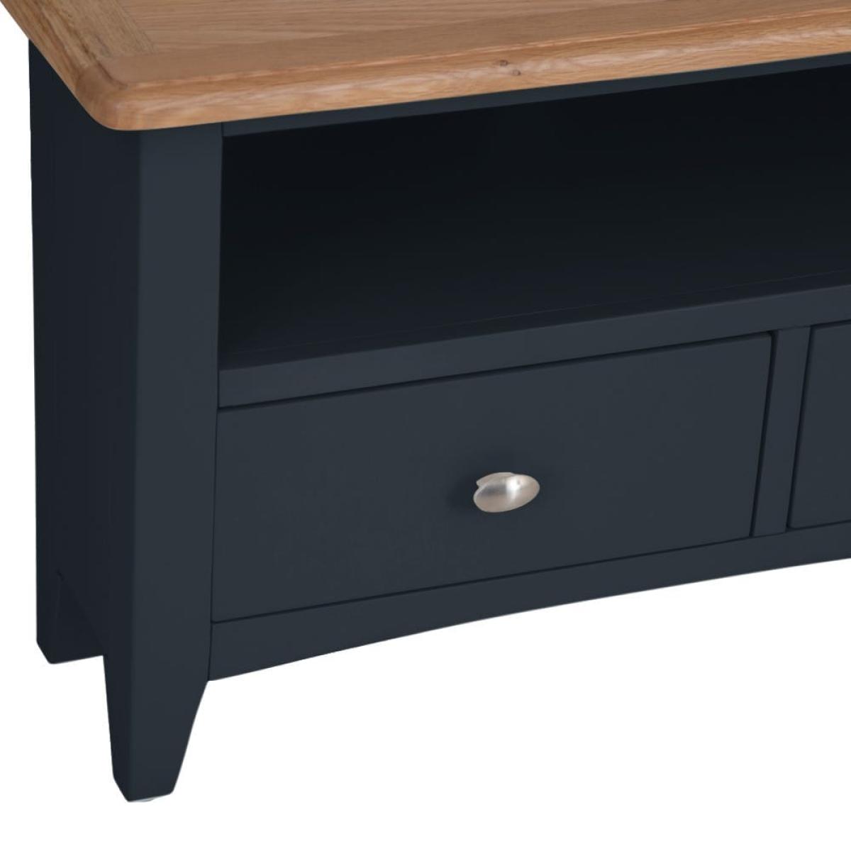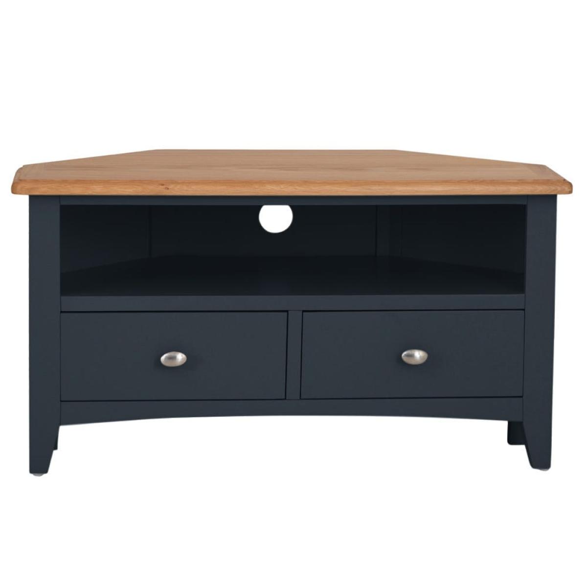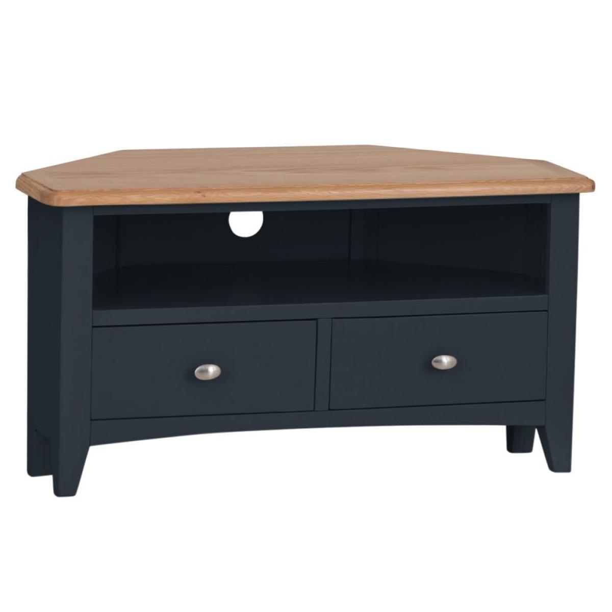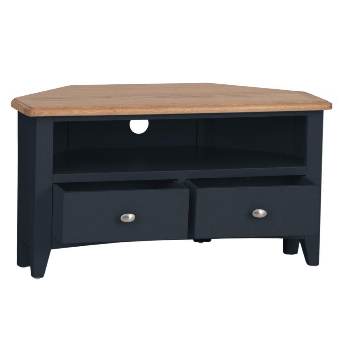 There’s a gang round for a movie night. You’ve got the popcorn and the drinks – you just need a spot for the telly. Enter our Gloucester midnight grey painted corner tv unit. Specially designed to slot into the corner of the room, this unit is also packed with handy features that make it a smart choice. There’s a pre-drilled hole in the back which lets you thread TV, DVD player and console cables through to keep them tidied away. Its open shelf and two drawers have a matches-anything dark grey finish. The top shelf measures 75cm x 40. 7cm and fits your console of choice. Keep the discs and games in the two roomy drawers underneath.