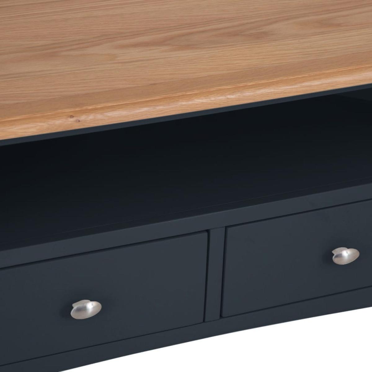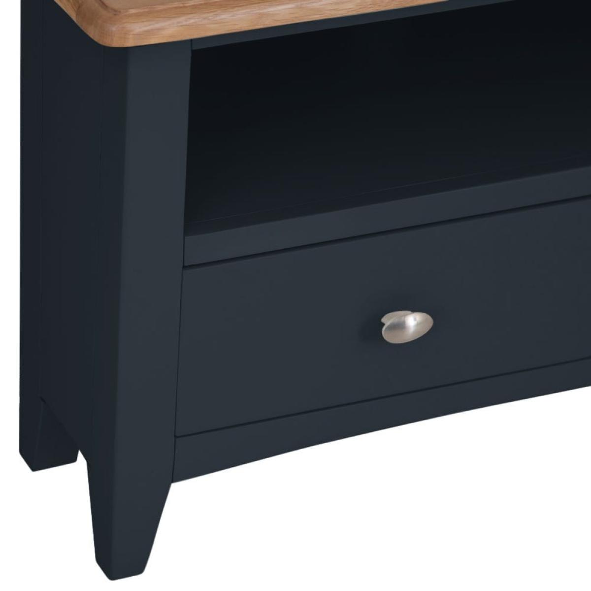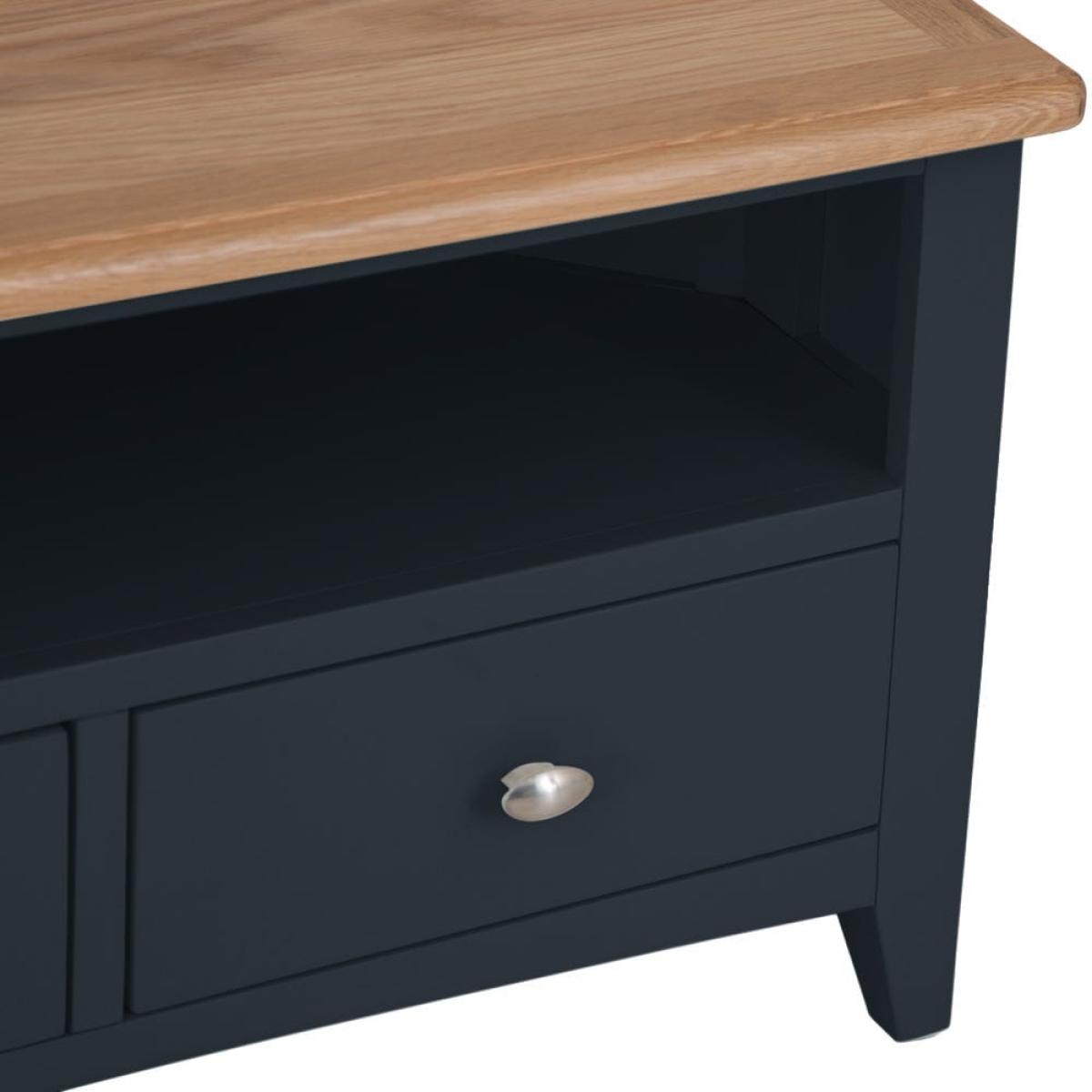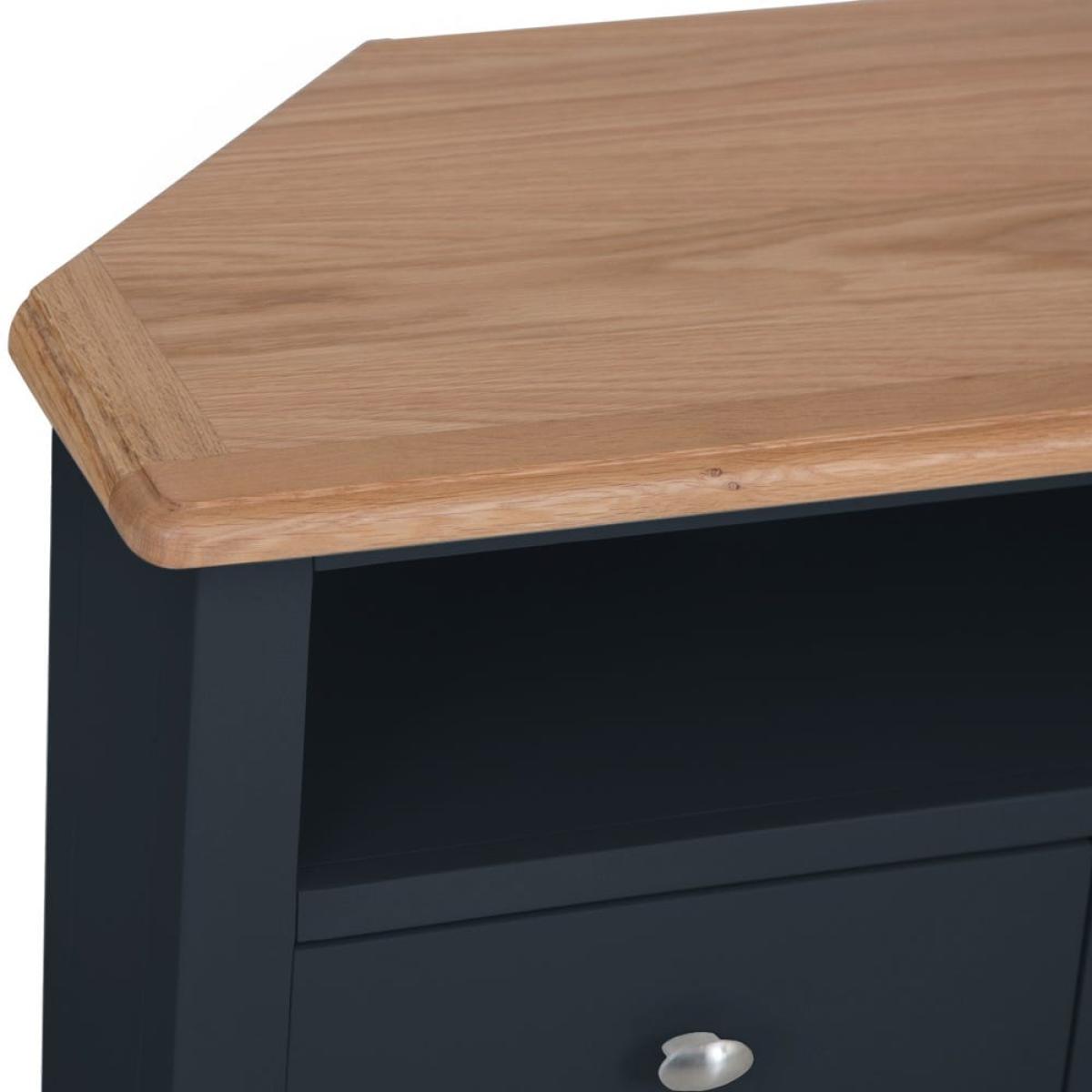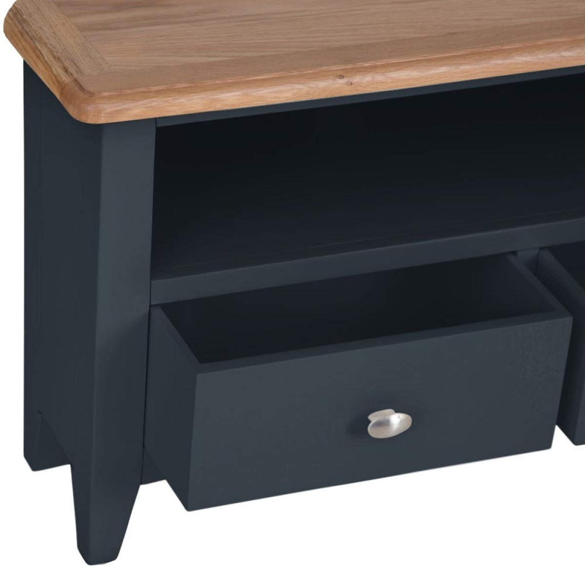 There’s a gang round for a movie night. You’ve got the popcorn and the drinks – you just need a spot for the telly. Enter our Gloucester midnight grey painted corner tv unit. Specially designed to slot into the corner of the room, this unit is also packed with handy features that make it a smart choice. There’s a pre-drilled hole in the back which lets you thread TV, DVD player and console cables through to keep them tidied away. Its open shelf and two drawers have a matches-anything dark grey finish. The top shelf measures 75cm x 40. 7cm and fits your console of choice. Keep the discs and games in the two roomy drawers underneath.