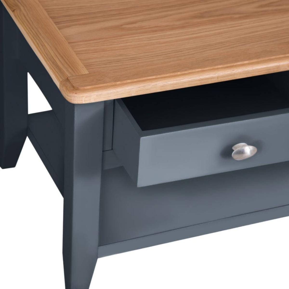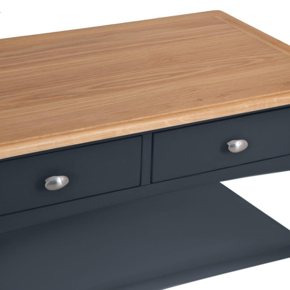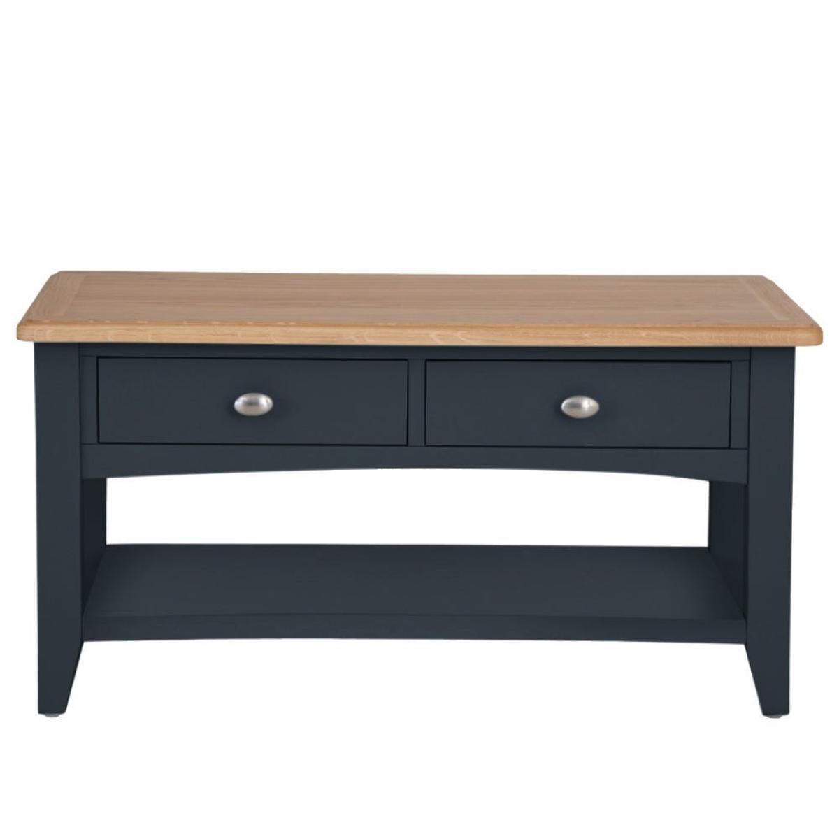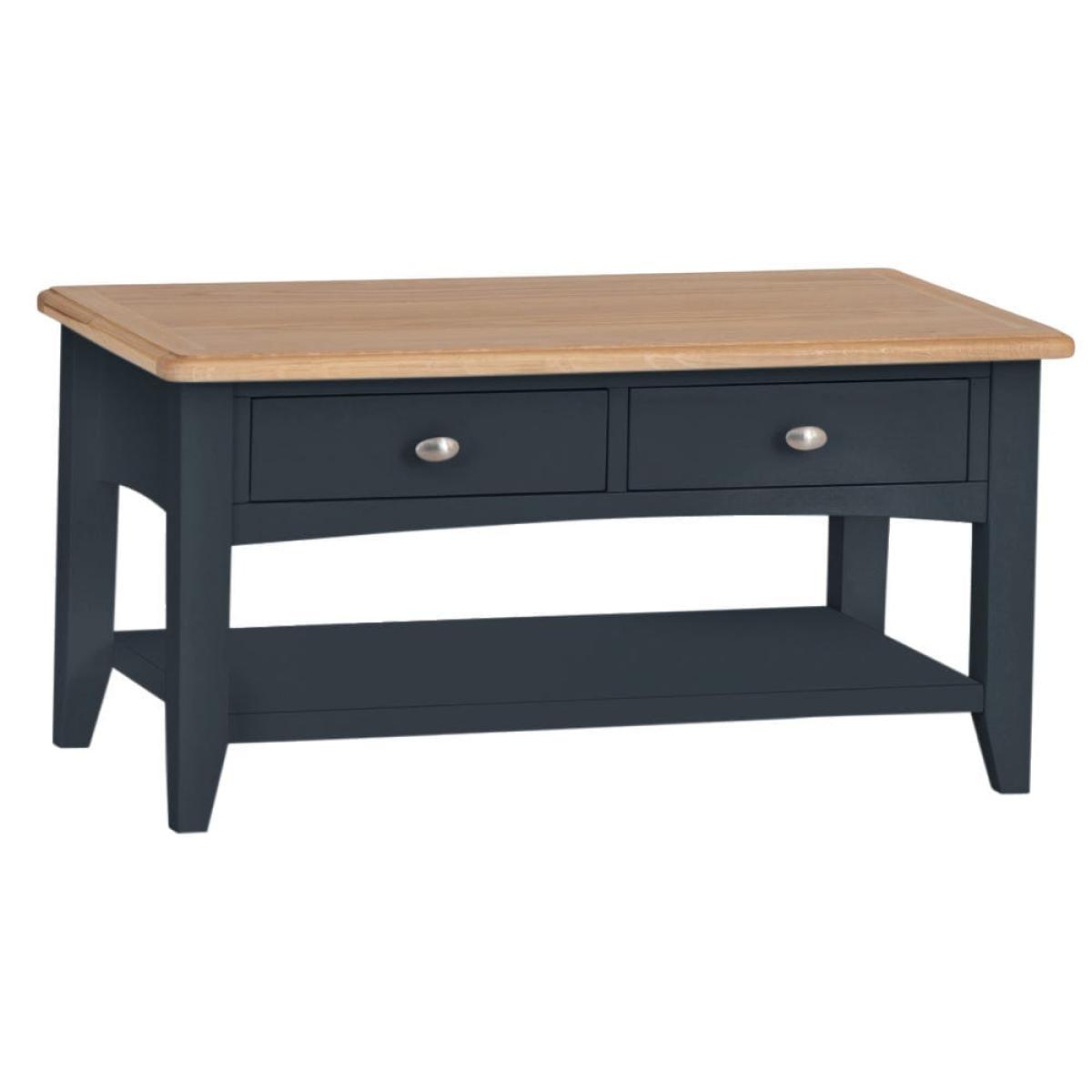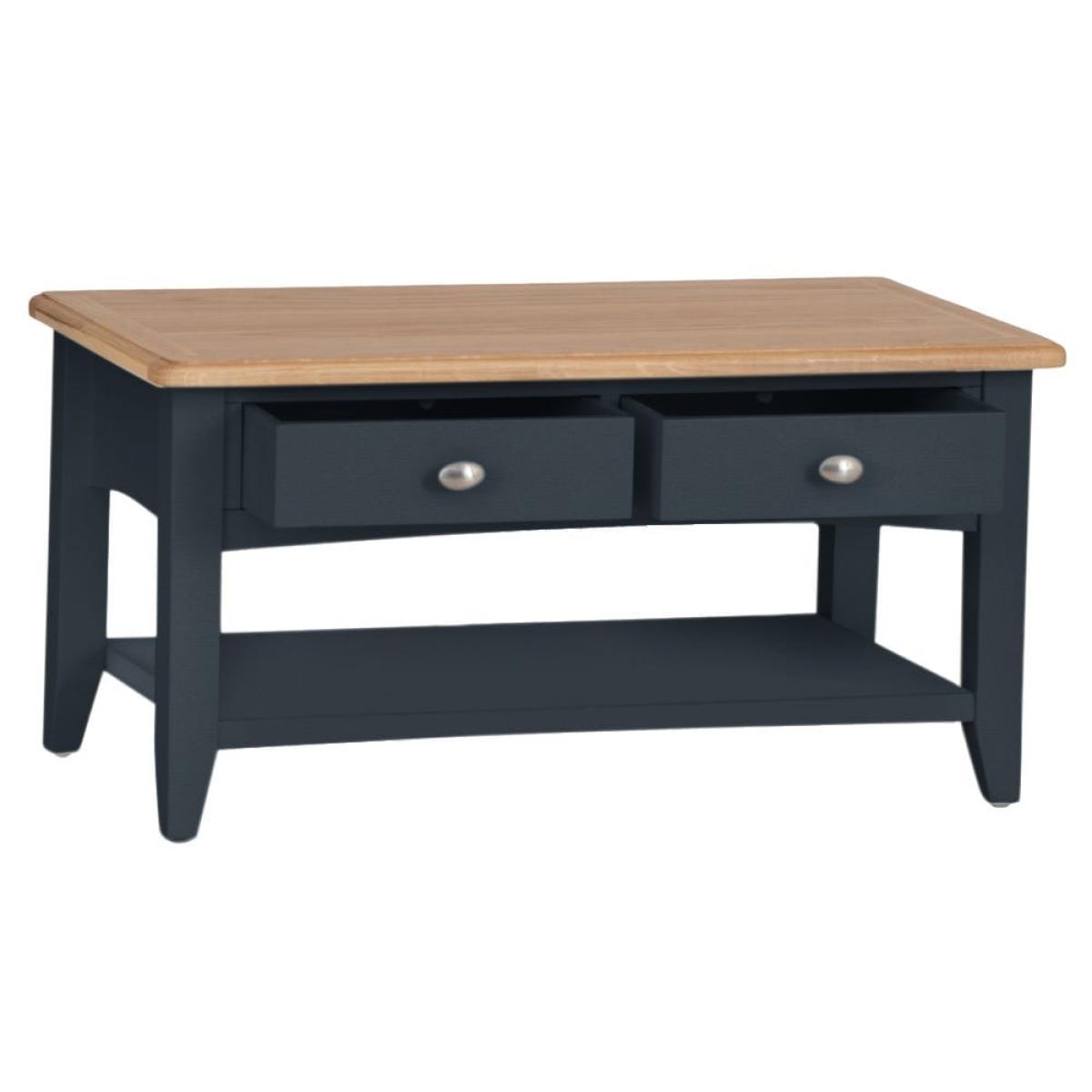 Gather friends for an evening of chat – and a couple of bottles of wine. Your new Gloucester midnight grey painted large coffee table will give everyone a place to pop their glass. Taking pride of place in the centre of your living room, this sturdy wood coffee table is a standout piece of furniture due to its arresting dark grey finish. It’s also a contemporary pick: just note the brushed metal handles and contrasting light wood surface. As well as a surface for tea cups or wine glasses, the table has two storage drawers. And you can keep your coffee-table books on show on the handy shelf.
