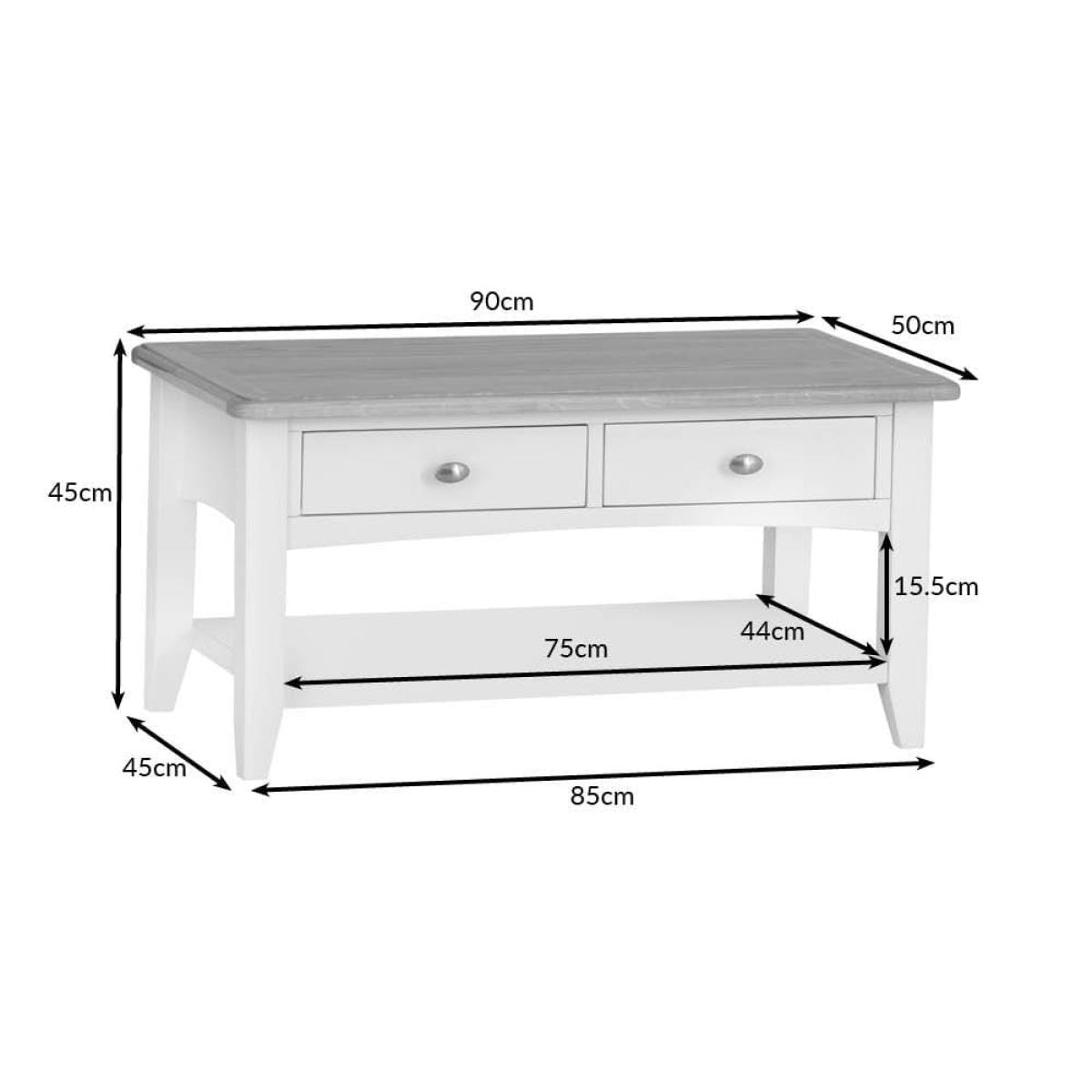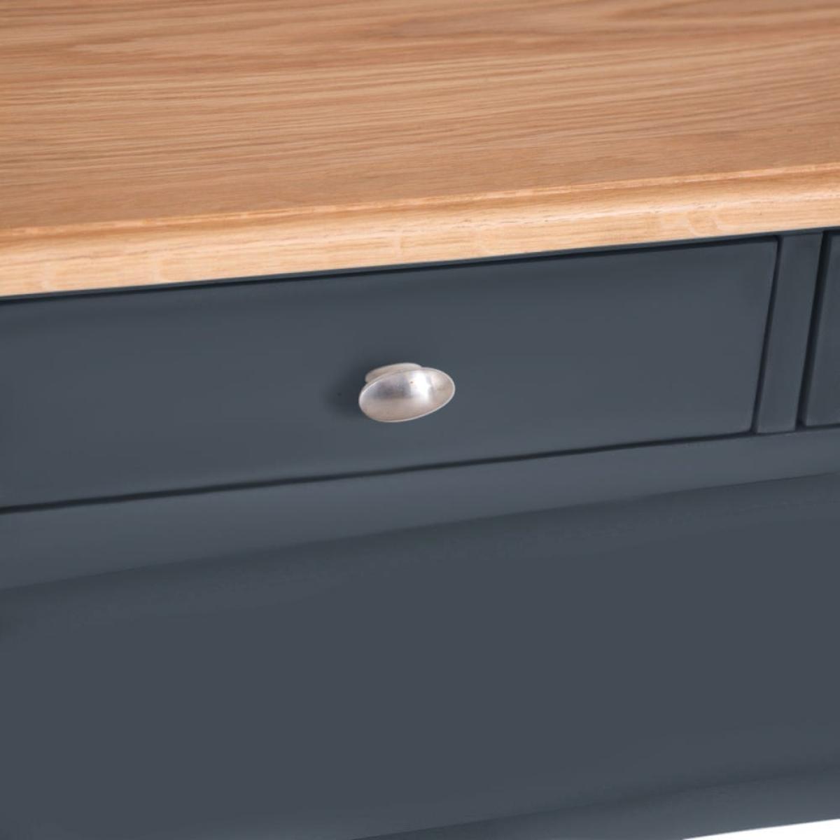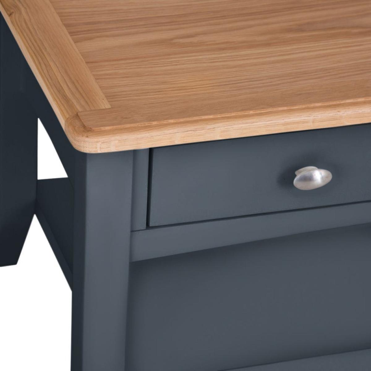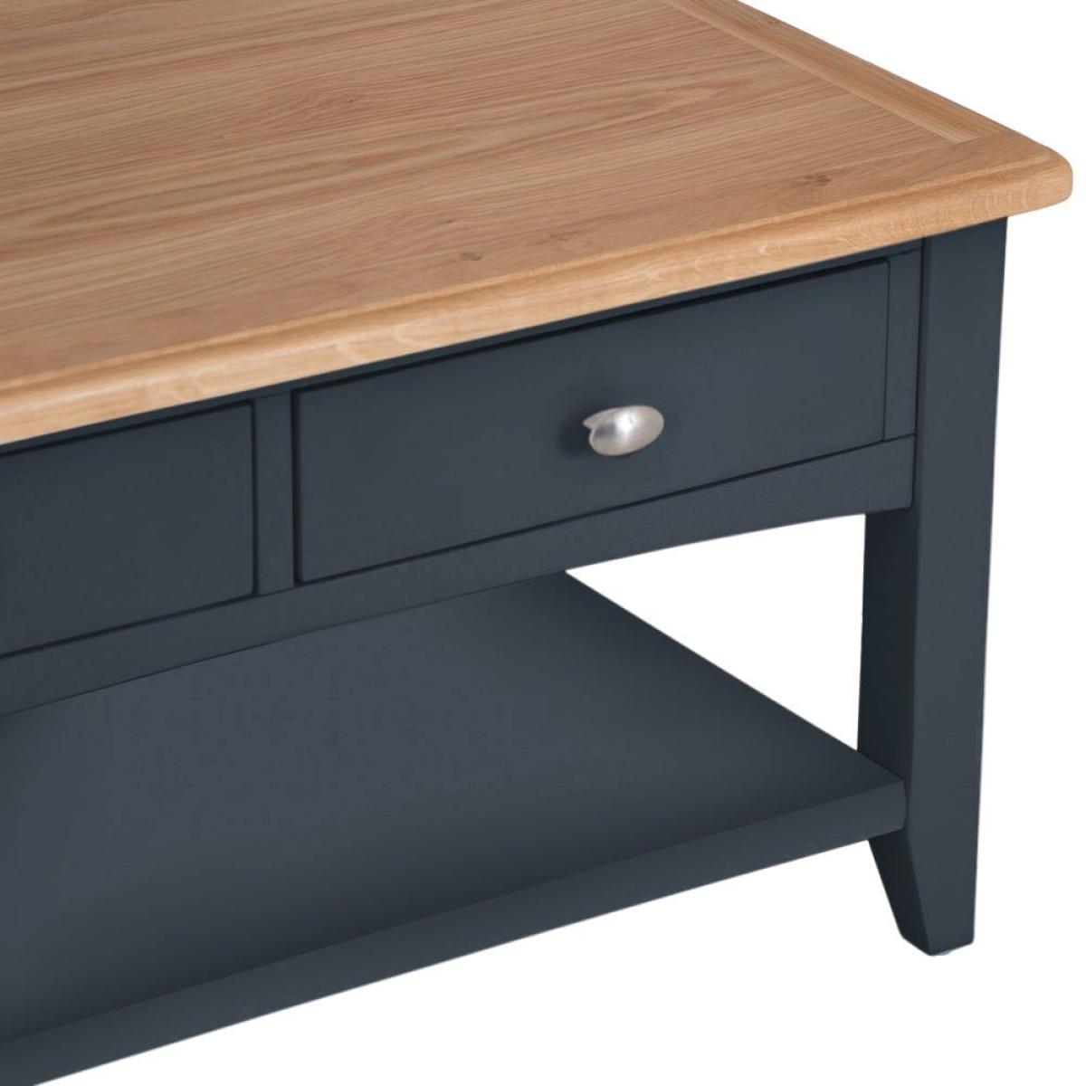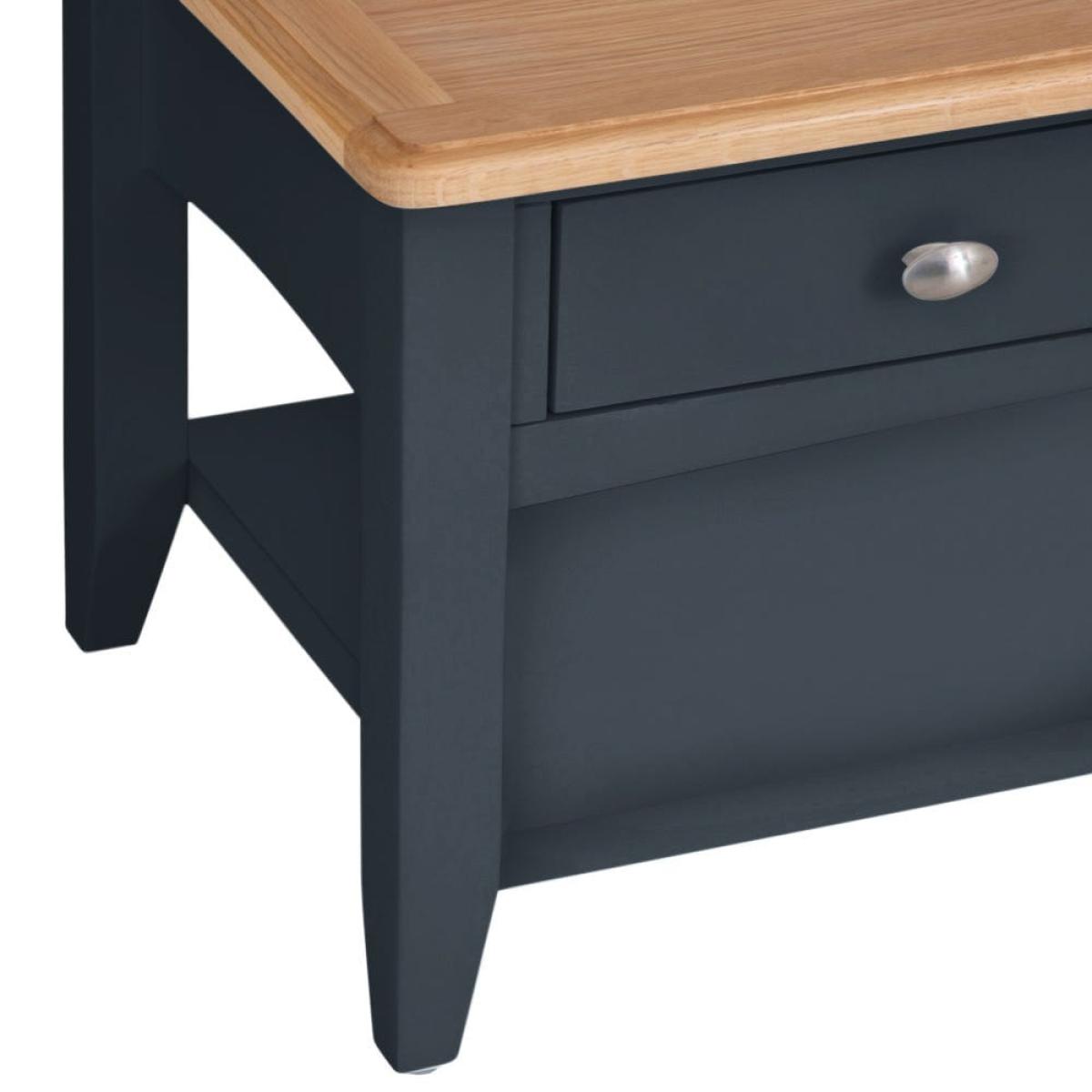 Gather friends for an evening of chat – and a couple of bottles of wine. Your new Gloucester midnight grey painted large coffee table will give everyone a place to pop their glass. Taking pride of place in the centre of your living room, this sturdy wood coffee table is a standout piece of furniture due to its arresting dark grey finish. It’s also a contemporary pick: just note the brushed metal handles and contrasting light wood surface. As well as a surface for tea cups or wine glasses, the table has two storage drawers. And you can keep your coffee-table books on show on the handy shelf.
