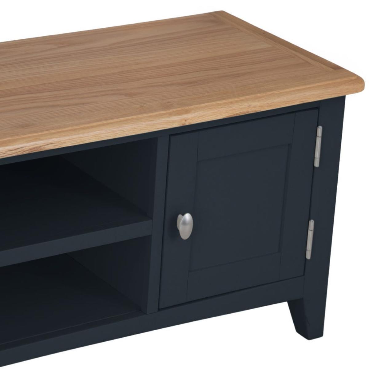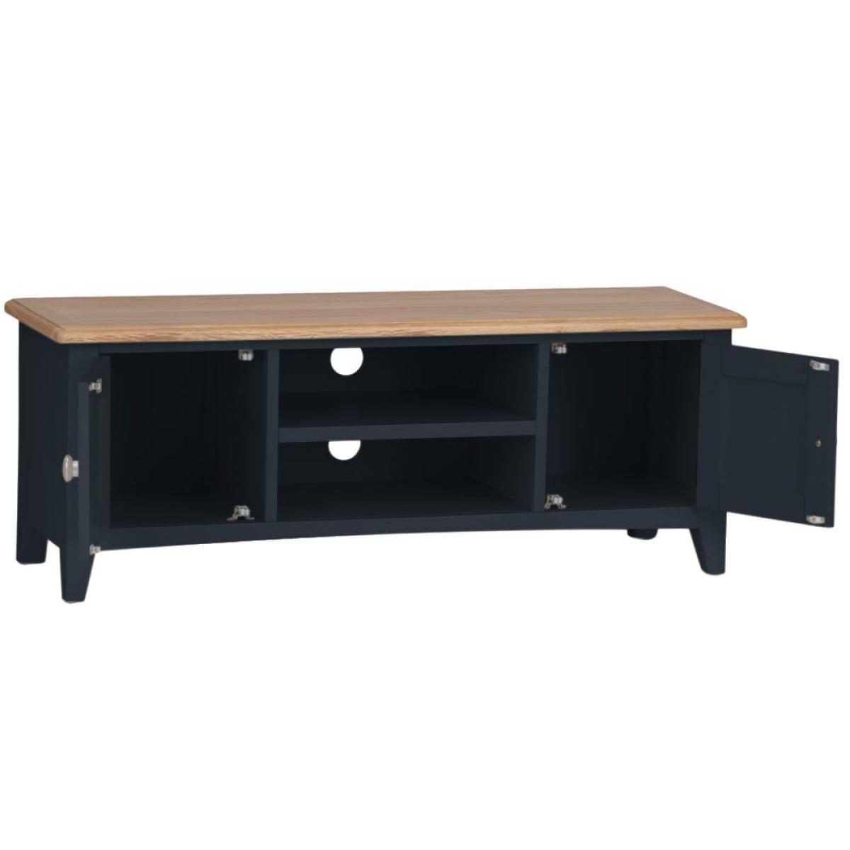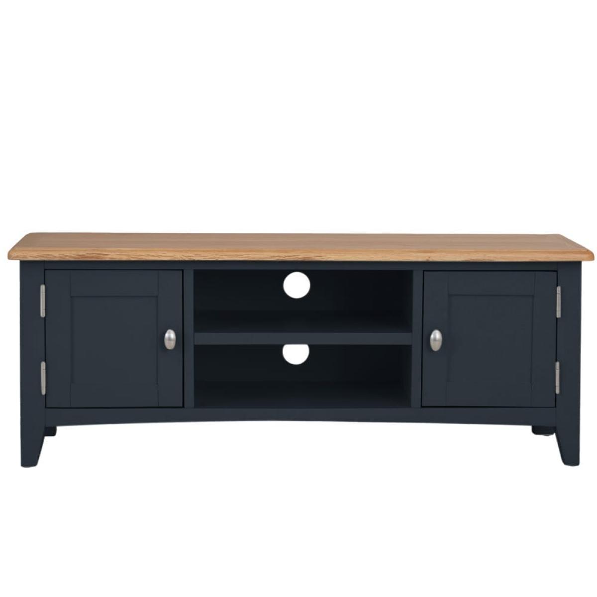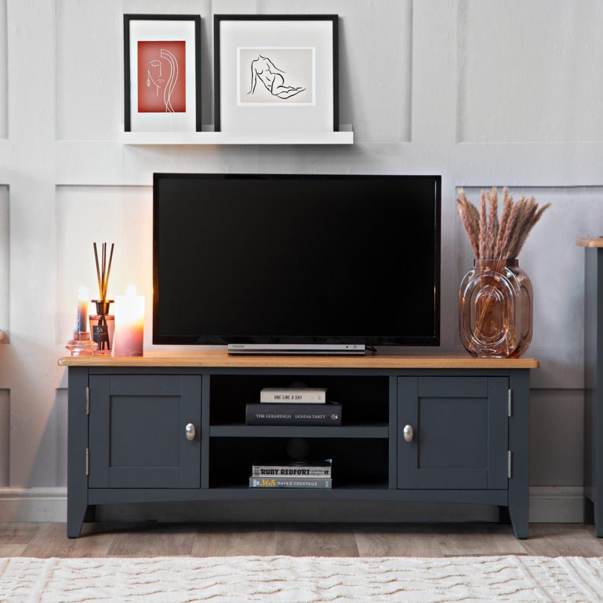 Settle down for an evening of your favourite shows safe in the knowledge your TV’s safe on one of our Gloucester midnight grey painted large TV units. Its solid wooden frame means it’s a long-lasting investment, and it’ll survive being moved from room to room if you decide to switch up your dens. This piece will bring modern style to whatever space you choose, with its dark grey finish and brushed metal details. There are plenty of spots to store DVDs and games, including two open shelves (that come with handy pre-drill holes for cables) and two roomy one-door cupboards.