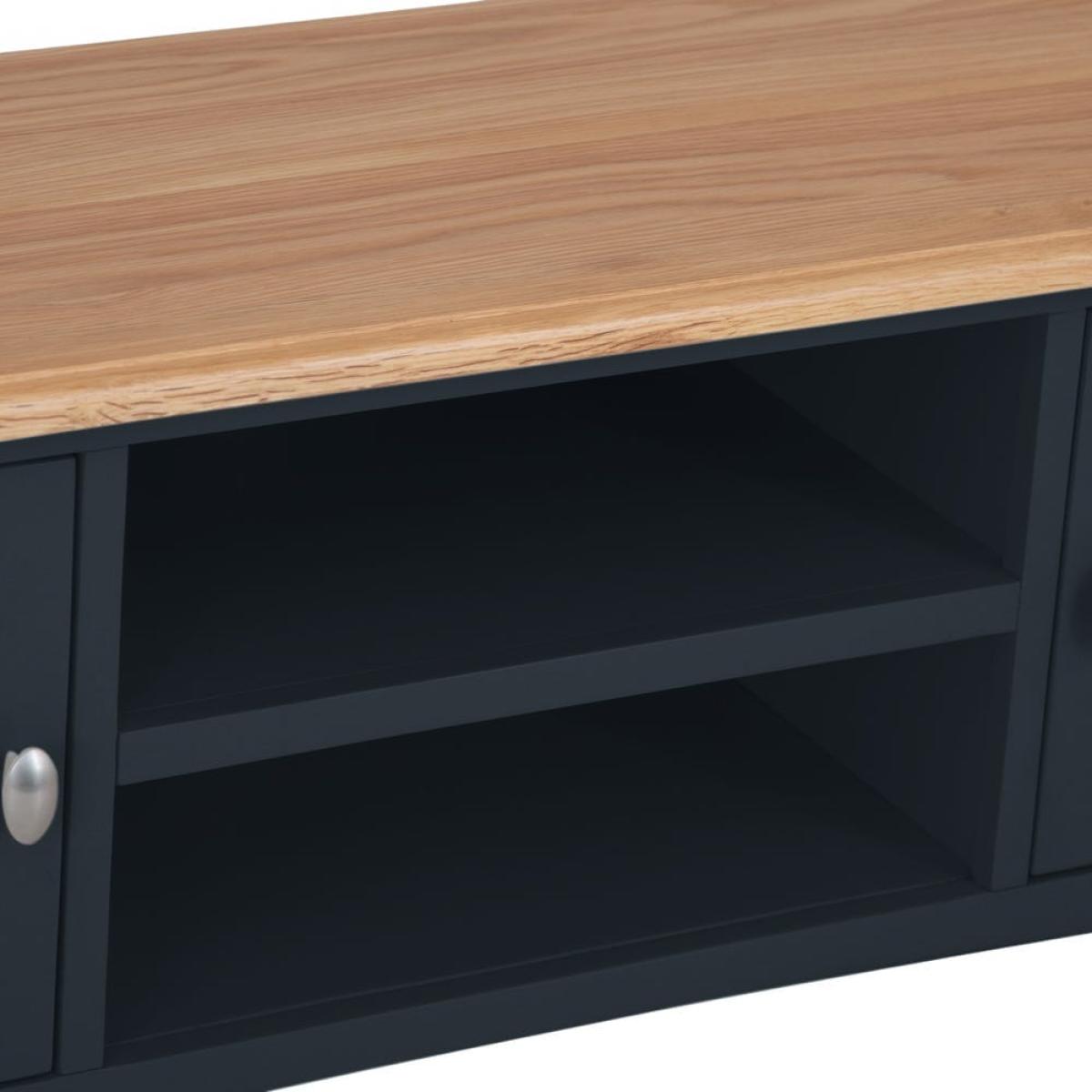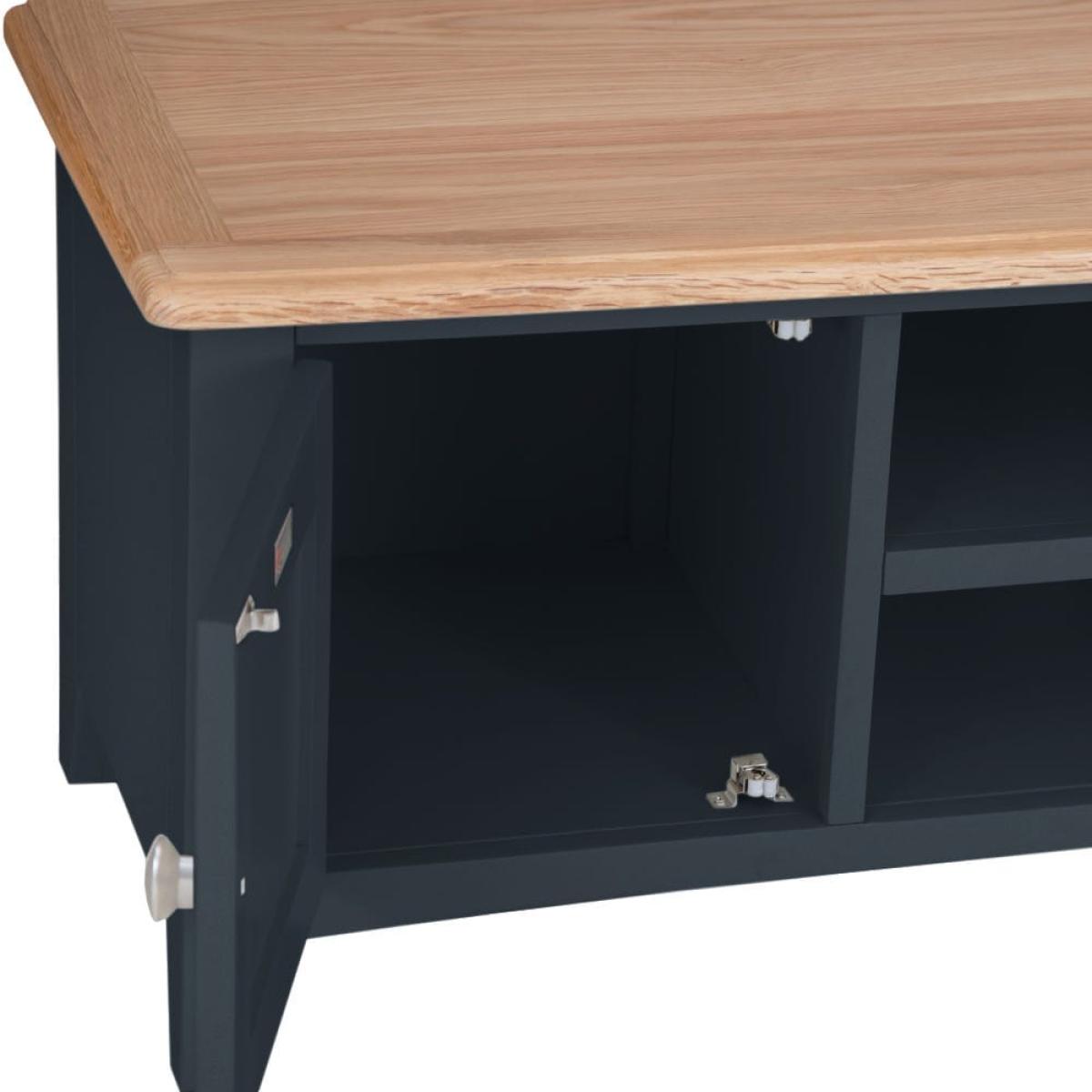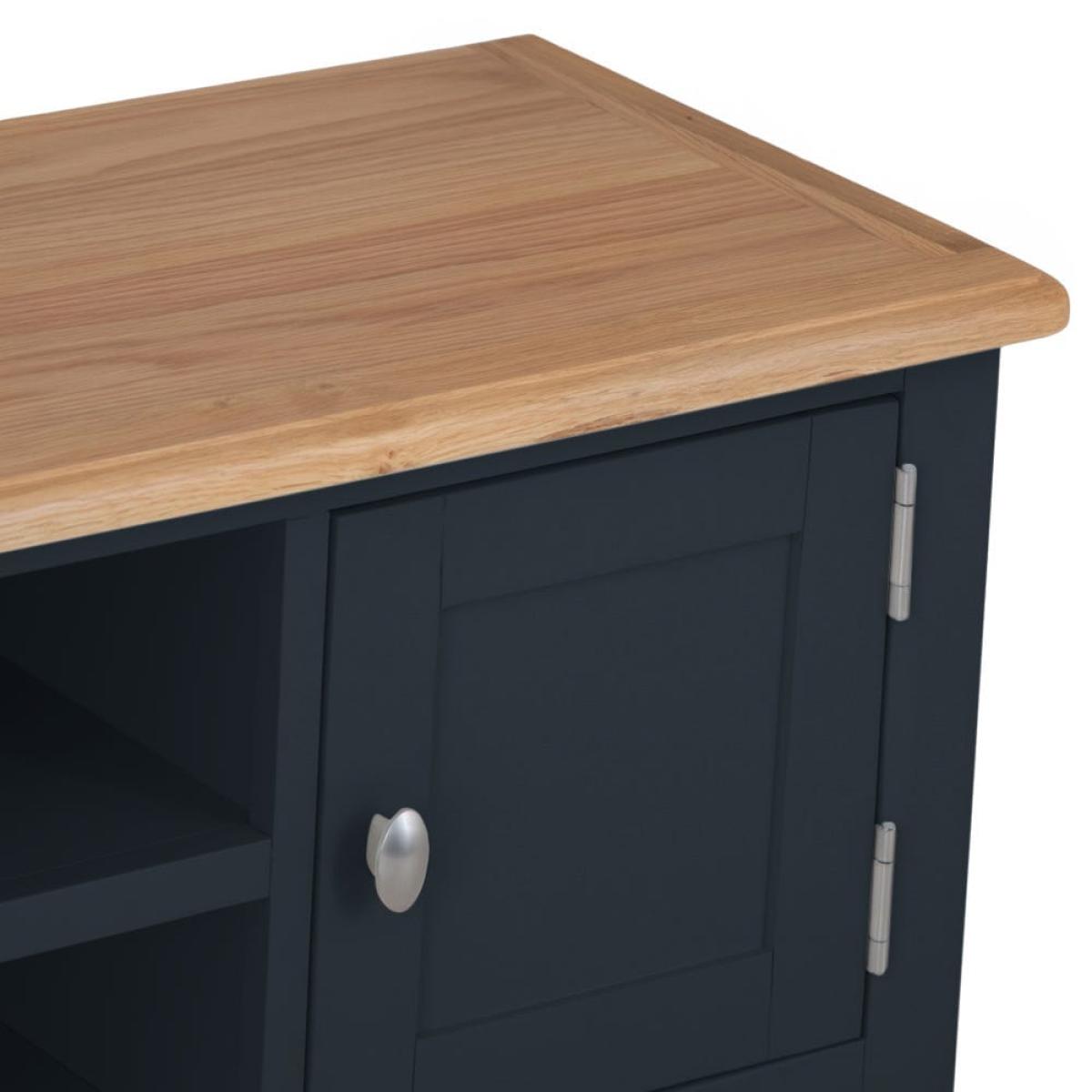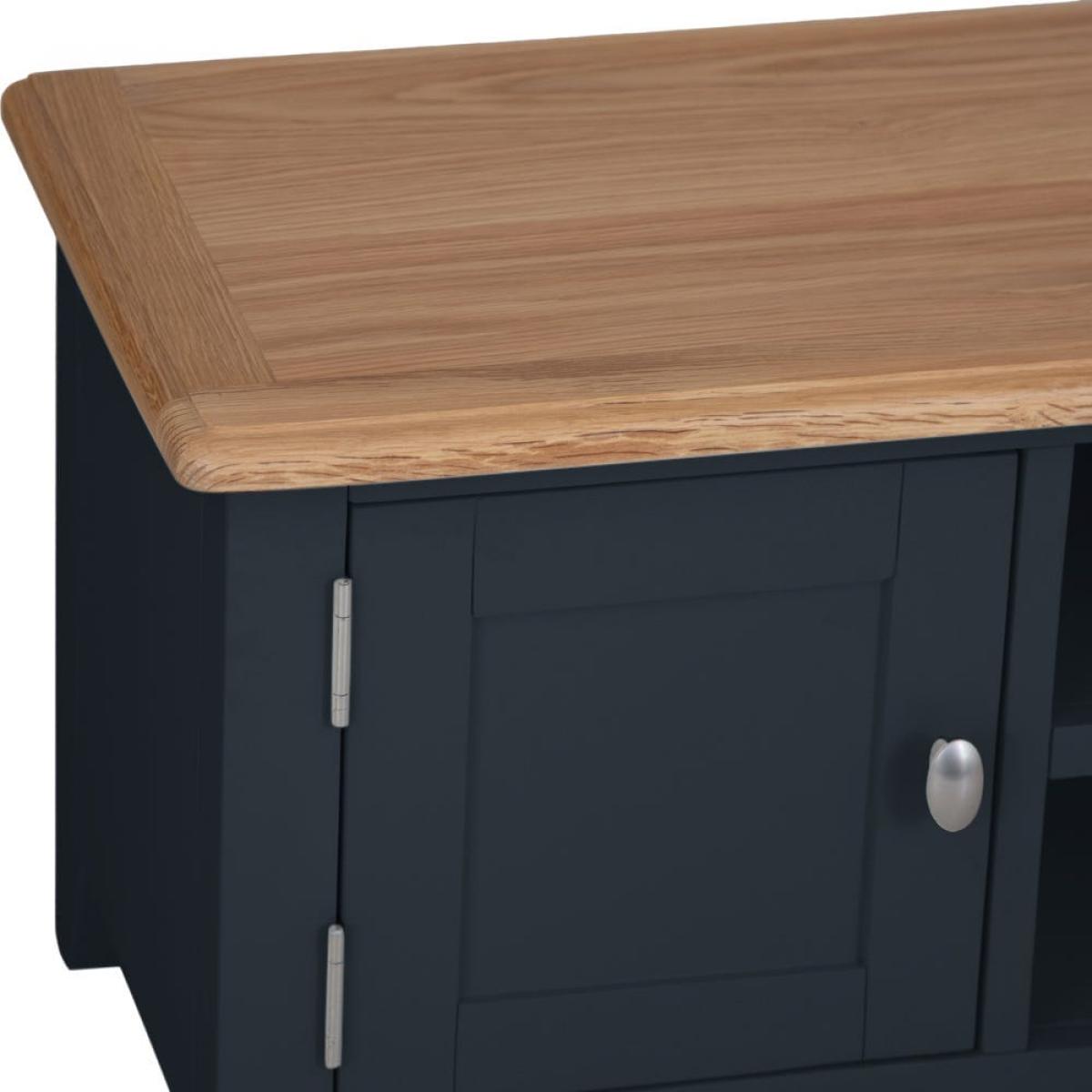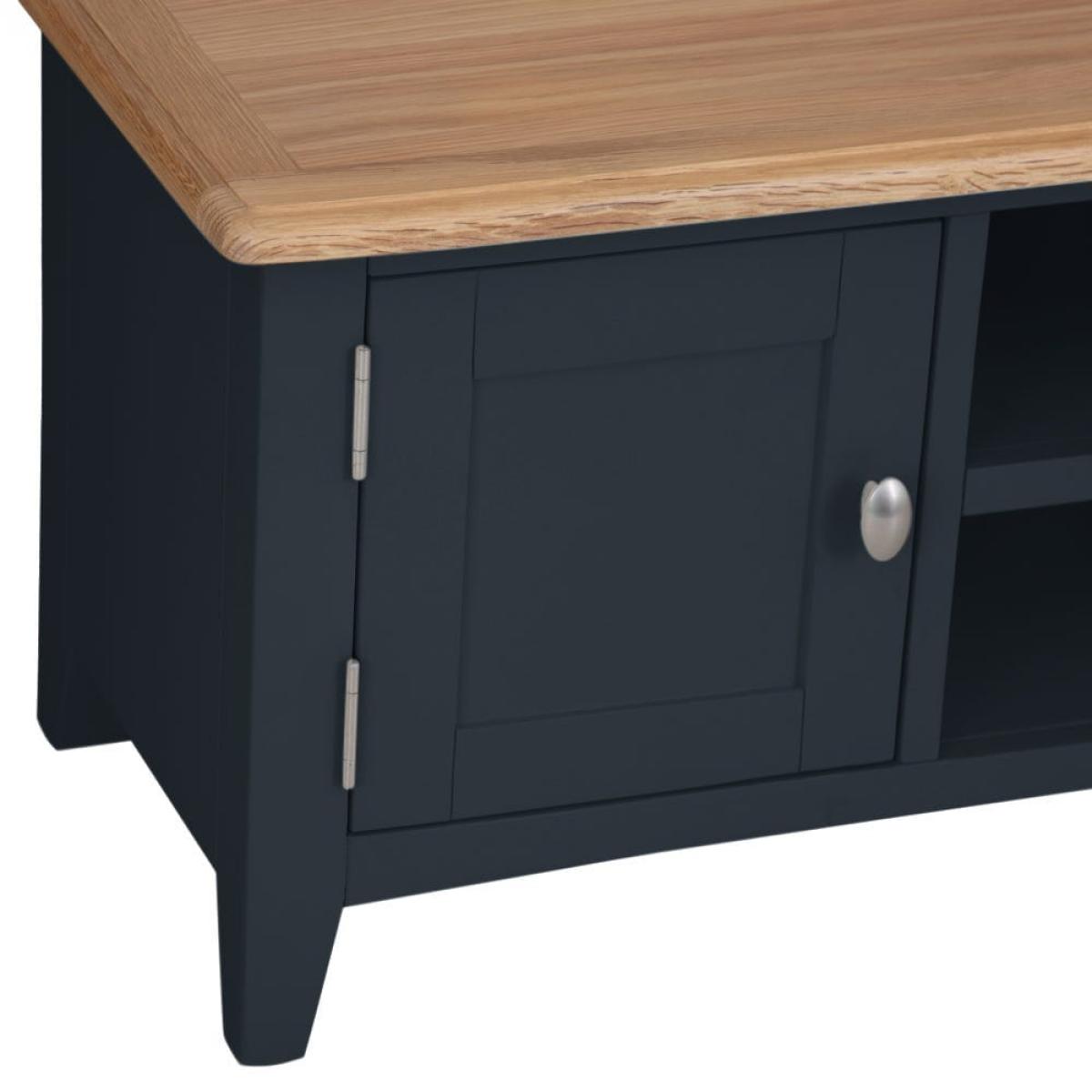 Settle down for an evening of your favourite shows safe in the knowledge your TV’s safe on one of our Gloucester midnight grey painted large TV units. Its solid wooden frame means it’s a long-lasting investment, and it’ll survive being moved from room to room if you decide to switch up your dens. This piece will bring modern style to whatever space you choose, with its dark grey finish and brushed metal details. There are plenty of spots to store DVDs and games, including two open shelves (that come with handy pre-drill holes for cables) and two roomy one-door cupboards.
