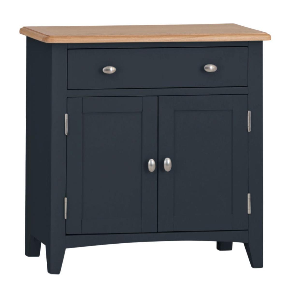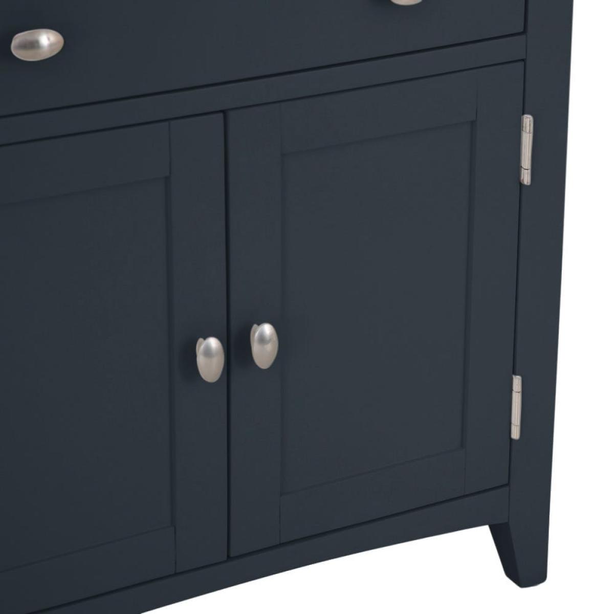 Get your dishes, crockery and glasses under control and tidy – our Gloucester midnight grey painted mini 2 door 1 drawer sideboard will give you a helping hand. A small version of a sideboard, it’ll tuck neatly into your kitchen wherever you have a spare space for storage. In a blue-tinged deep grey, it’s a calming choice, as well as being a modern piece with tapered legs and brushed metal handles. Place knives, forks and spoons into the top drawer – it has plenty of room. You can keep the two-drawer cupboard (which has two shelves) for bowls, plates and wine glasses.