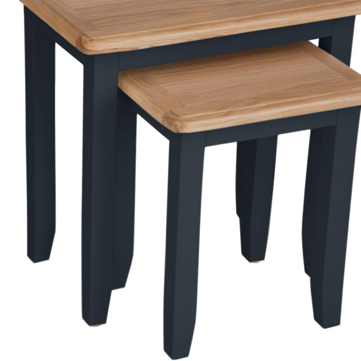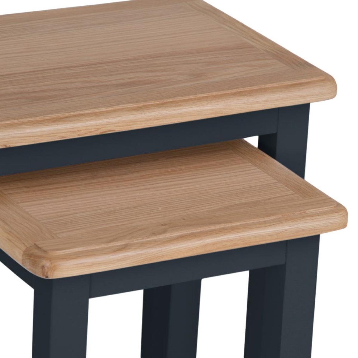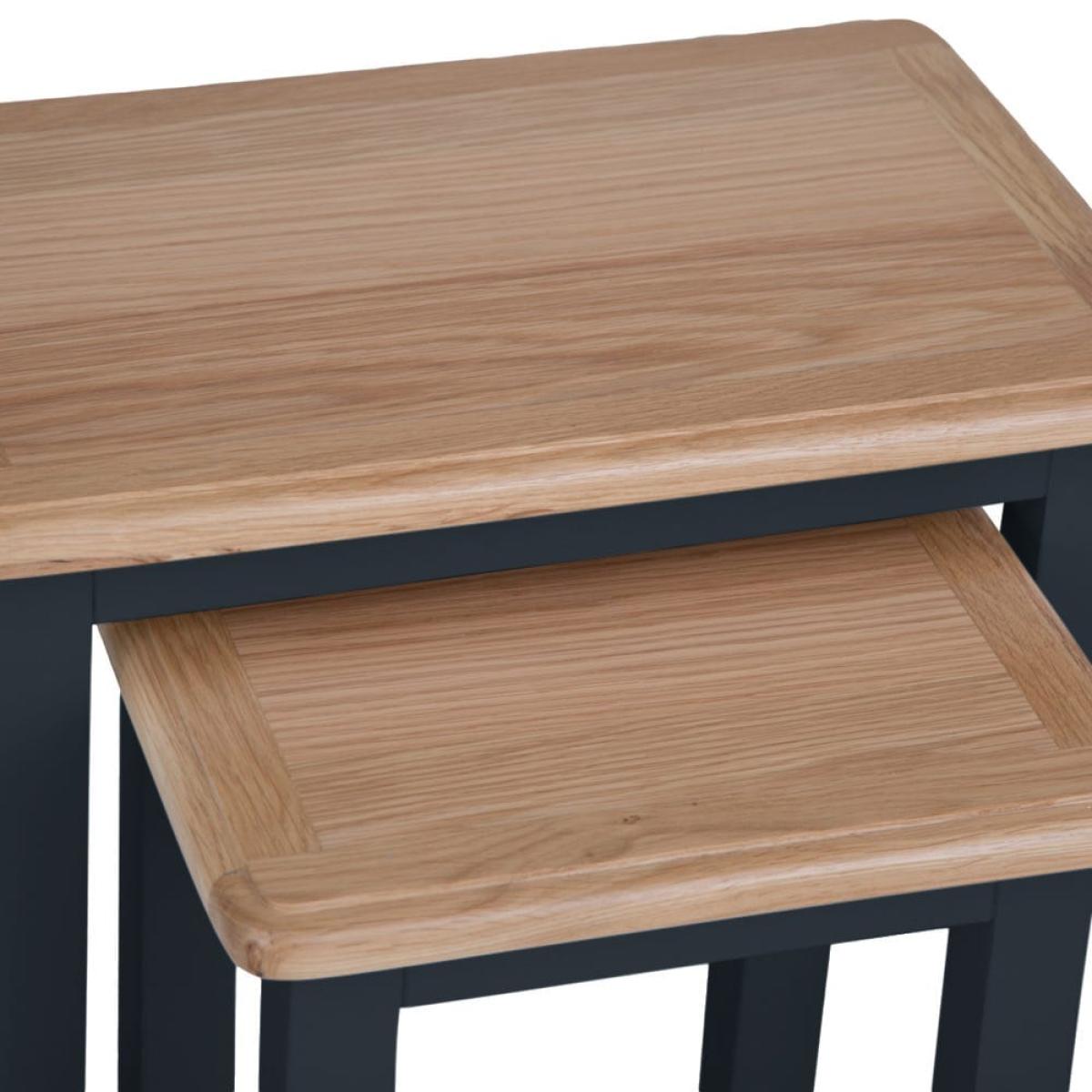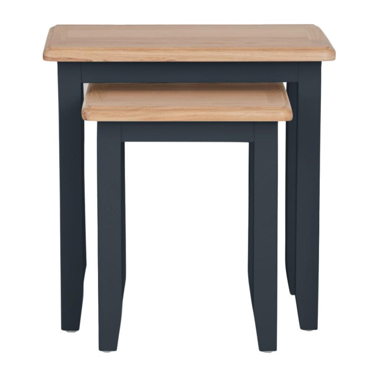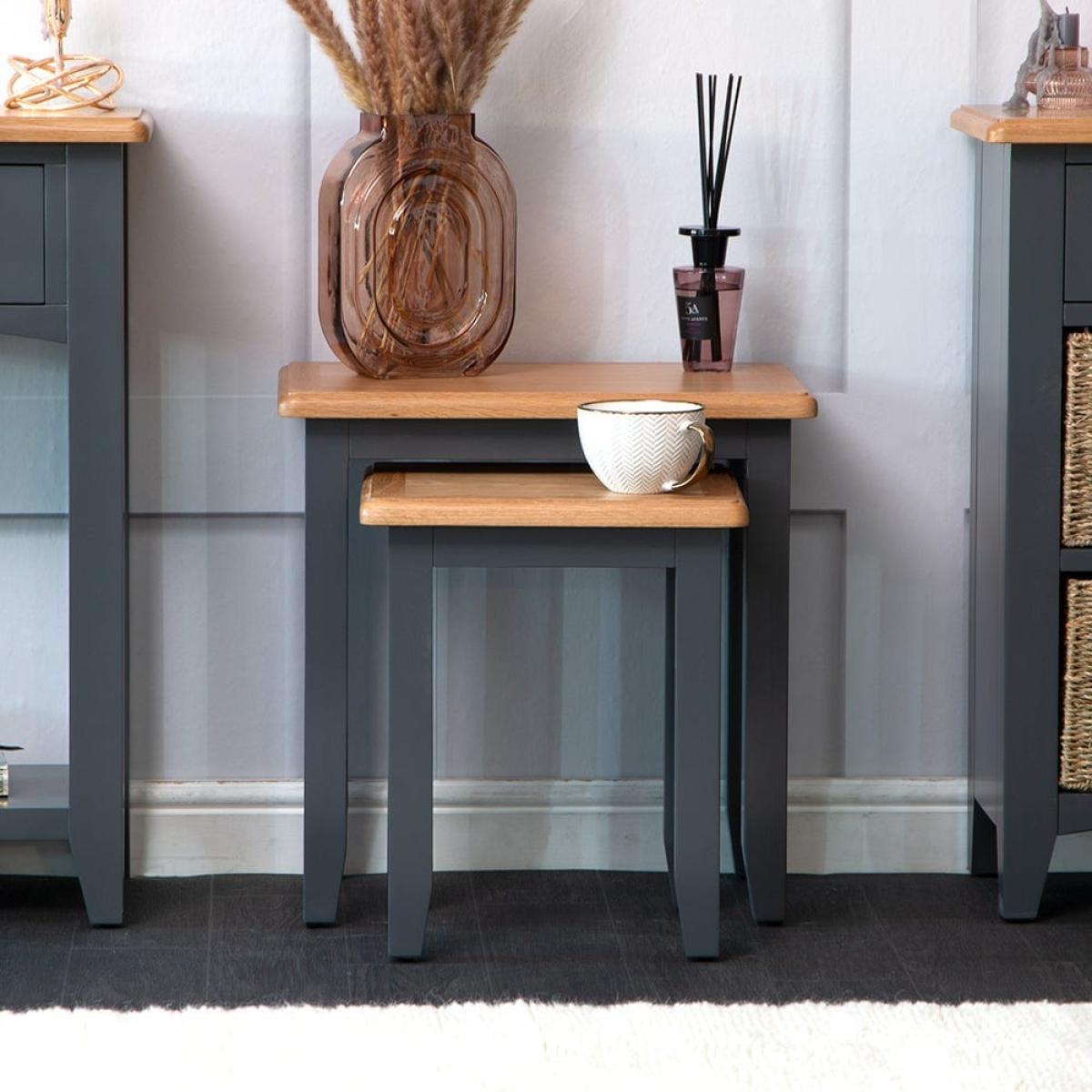 When friends drop by for a catch-up and a cuppa – or perhaps an evening bottle of wine – make sure you have space for their mugs or glasses on our Gloucester midnight grey painted nest of 2 tables. These two tables have strong wood frames topped with light coloured surfaces. Their dark grey painted frames have blue undertones that add a sense of peace to your living room. The larger of the duo measures in at 50cm x 32cm x 50cm, while the smaller one – which can be tucked neatly away underneath – is 35cm x 32cm x 42cm.
